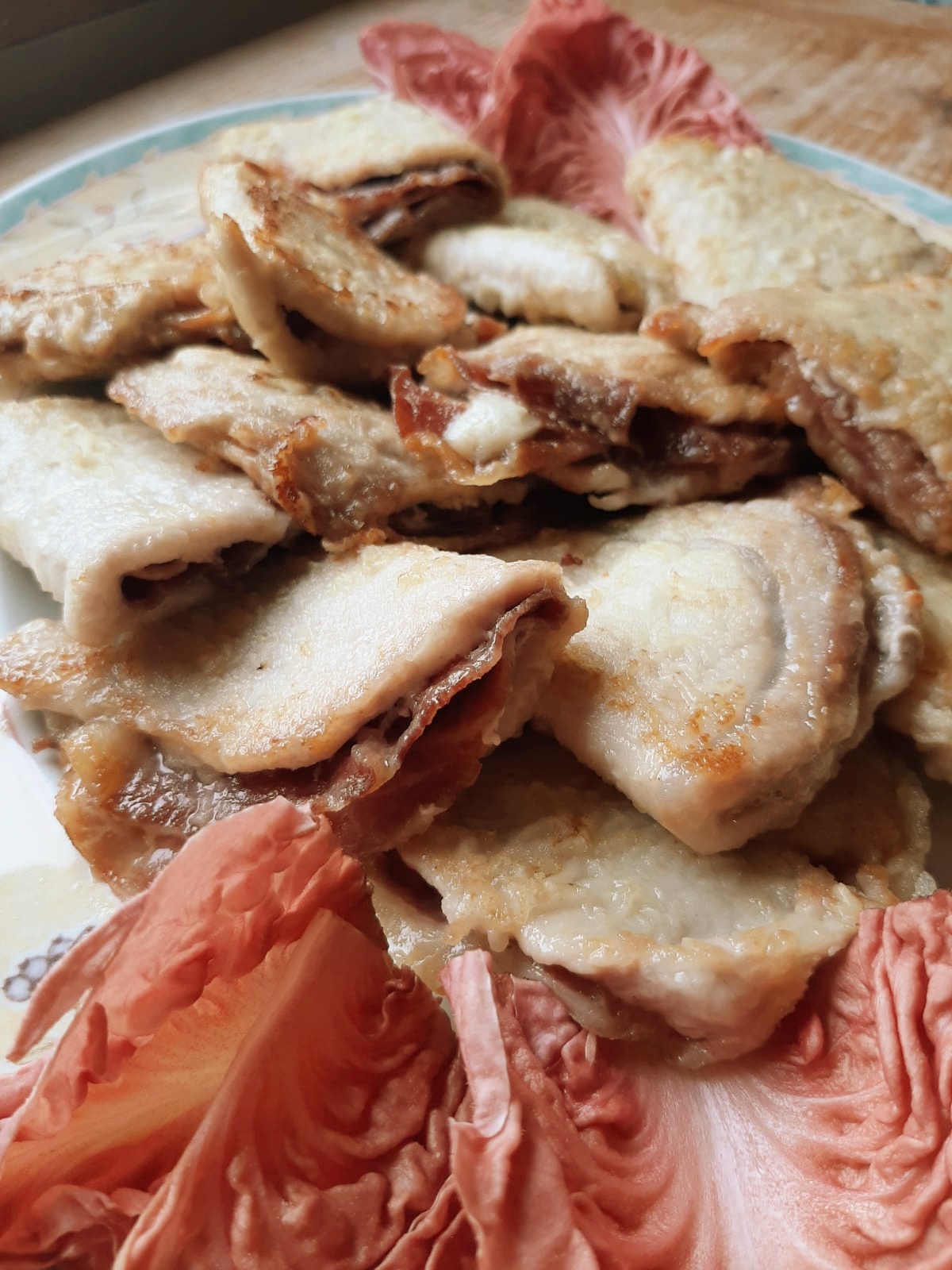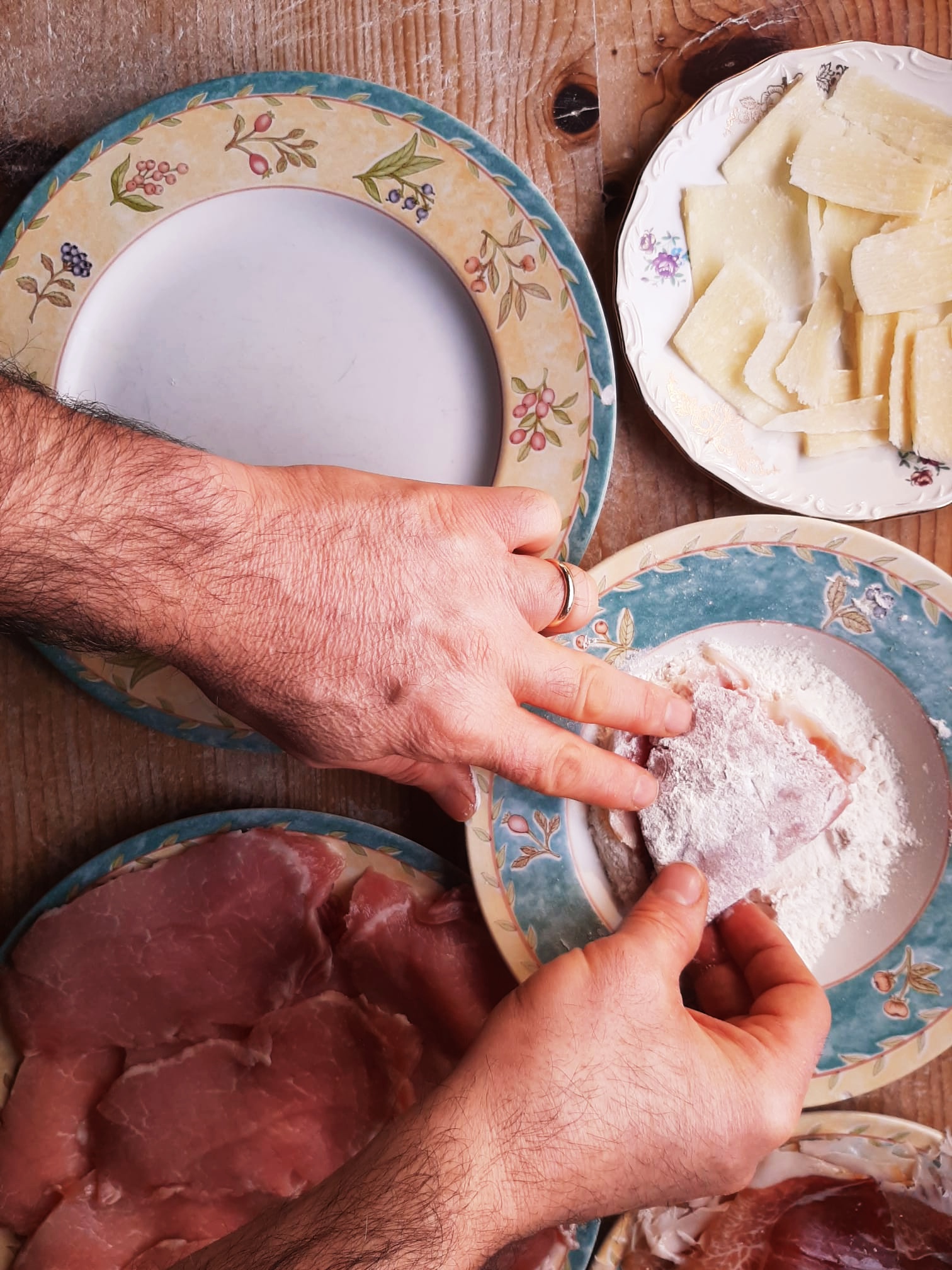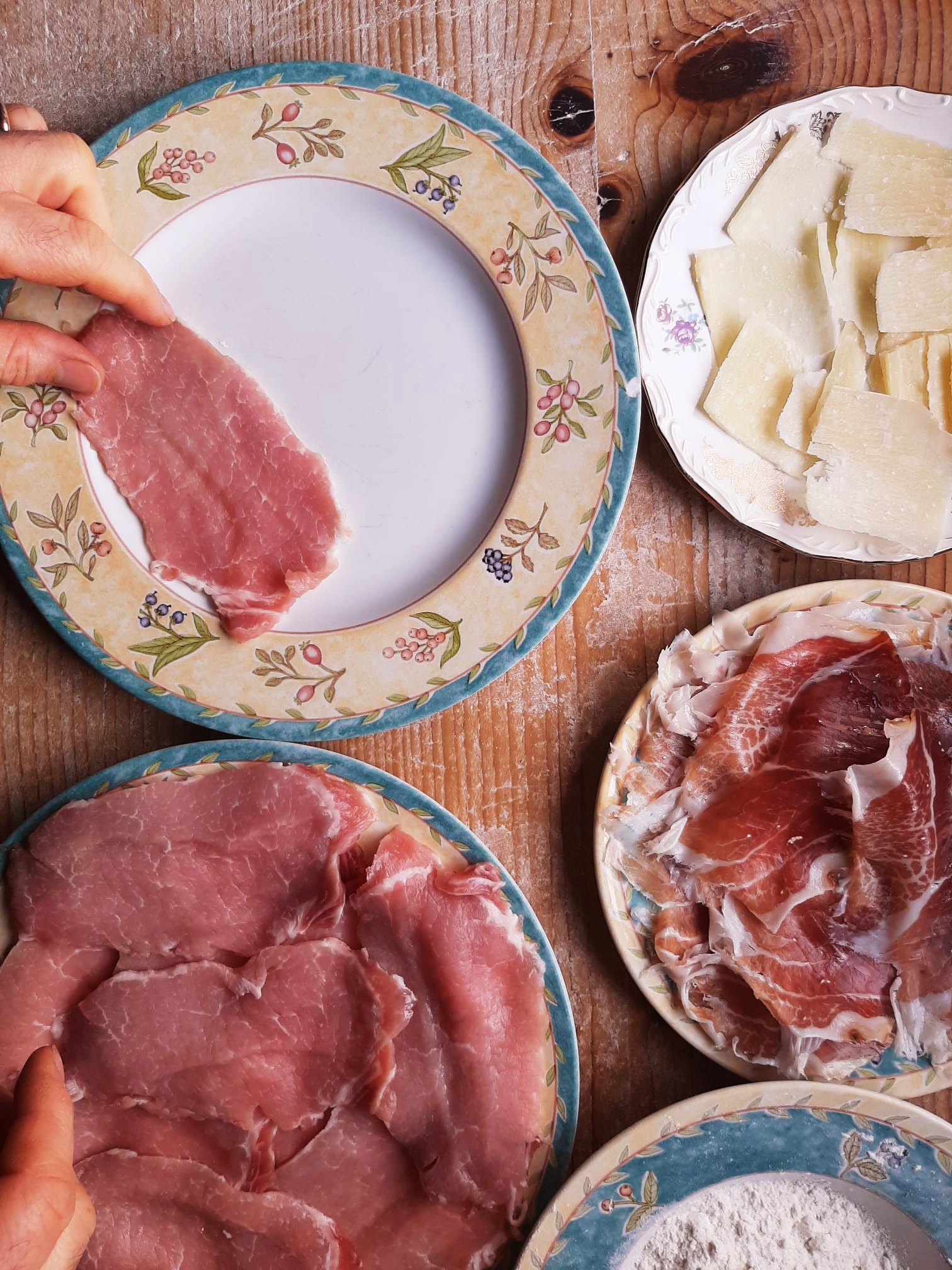 - Adagiare su ogni fettina di lonza,1/2 fetta di prosciutto crudo e una scaglia di parmigiano reggiano.