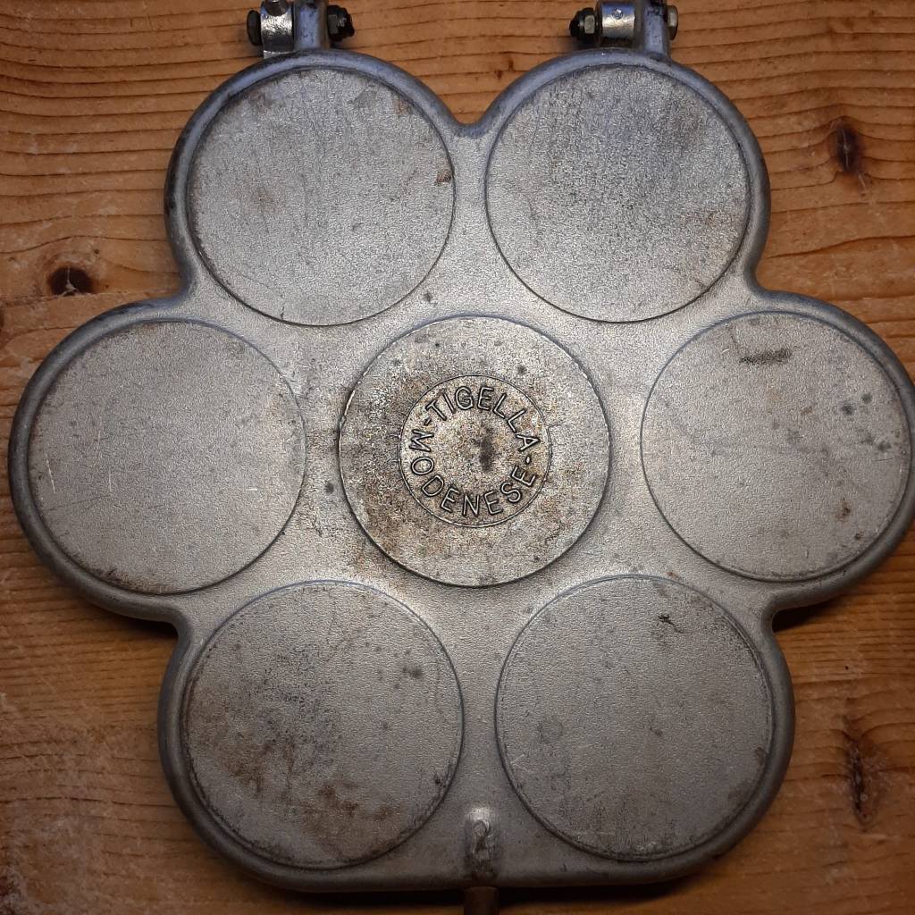 Non so bene come ci sia finita una “tigelliera” in casa, ma so esattamente dove l’abbiamo comprata: al mercato del sabato. Tra i tanti banchi di vari generi, alimentari come quello di Cristian, di abbigliamento e calzature, come quello dell’istrionico Andrea (di cui sicuramente vi parleremo in un’altra ricetta), c’è un ambulante che esibisce tutto ciò che concerne la casa e la cucina e, visto che tra tutte queste vettovaglie ci sono anche le scodelle, in dialetto locale si chiama “al Scudlér”. Quindi se avete intenzione di acquistare una tigelliera, rivolgetevi al Scudlér!