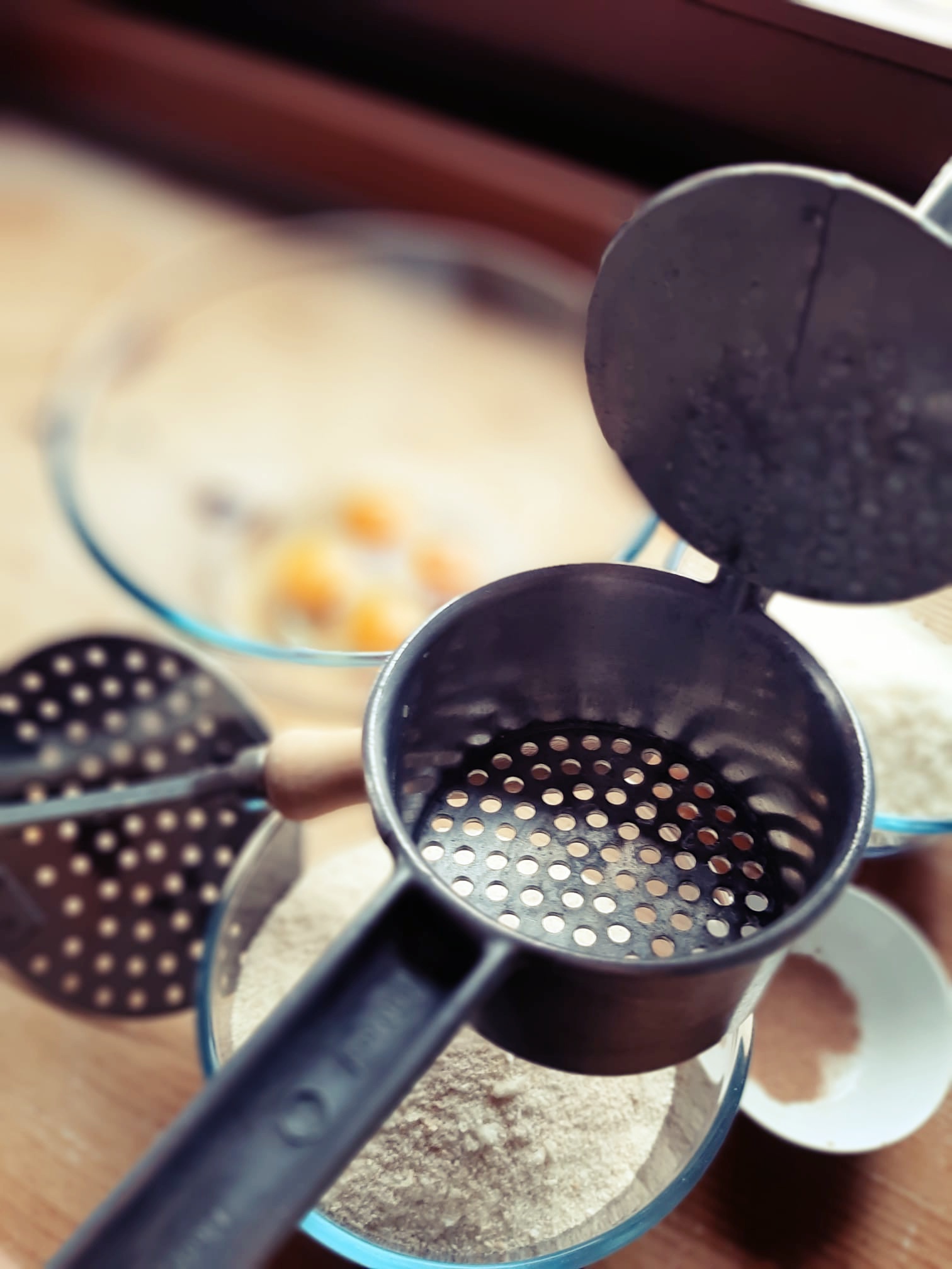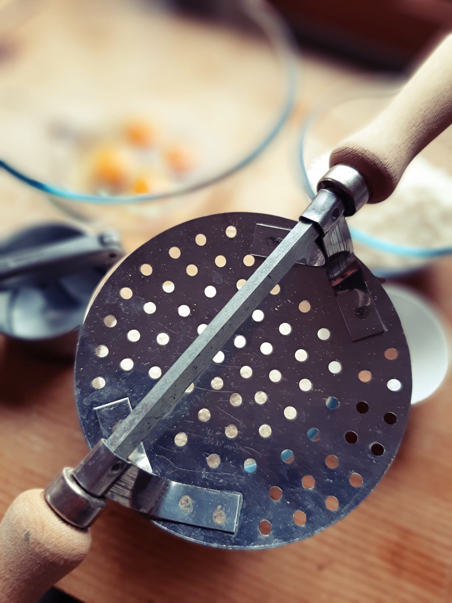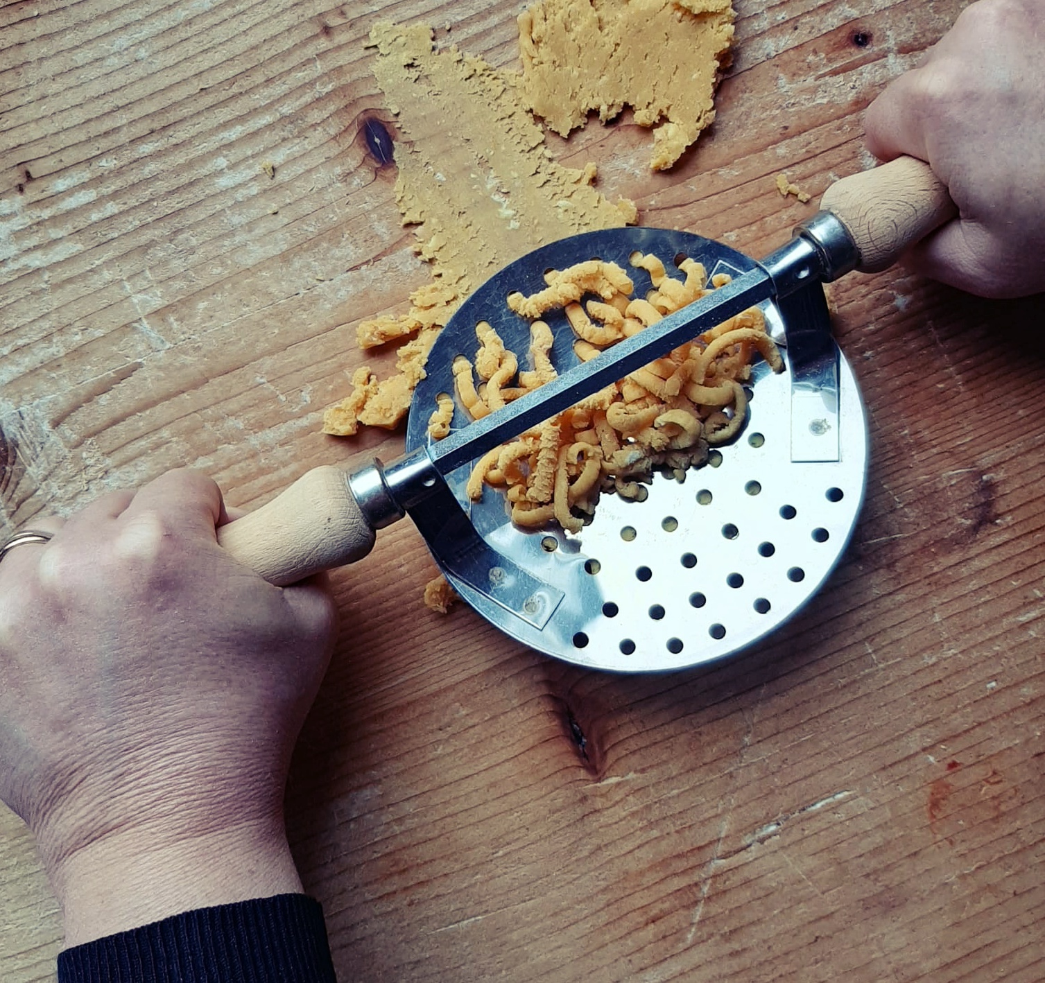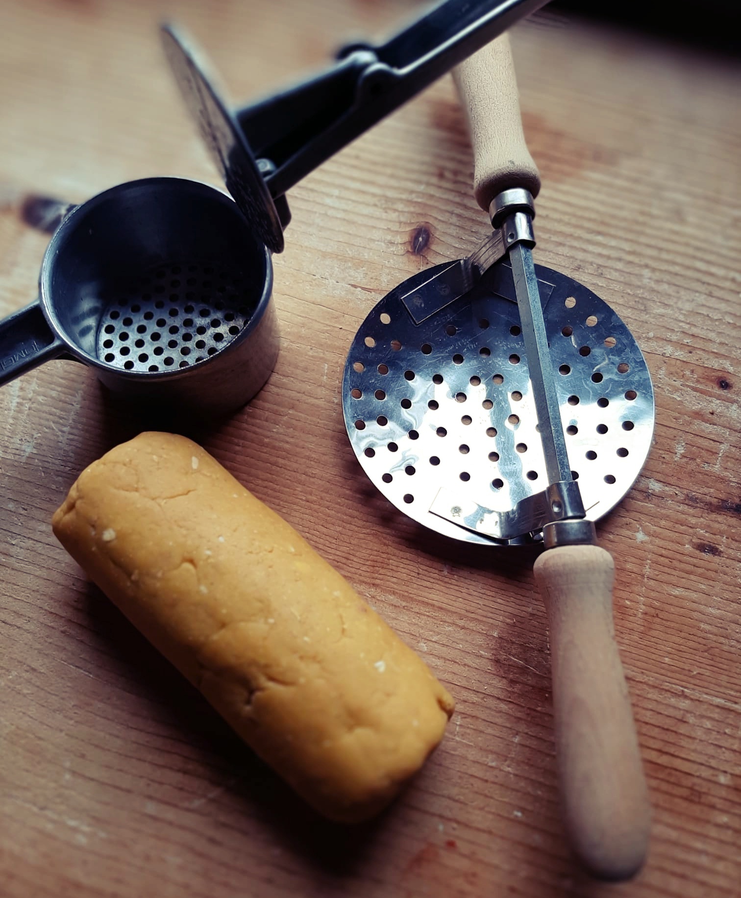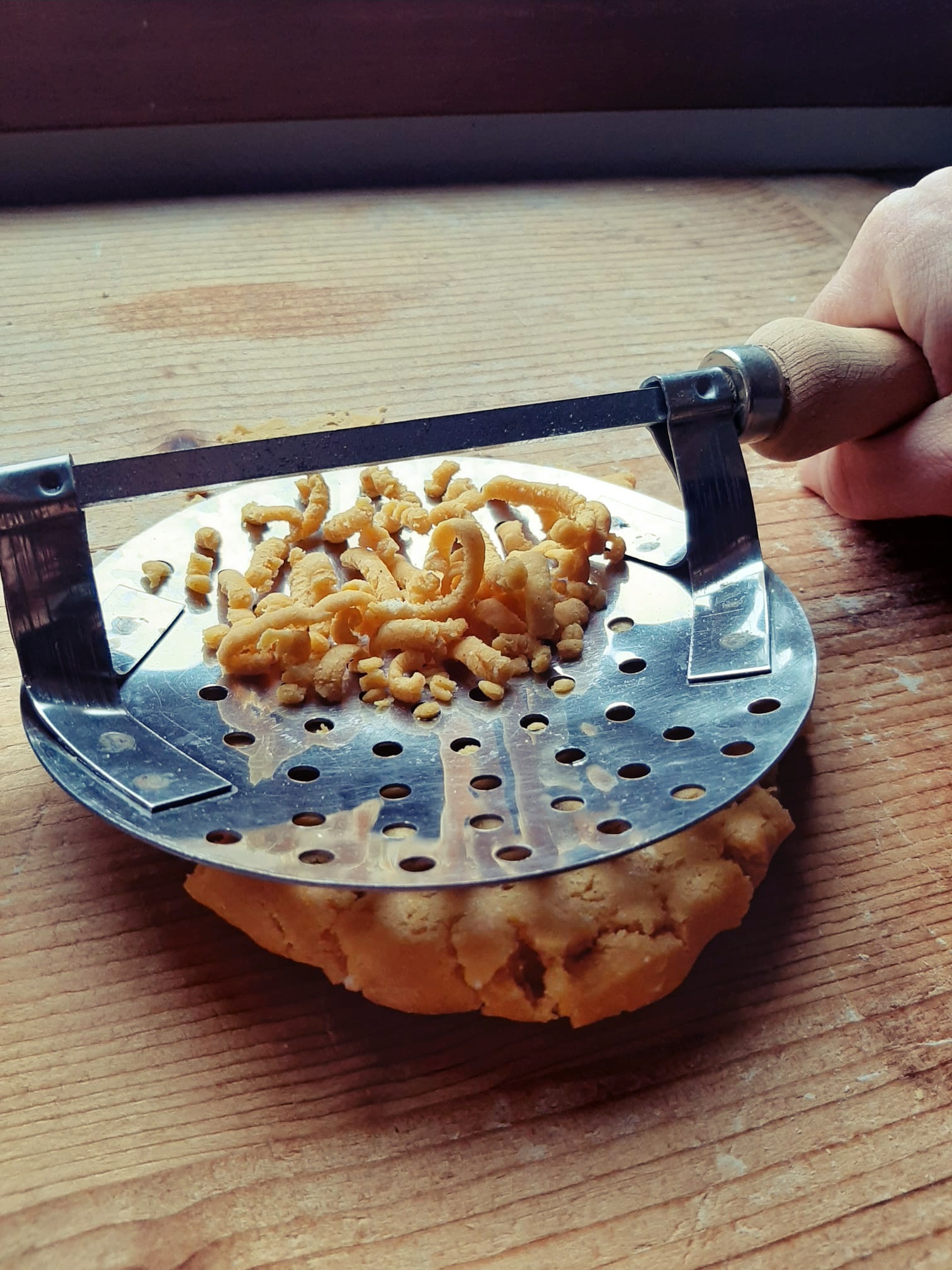 - A questo punto tagliate un pezzo di impasto e forare i passatelli: esiste un attrezzo apposito utilizzato in Romagna (che potete vedere nelle foto successive) ma, più comunemente si usa un semplice schiacciapatate. ATTENZIONE! deve avere i buchi abbastanza grandi ed essere forato solo nella base. Introducete un pezzo di impasto, schiacciate e tagliate con un coltello (lunghezza di circa 8/10 cm).
