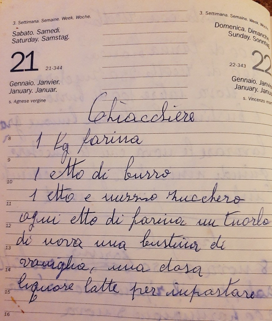 Il ricettario della Nisèn (l’Ines ed Cargnan, la nonna materna di Flavio) è appunto un’agenda blu datata 1989; lei all’epoca aveva già 79 anni e ammiro lo sforzo di voler mettere per iscritto quasi tutte le ricette che ormai faceva ad occhi chiusi