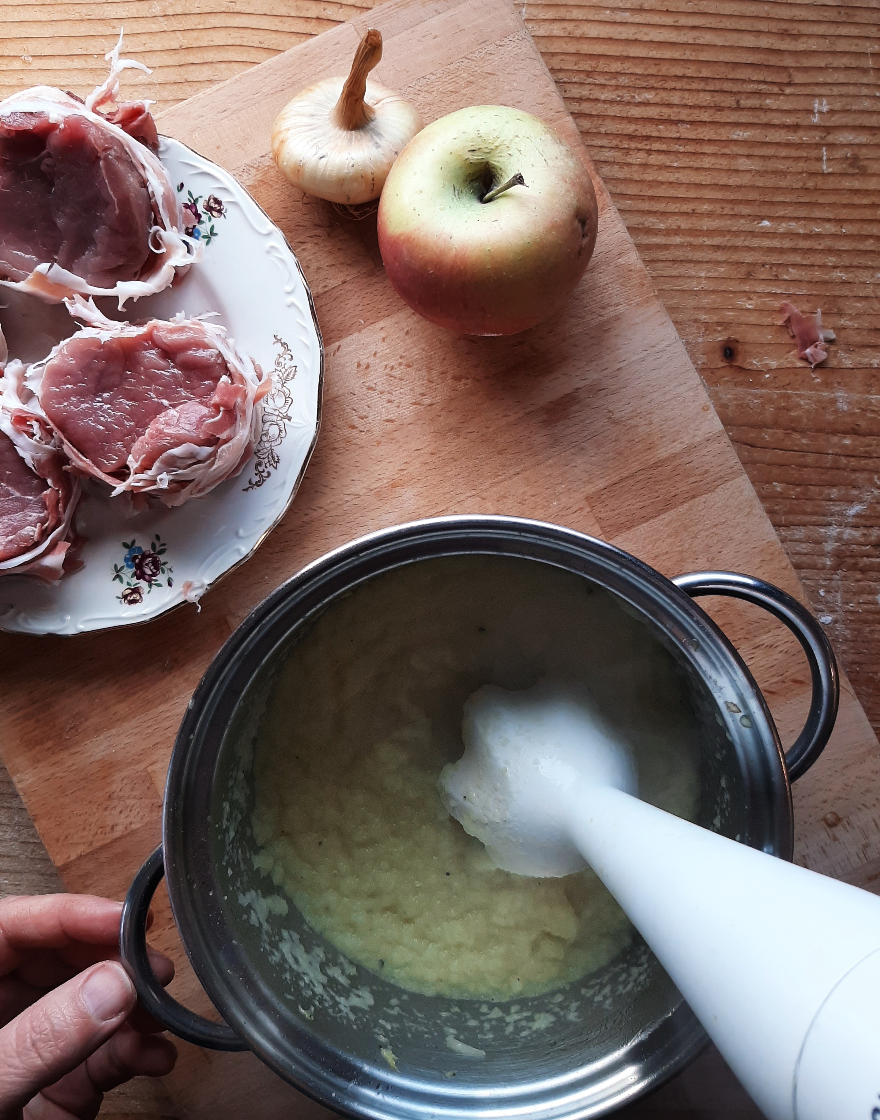 - Continuiamo a cuocere finché le fettine di mela cominciano ad ammorbidirsi; a questo punto passiamo il tutto con il mixer ad immersione.