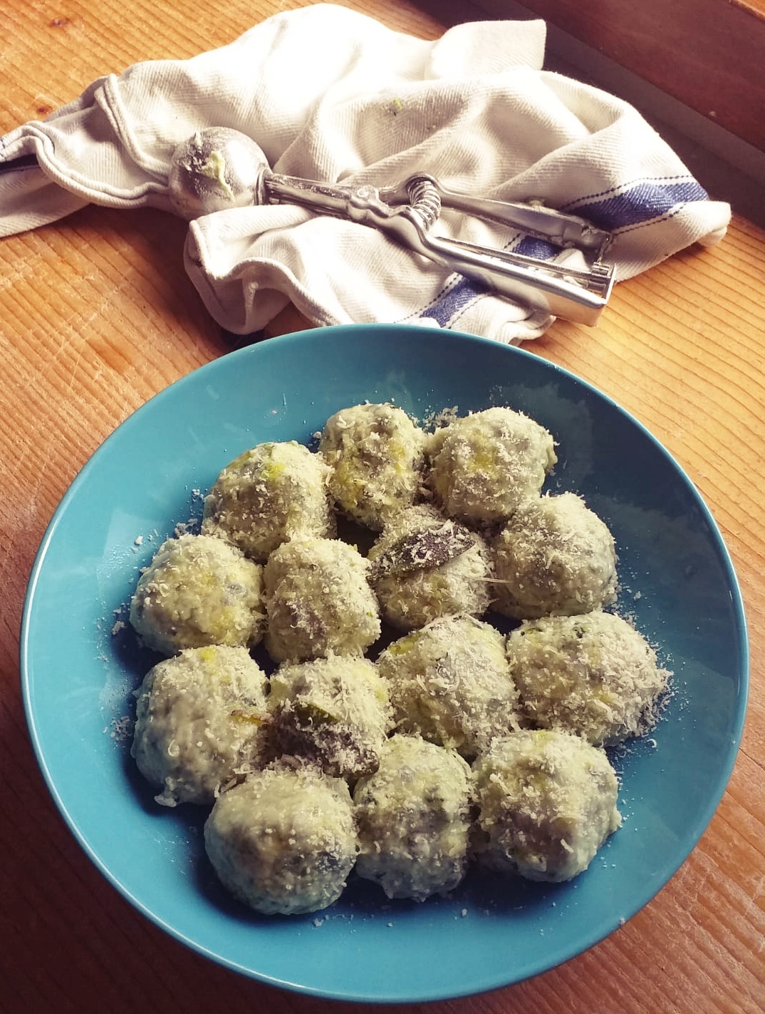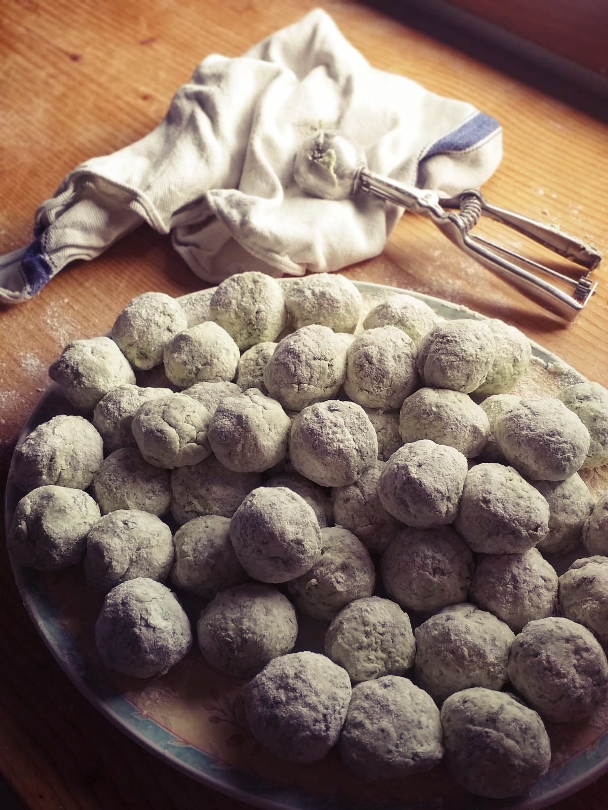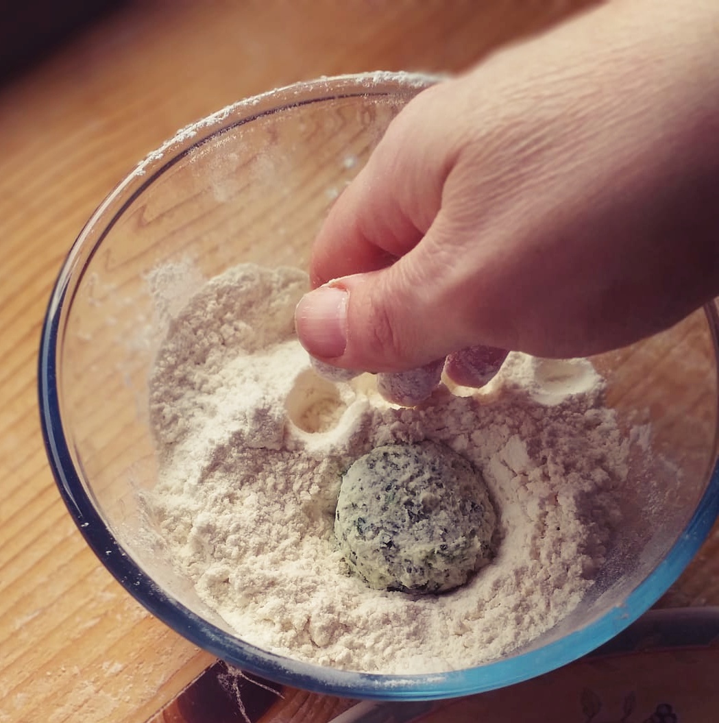 - A questo punto, con il dosatore del gelato, formiamo delle palline di composto, che poi passeremo nella farina.