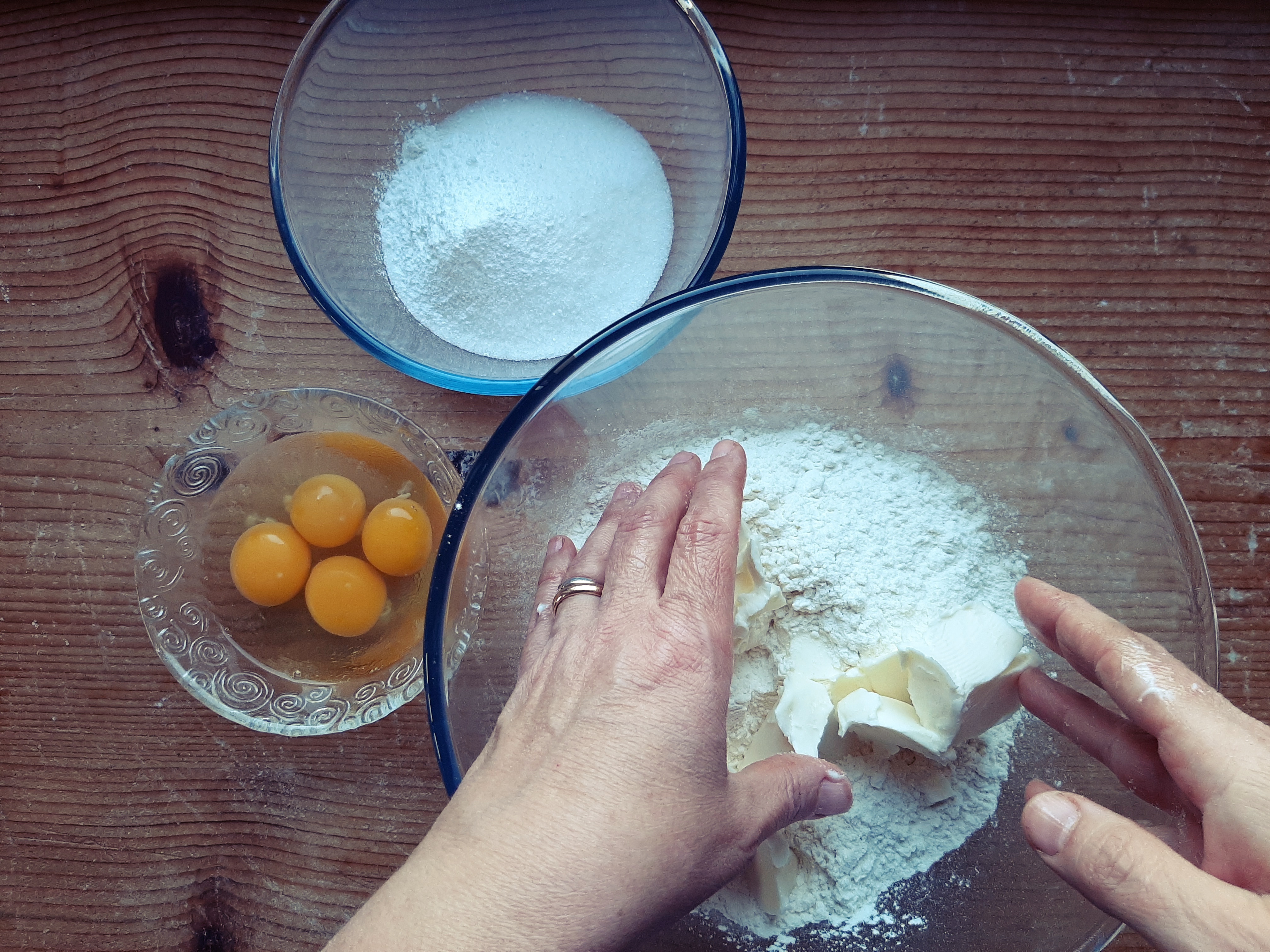 - Mettiamo il burro a pezzettini nella ciotola con la farina e poi cominciamo a sfregare tra le mani fino a che il burro si sarà uniformato con la farina. Questa operazione si chiama sabbiatura perché alla fine la farina risulta umida come la sabbia.
