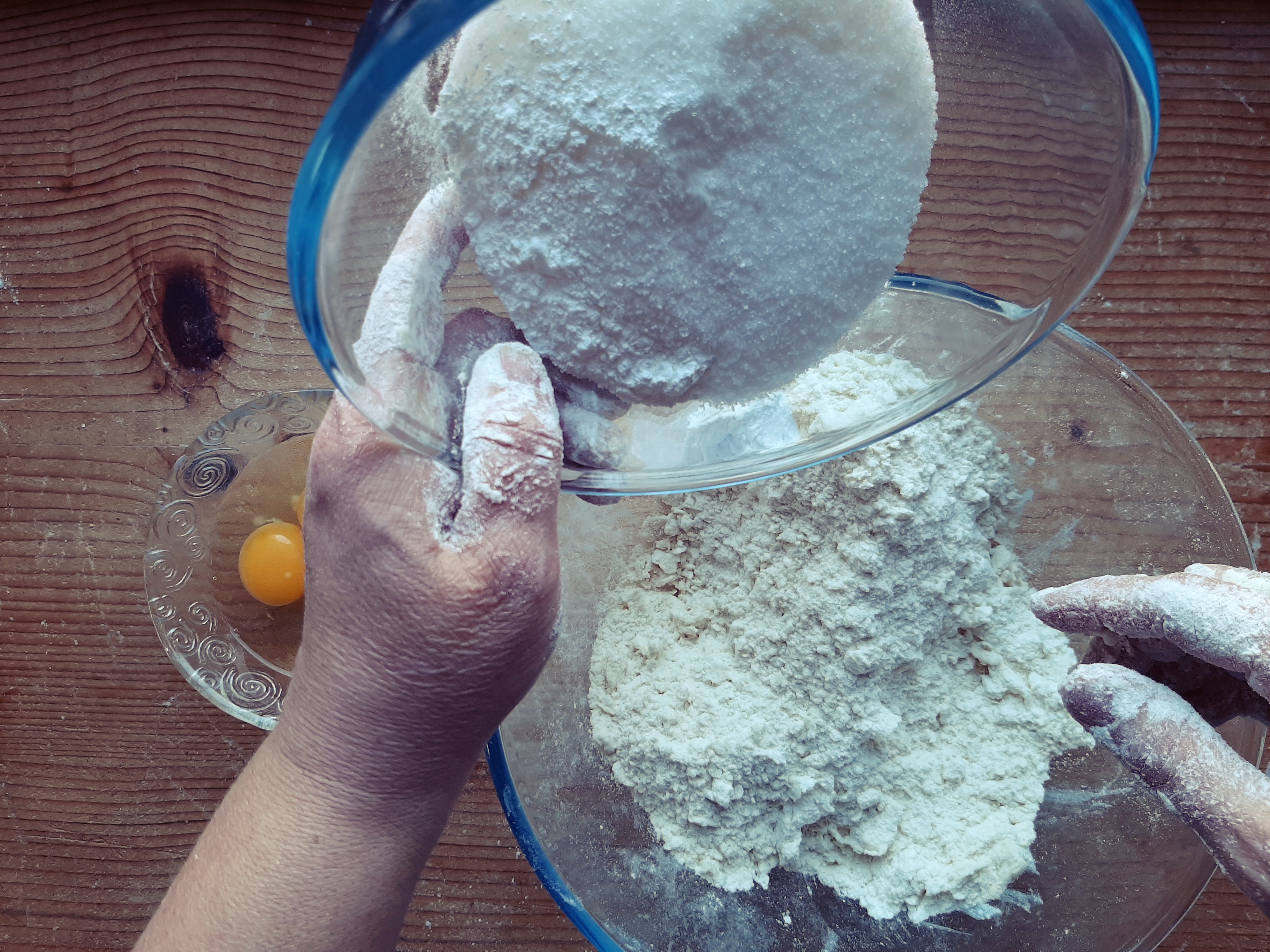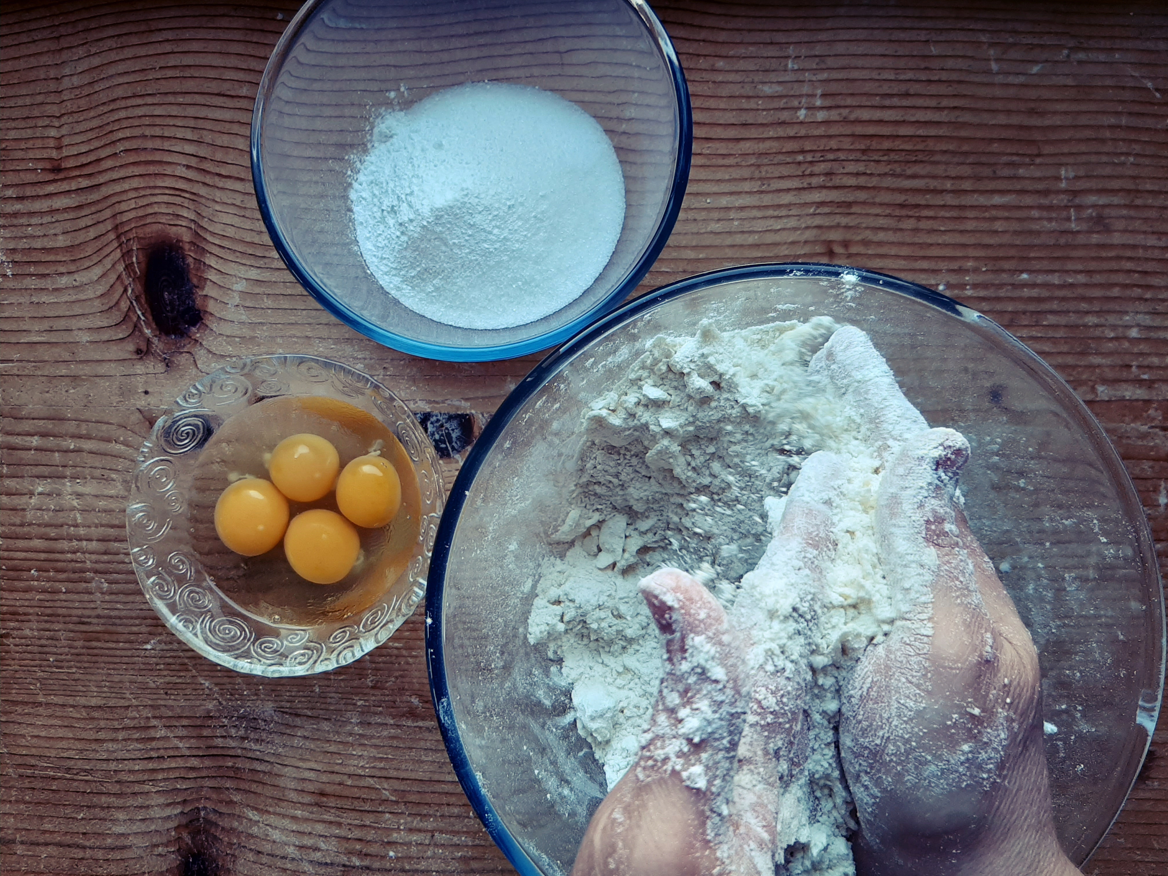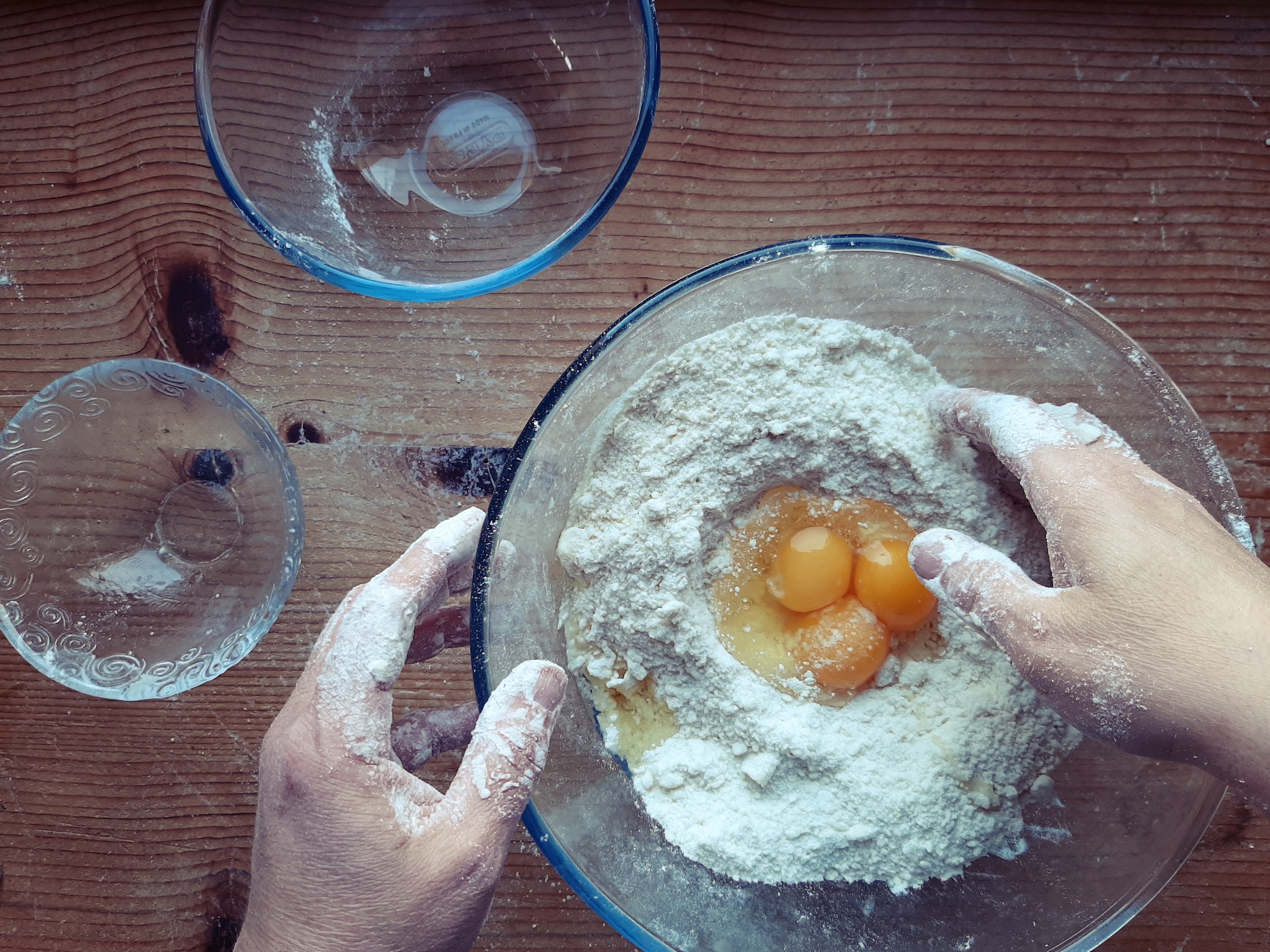 - Per ultimo le uova e i tuorli; lavoriamo velocemente l’impasto per non farlo scaldare troppo, fino a fare un panetto compatto.
