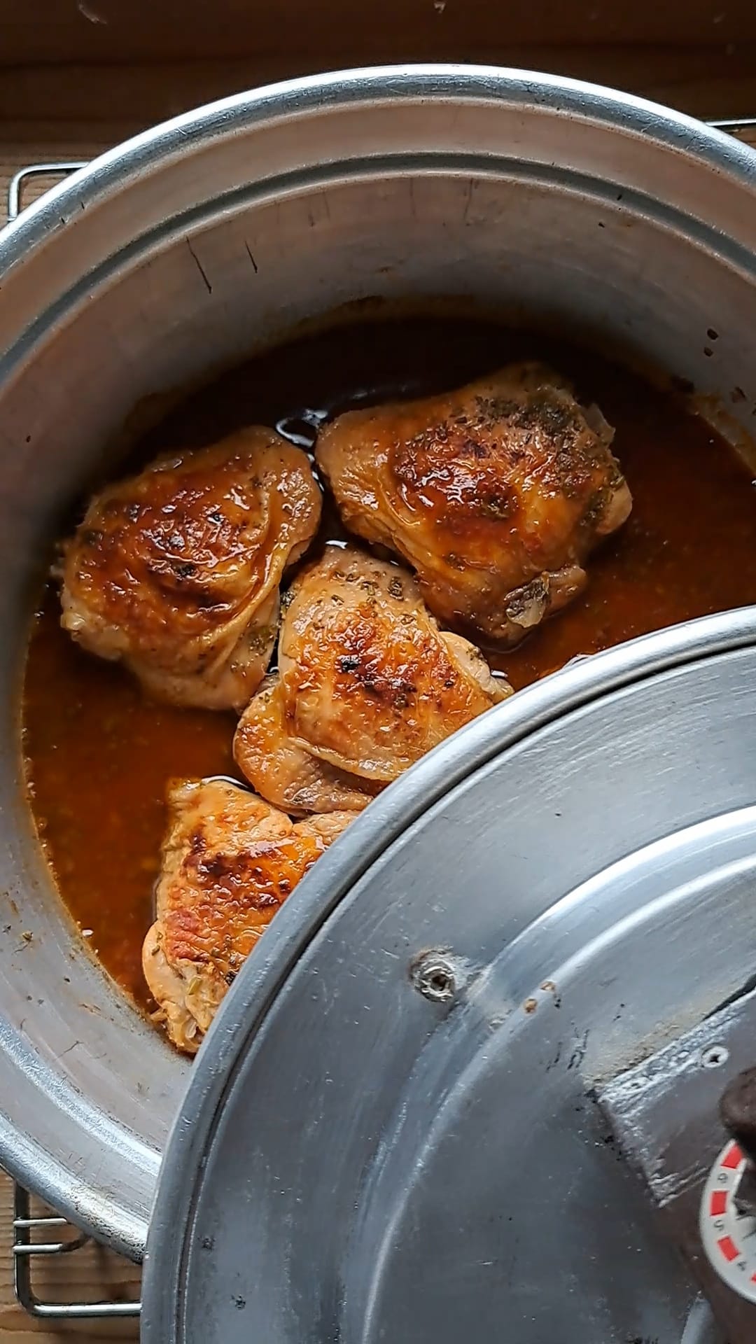 - In padella: dovrà cuocere 1 ora e mezzo abbondante (varia a seconda della grandezza dei vostri pezzi ovviamente).La prima parte della cottura la facciamo con il coperchio; se in questa fase vedete che il sugo si sta già asciugando, aggiungete un altro mezzo bicchiere di acqua.Gli ultimi 20 minuti di cottura invece togliamo il coperchio proprio perché vogliamo far restringere il condimento, in modo che il pollo diventi di un bel rosso intenso.