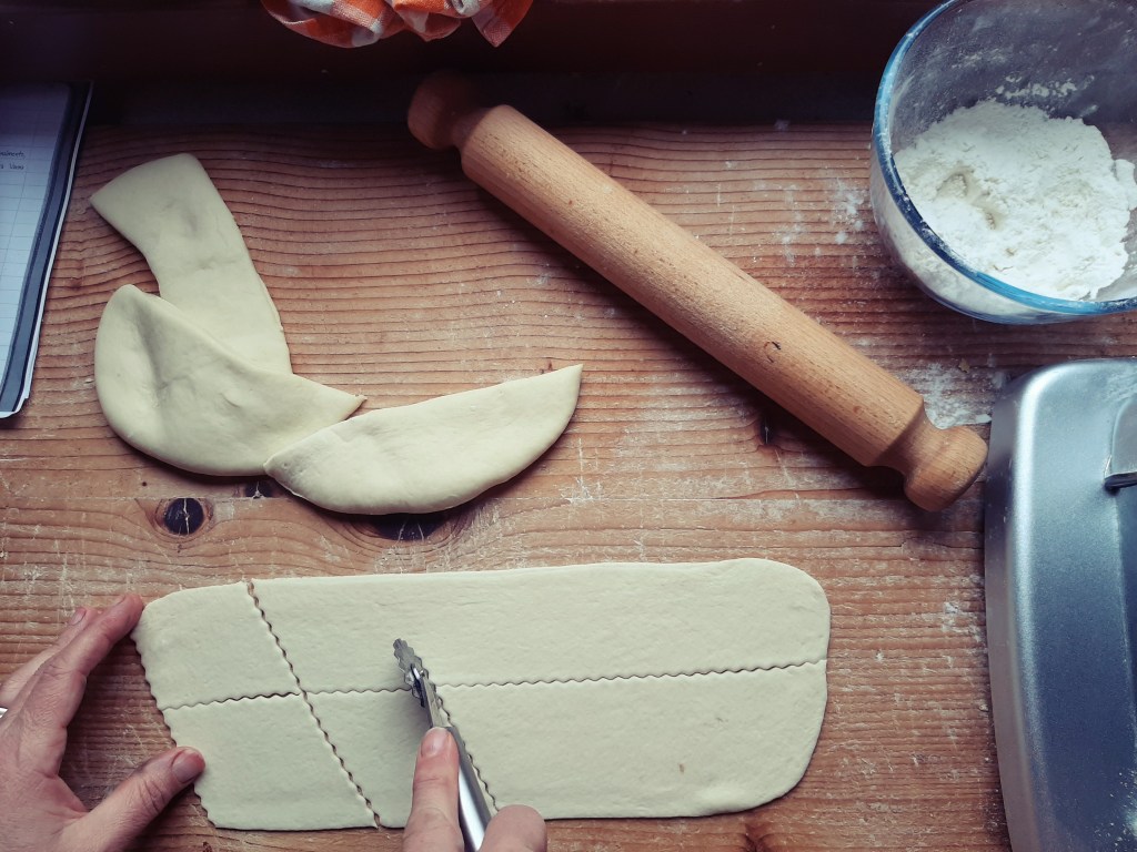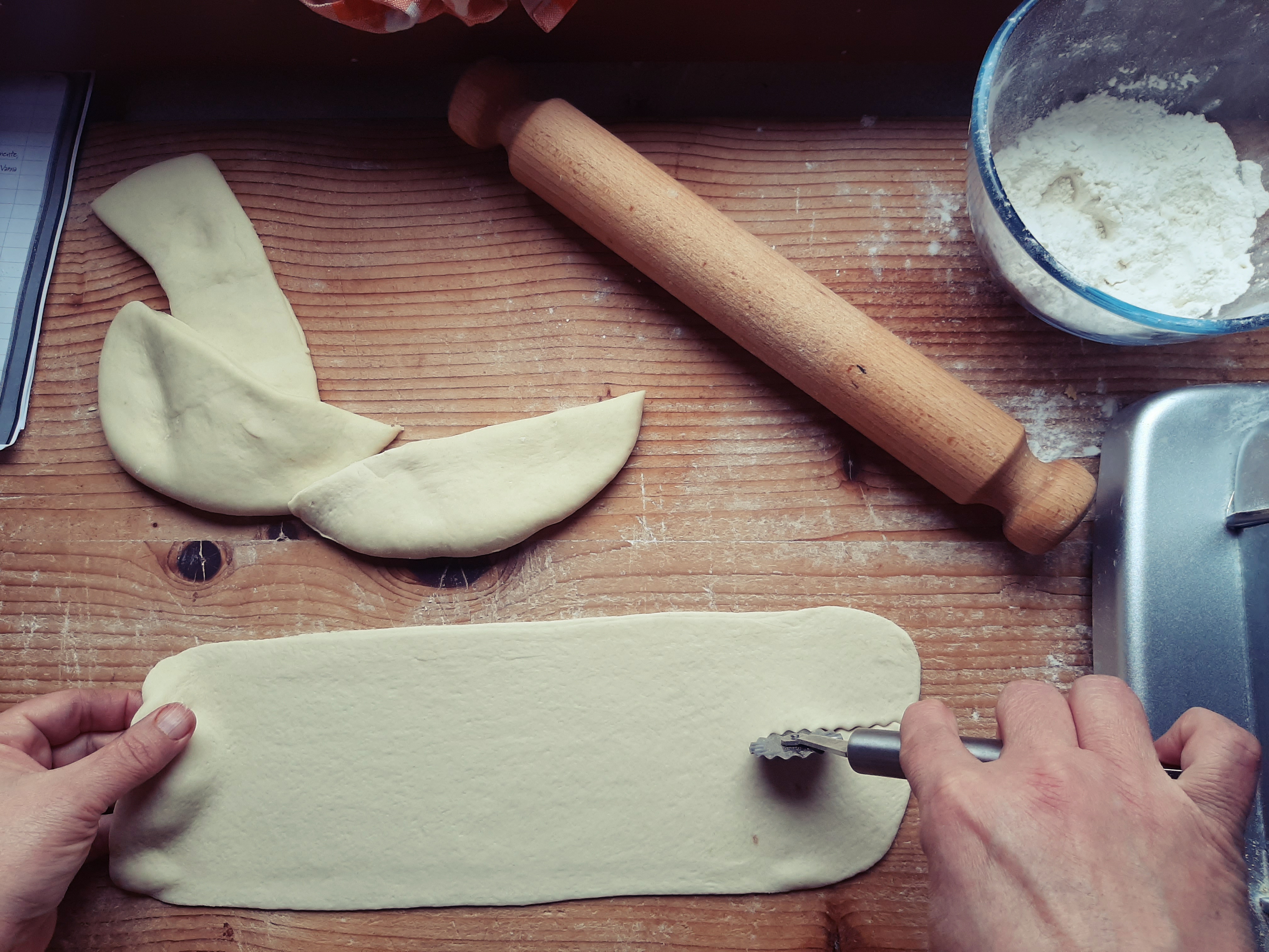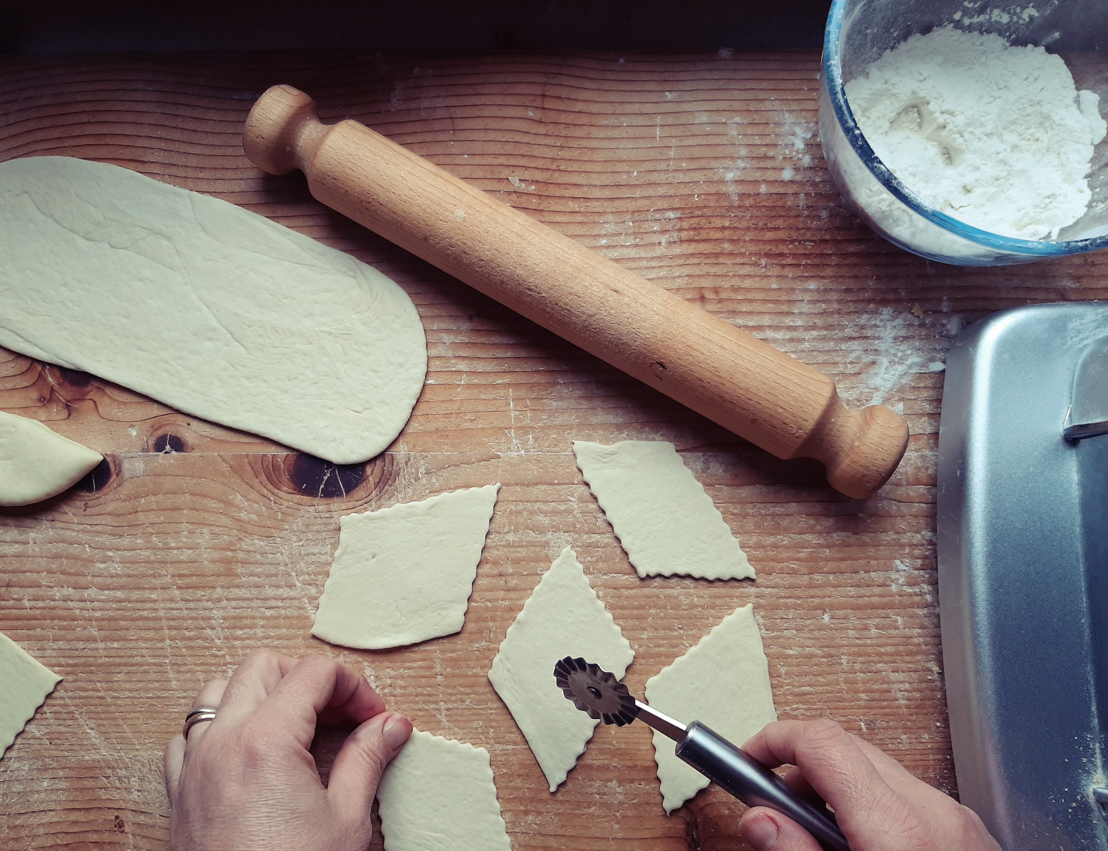 - Tagliare piccole dosi di impasto, tirarlo con il mattarello o ancora meglio con la macchina per la sfoglia a circa 3 o 4 mm.; tagliare dei rombi con la rotella.