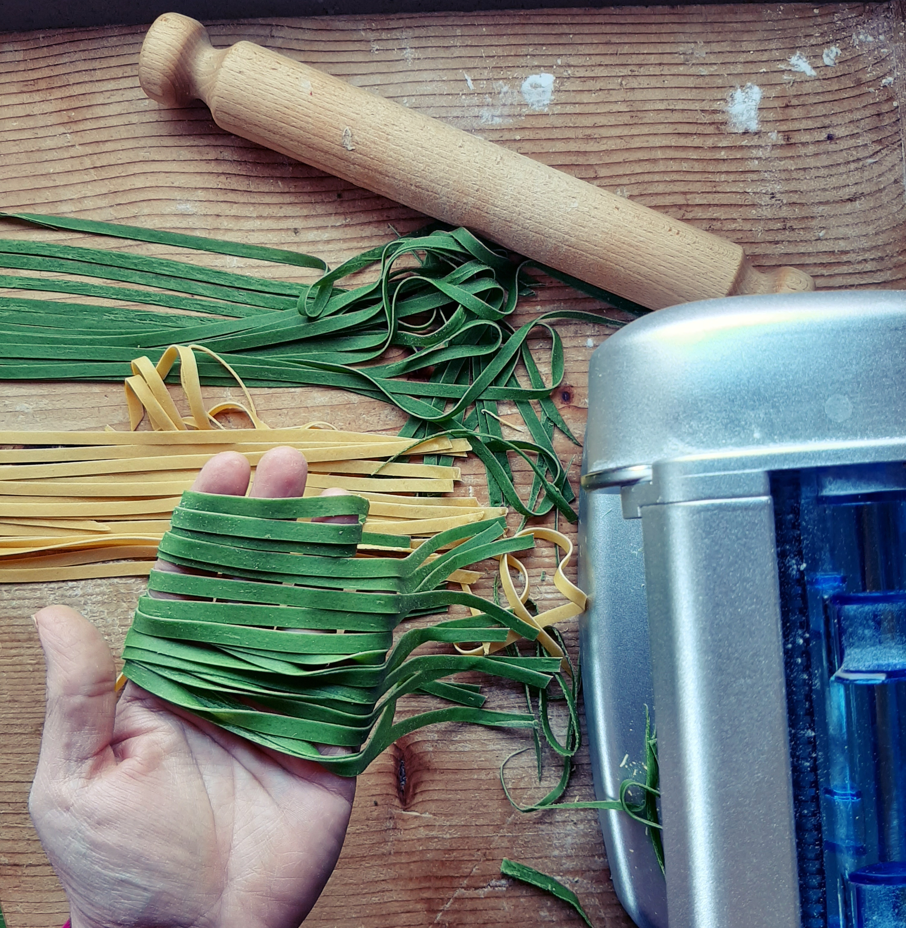 - A questo punto potete decidere se tagliare a mano con una coltellina o precedere con l’attrezzo tagliapasta; se l’impasto dovesse risultare ancora un po’ umido aiutatevi con po’ di semola. Se tirate con il mattarello e tagliate a mano siete dei Pro! Io mi sono “impigrita” e vado di macchina.