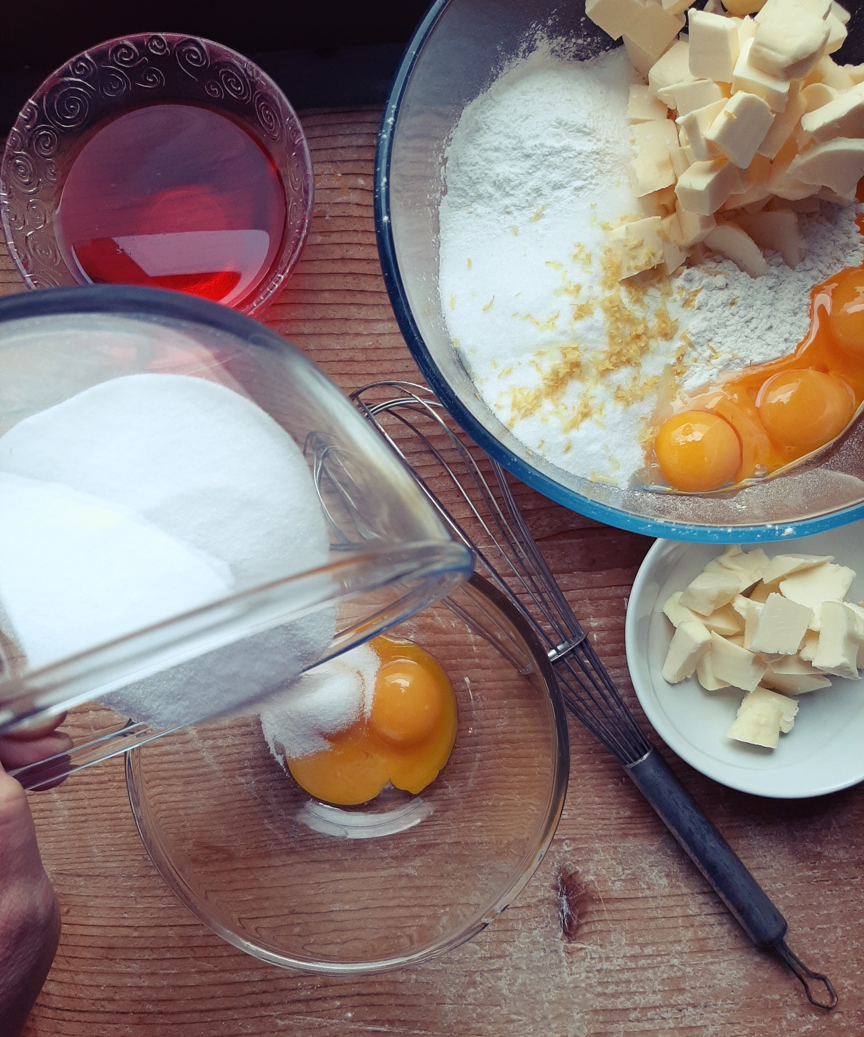 - Fare scaldare il latte con la scorza intera di mezzo limone; nel frattempo lavorare i tuorli con lo zucchero, poi la fecola e aggiungere il latte (a cui avremo tolto la scorza del limone).