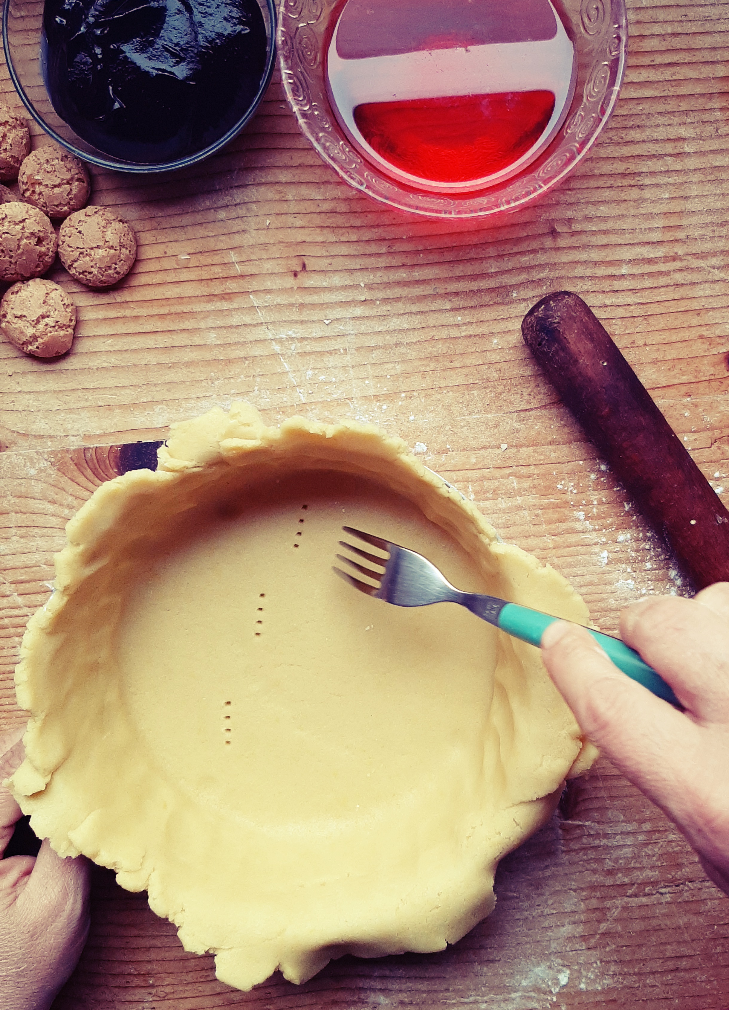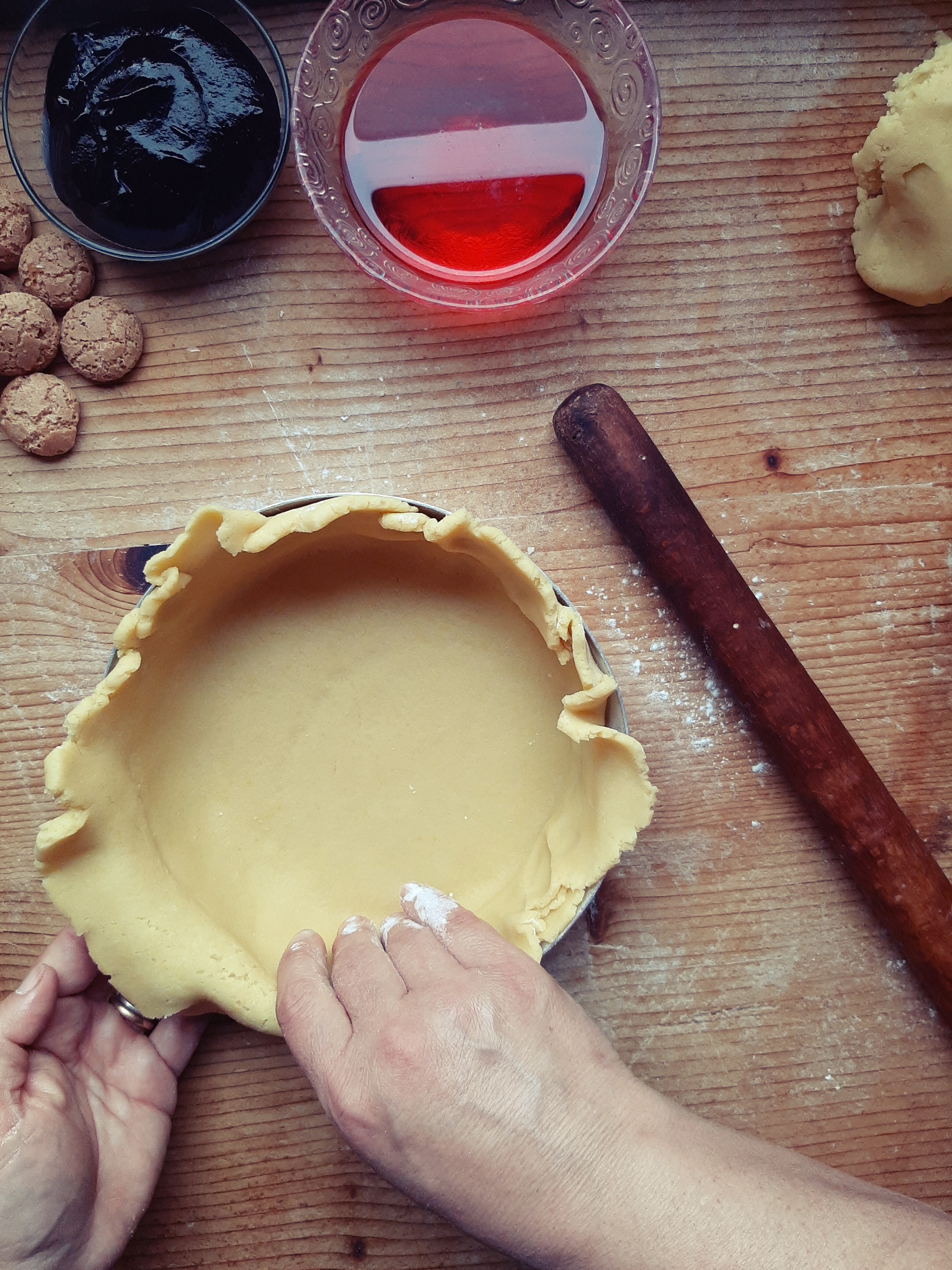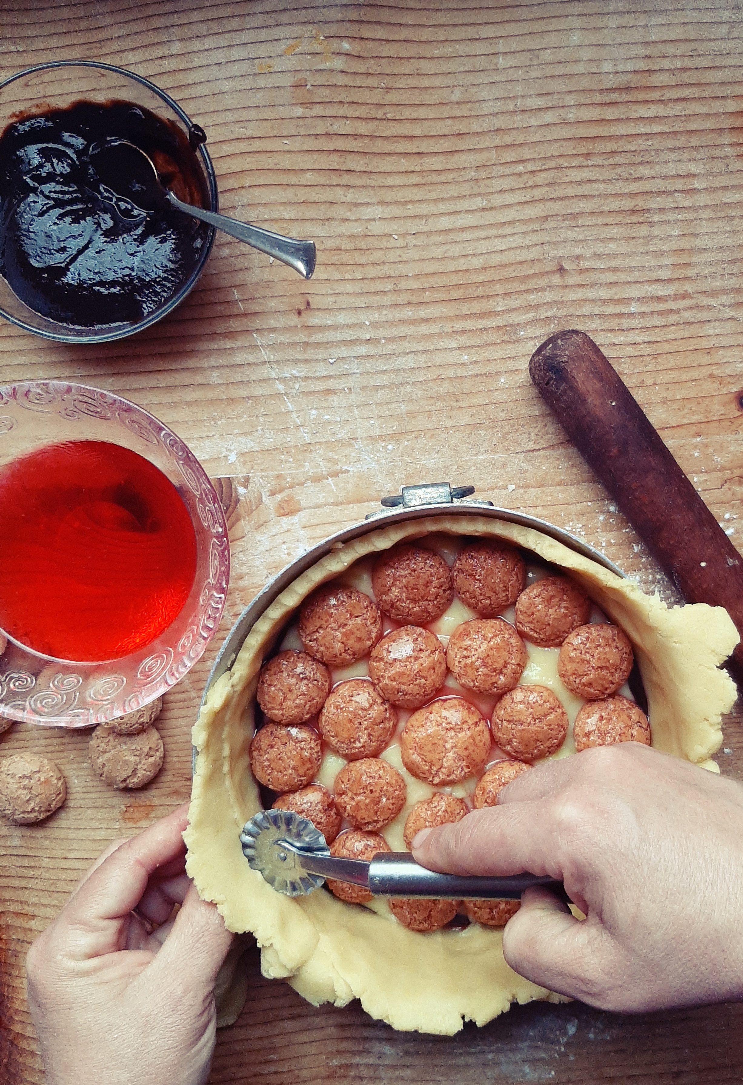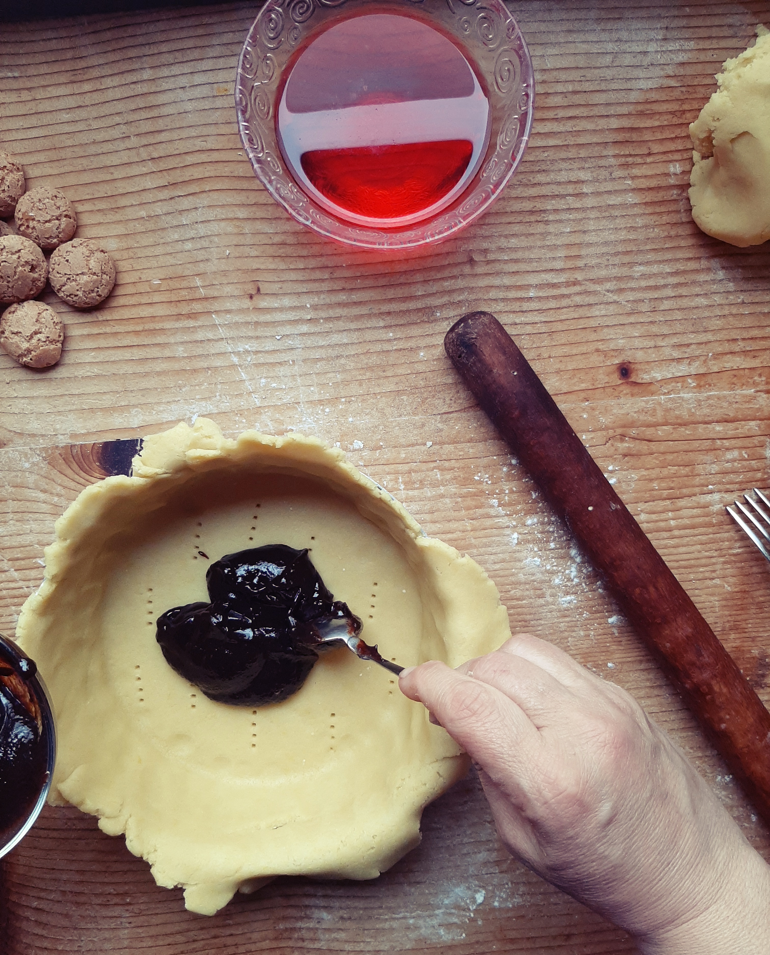 - Stendere la frolla, alta circa mezzo centimetro e rivestire la tortiera (diametro 24) imburrata e infarinata. Bucherellare il fondo con la forchetta, stendere uno strato di marmellata brusca (noi abbiamo usato quella di prugne) e stendere la crema ancora tiepida in modo da facilitare l’operazione. Intingere gli amaretti nell’alchermes e posizionarli sulla crema in cerchi concentrici.