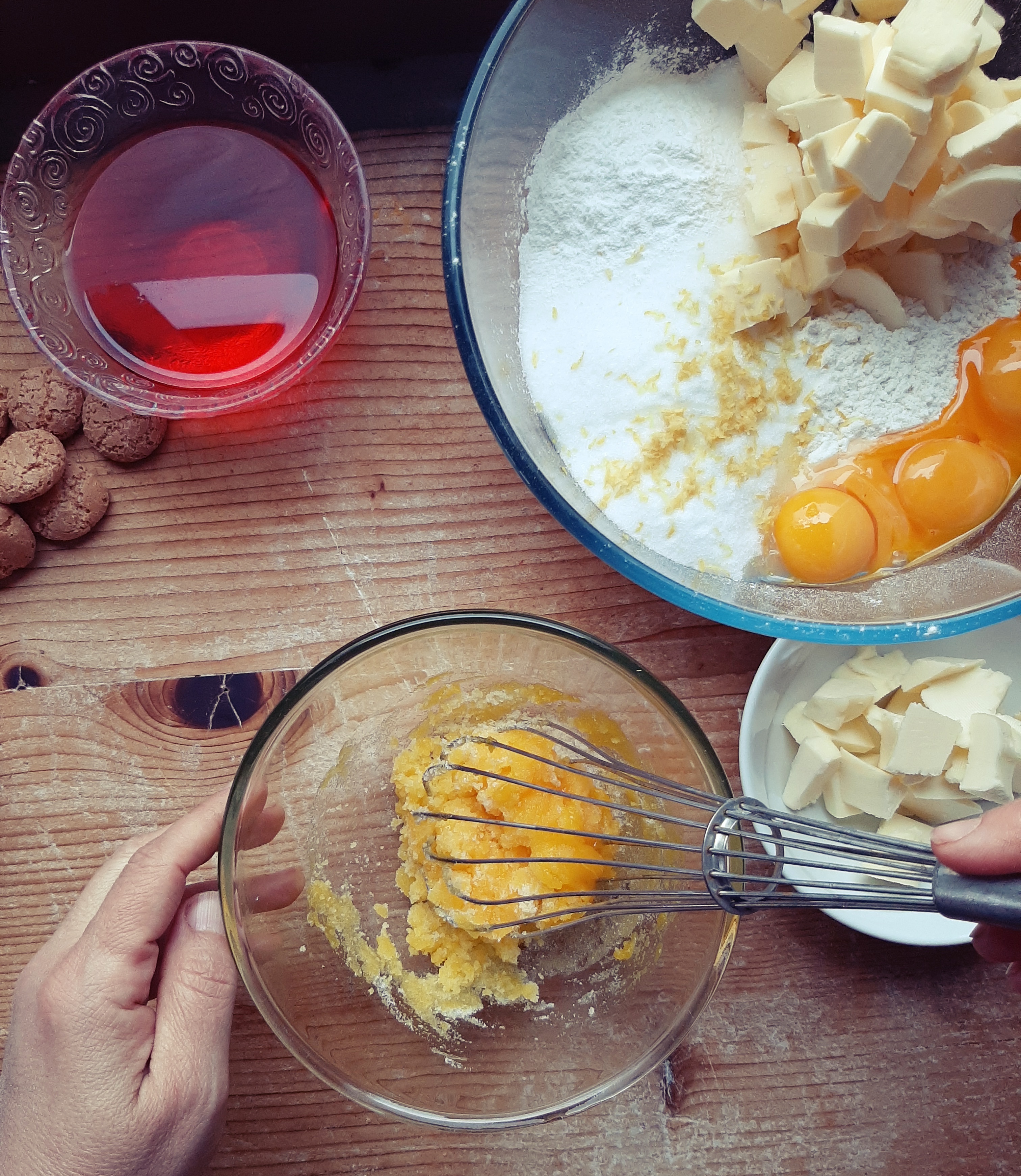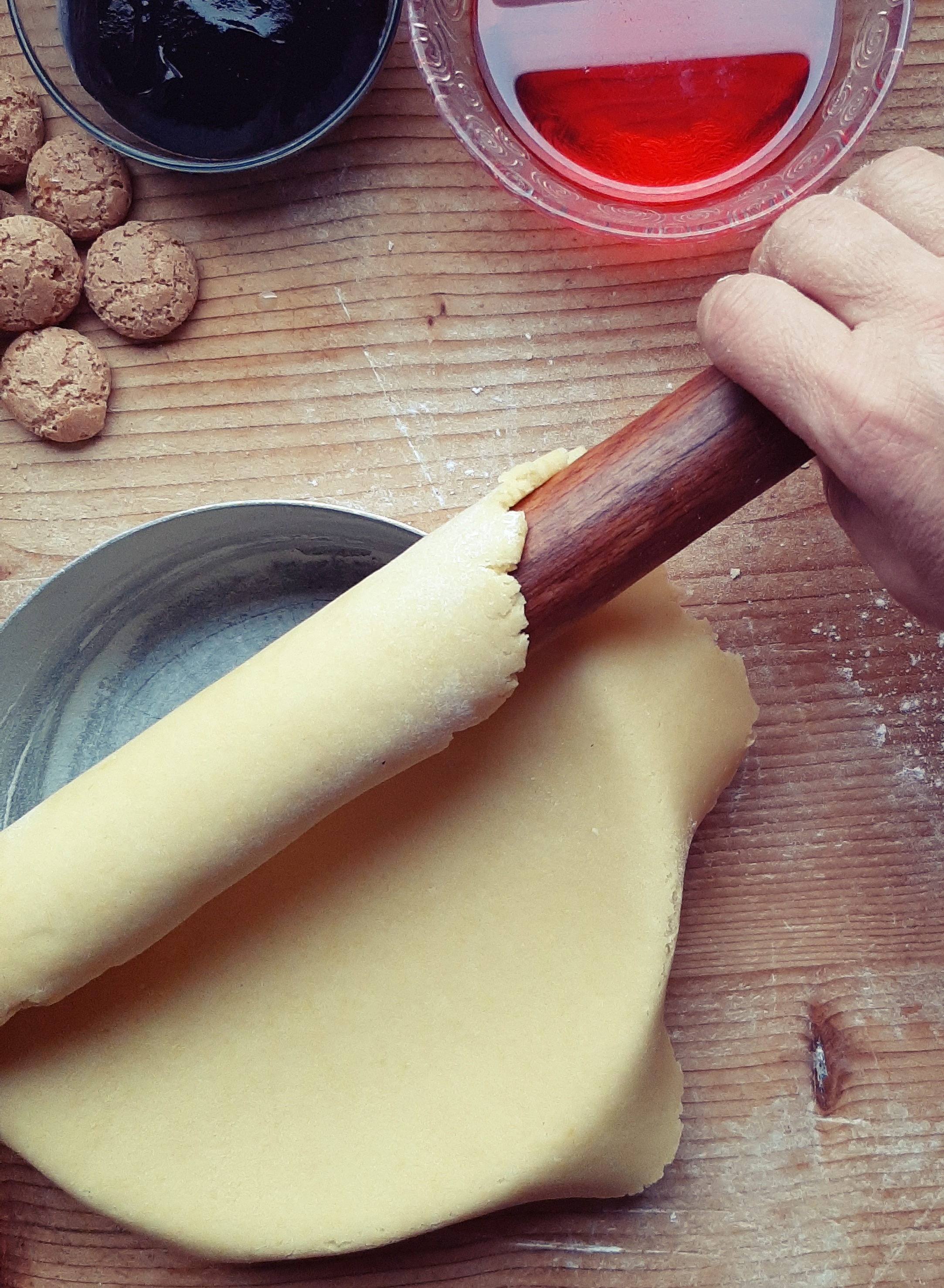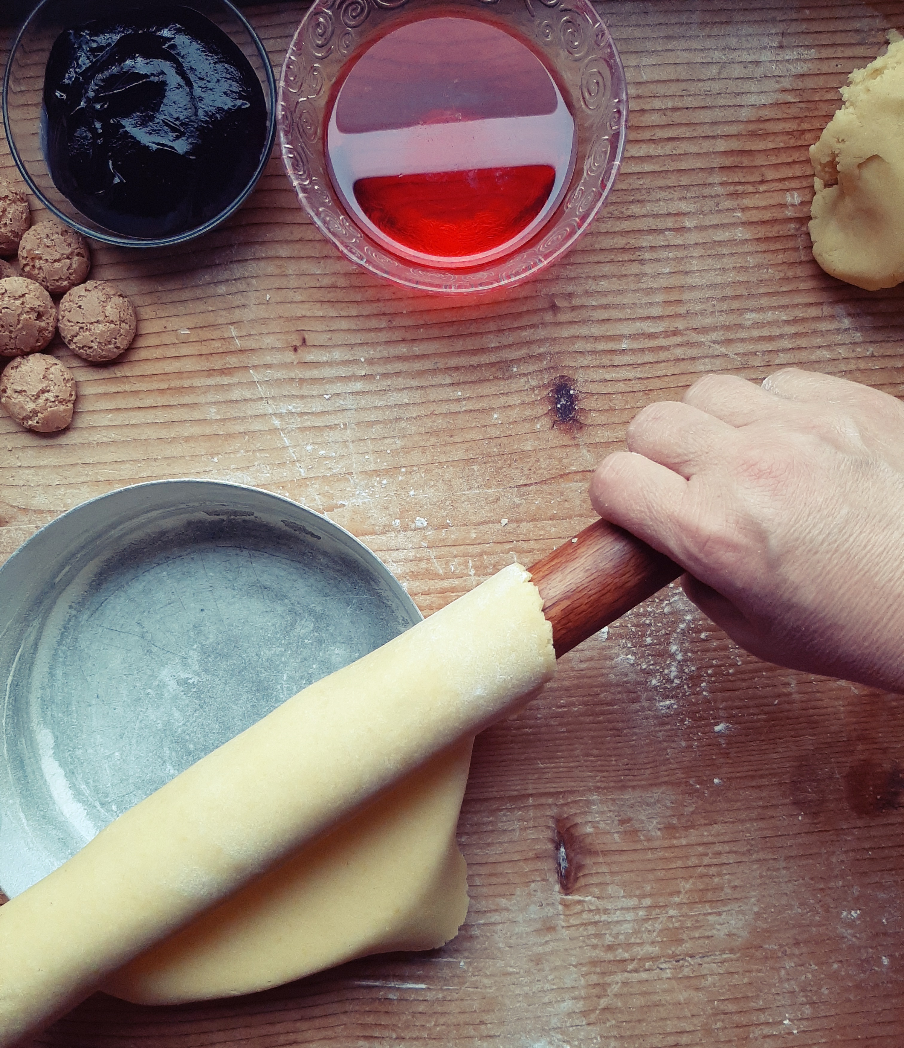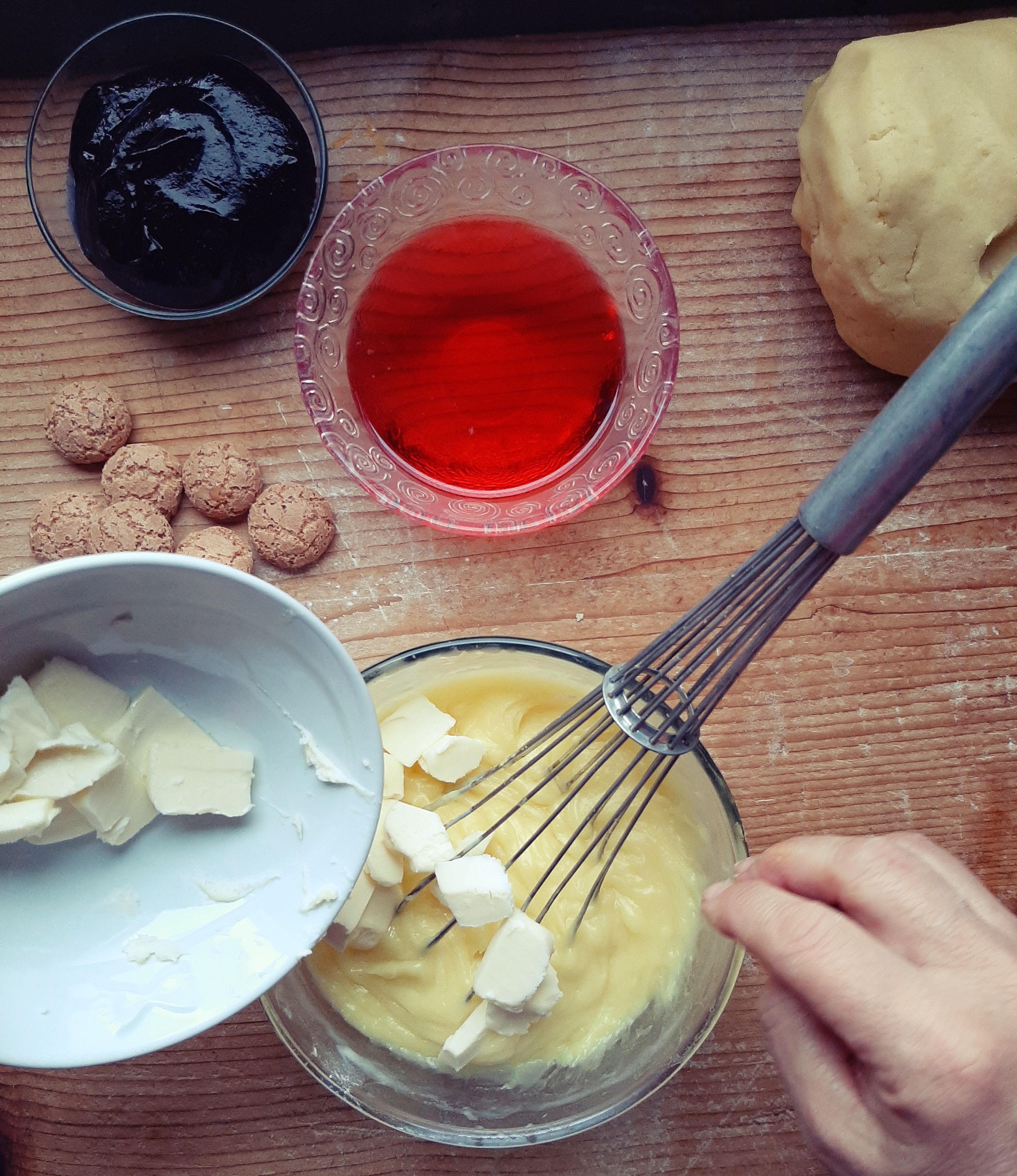 - Stendere la frolla, alta circa mezzo centimetro e rivestire la tortiera (diametro 24) imburrata e infarinata. Bucherellare il fondo con la forchetta, stendere uno strato di marmellata brusca (noi abbiamo usato quella di prugne) e stendere la crema ancora tiepida in modo da facilitare l’operazione. Intingere gli amaretti nell’alchermes e posizionarli sulla crema in cerchi concentrici.
