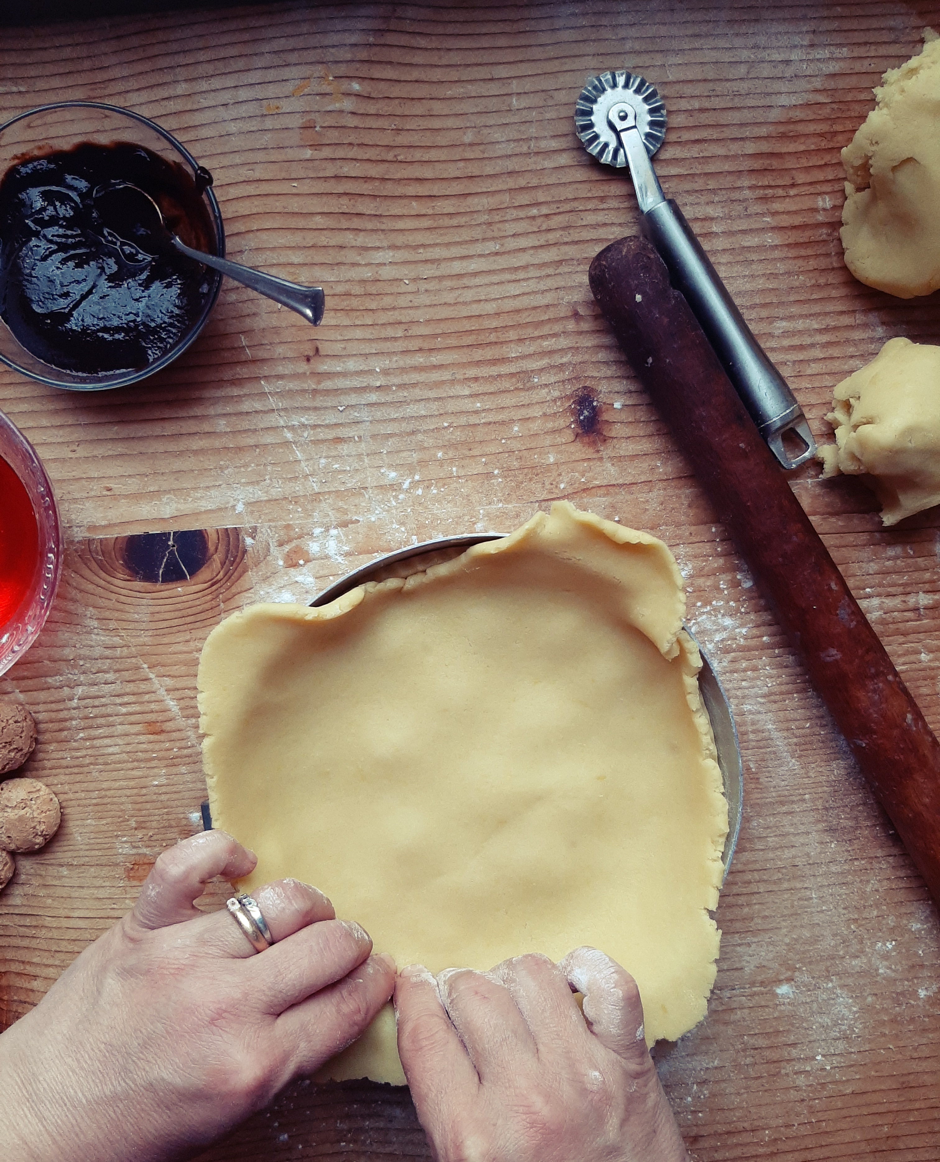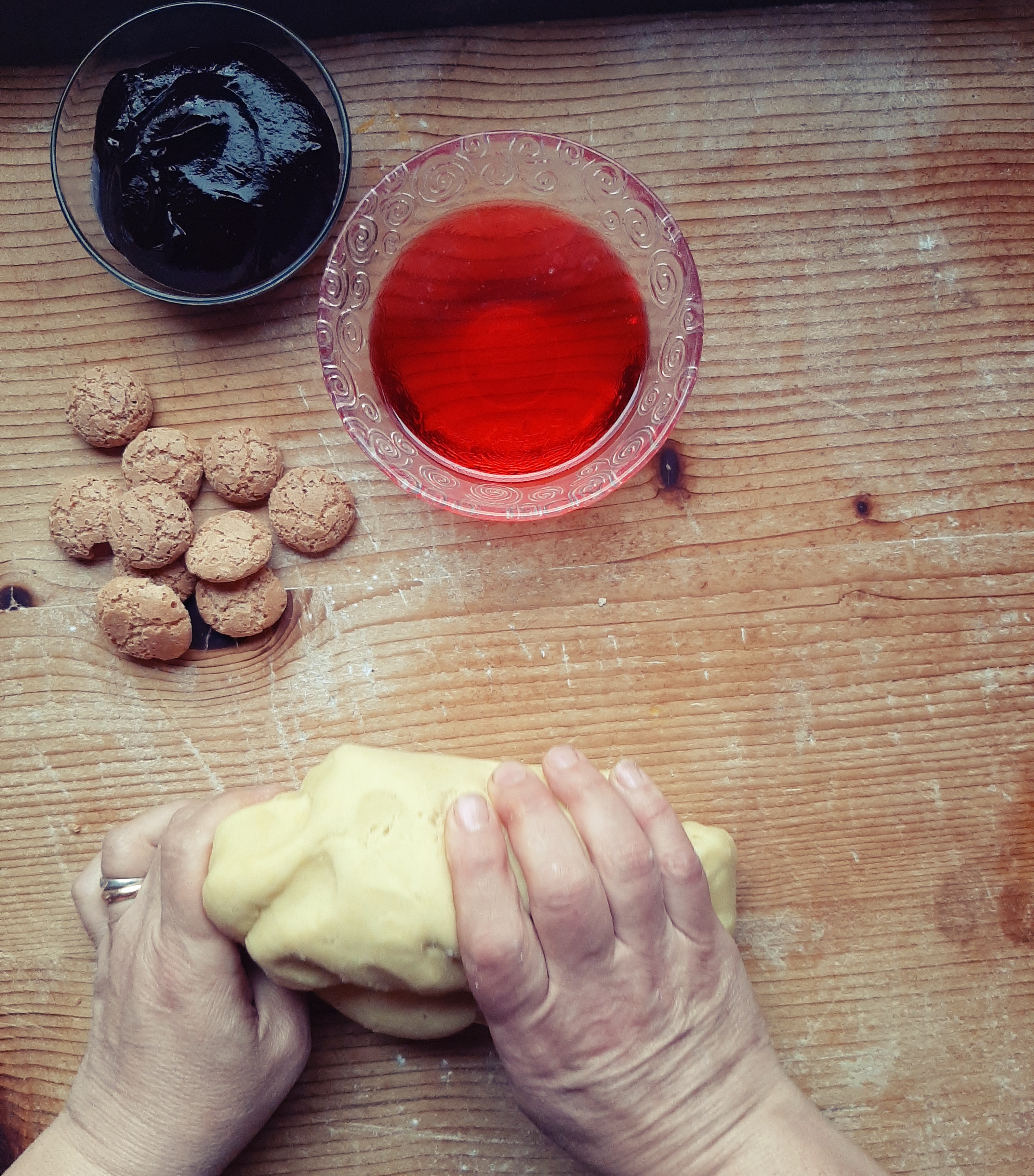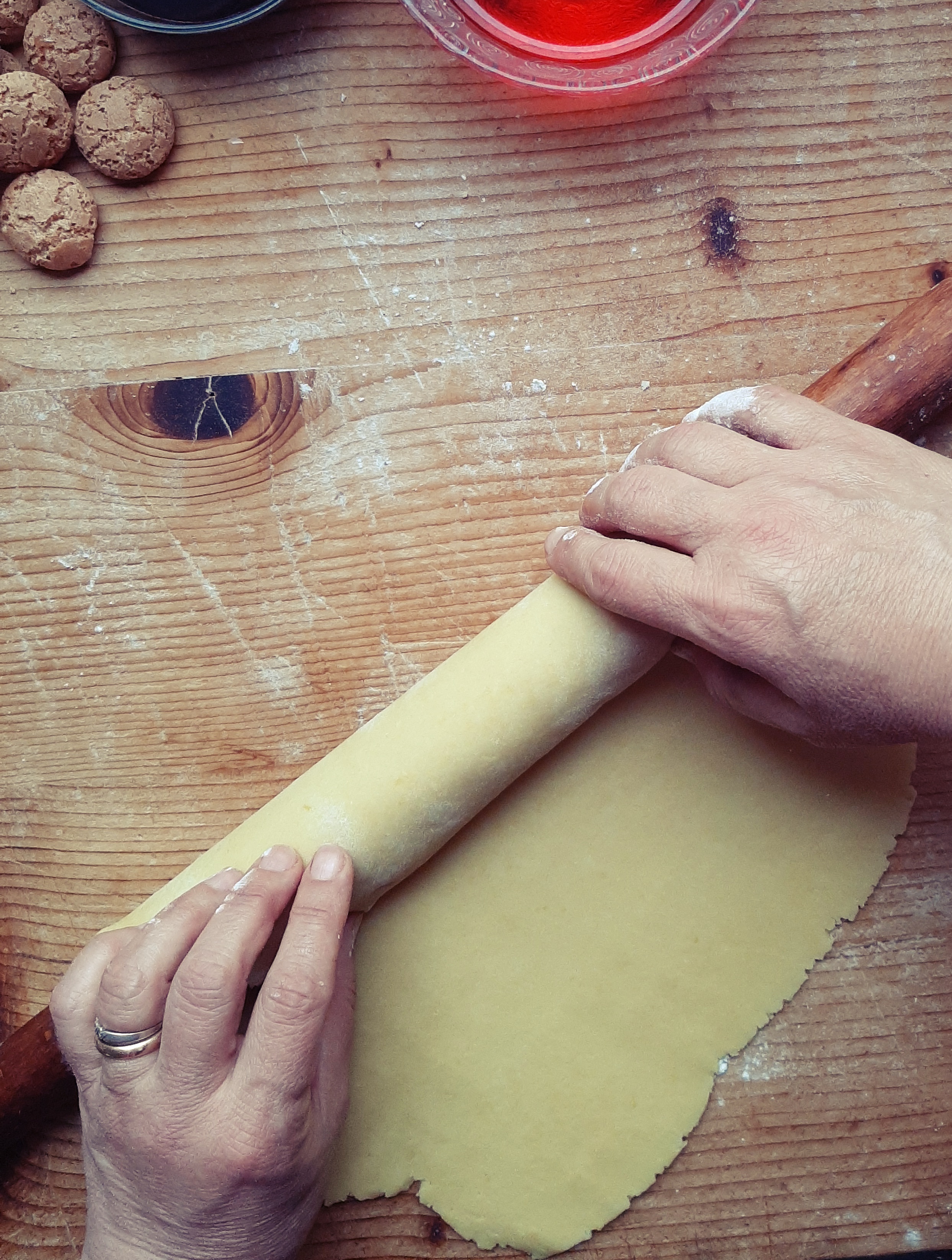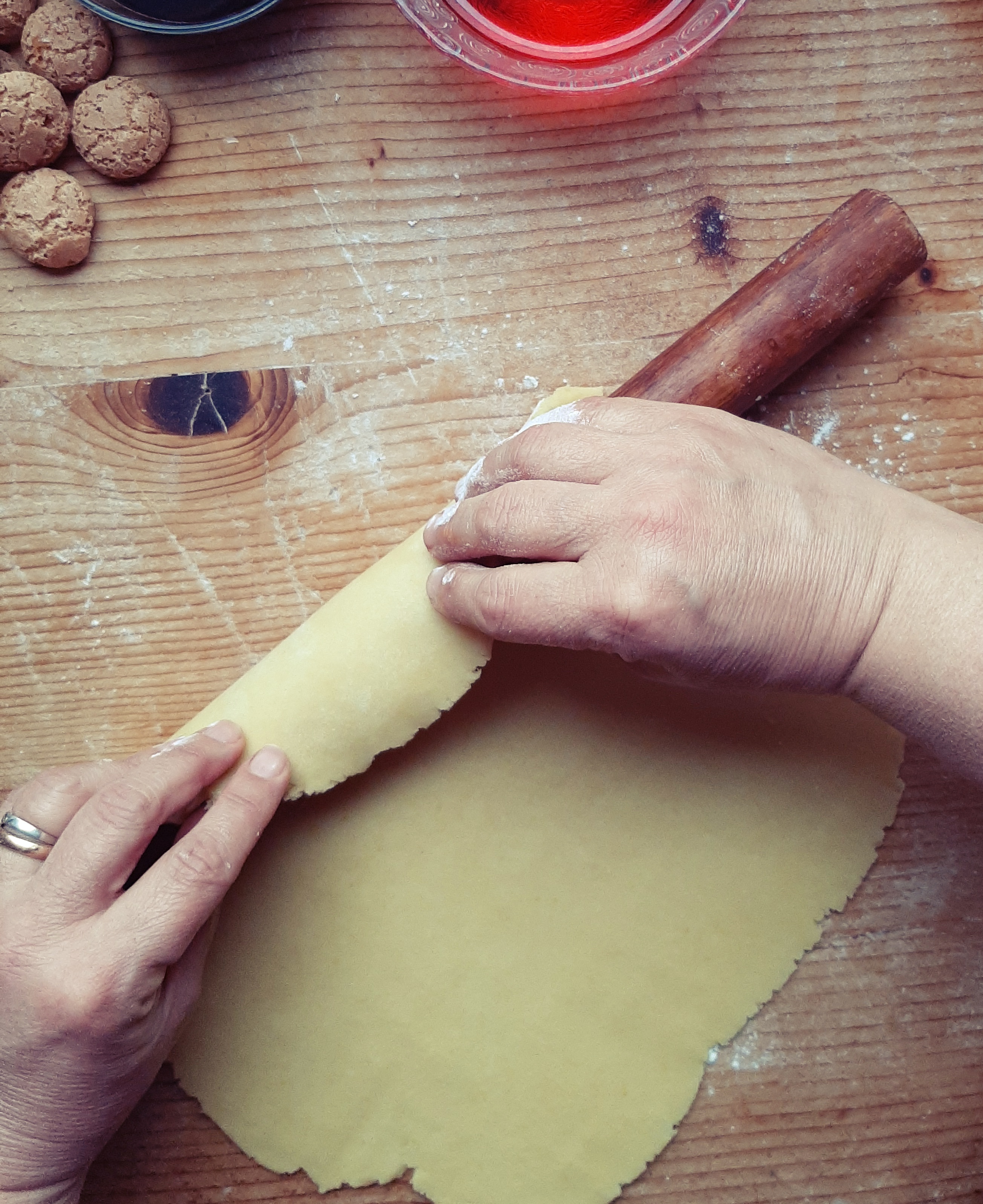 - Stendere la frolla, alta circa mezzo centimetro e rivestire la tortiera (diametro 24) imburrata e infarinata. Bucherellare il fondo con la forchetta, stendere uno strato di marmellata brusca (noi abbiamo usato quella di prugne) e stendere la crema ancora tiepida in modo da facilitare l’operazione. Intingere gli amaretti nell’alchermes e posizionarli sulla crema in cerchi concentrici.