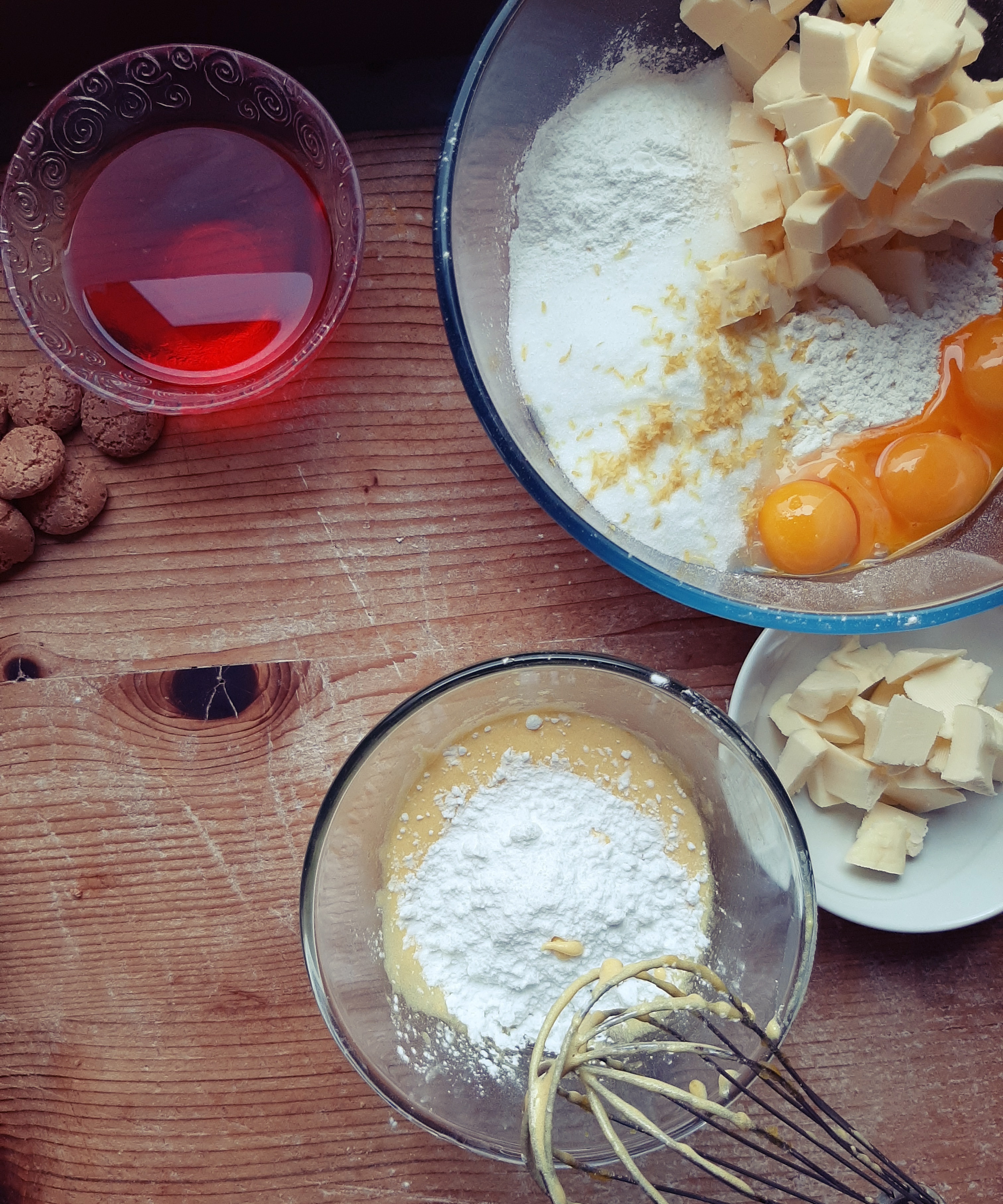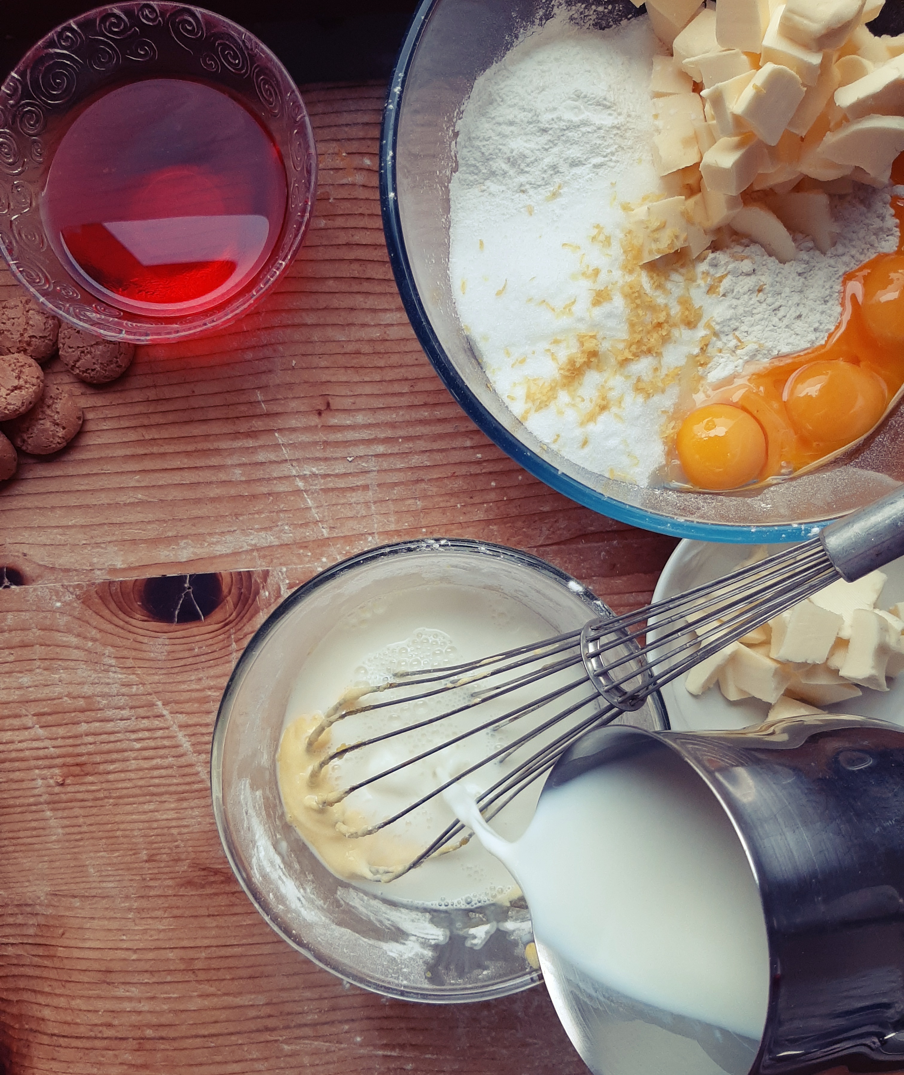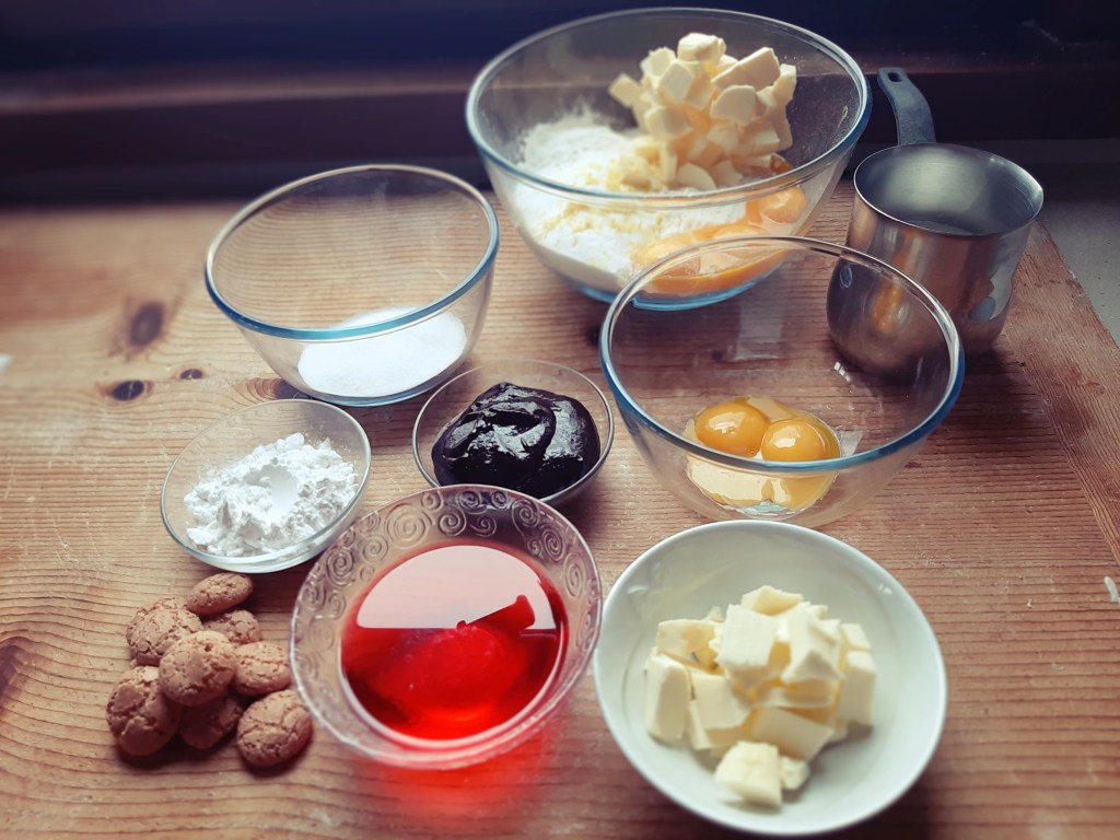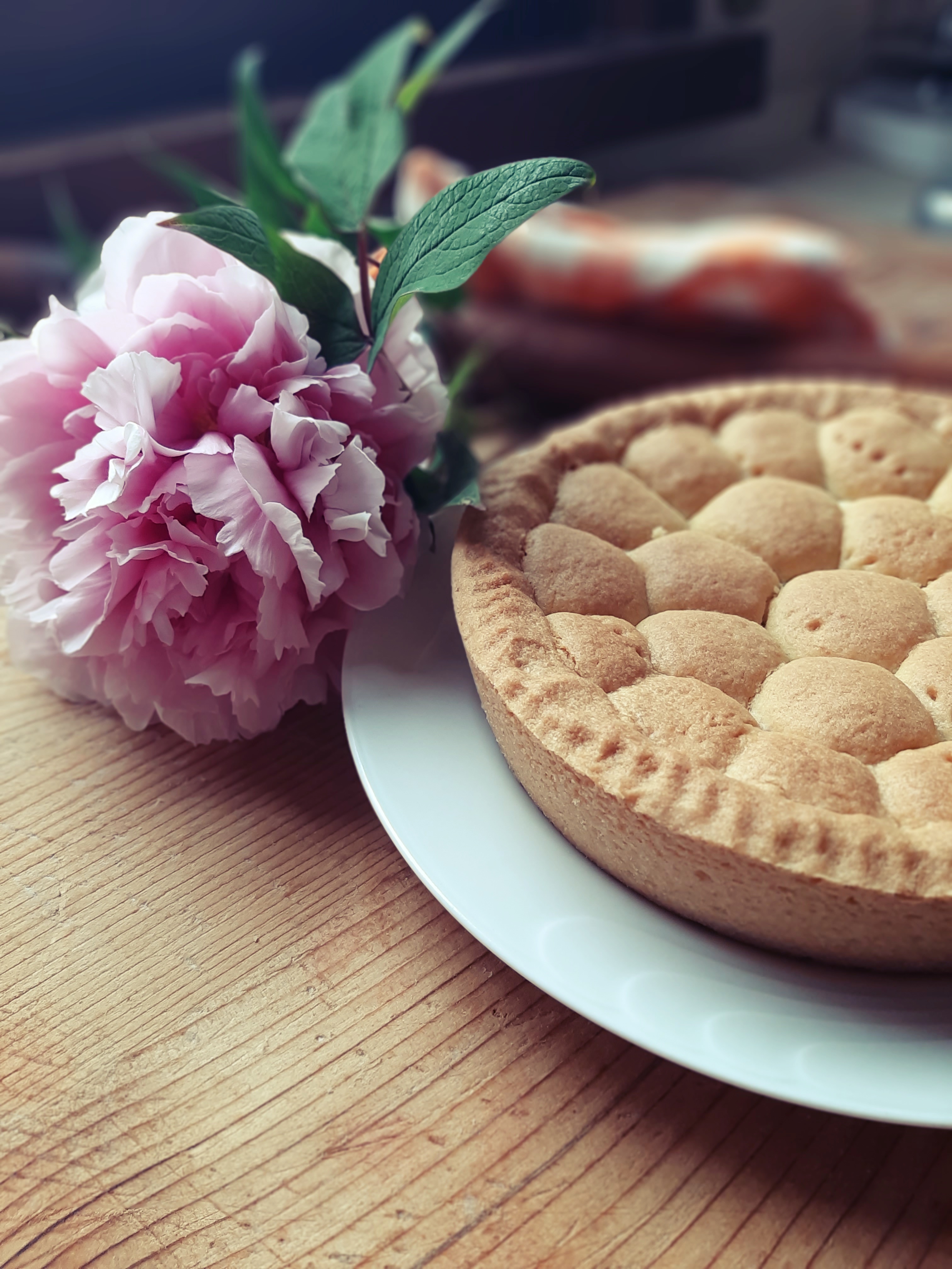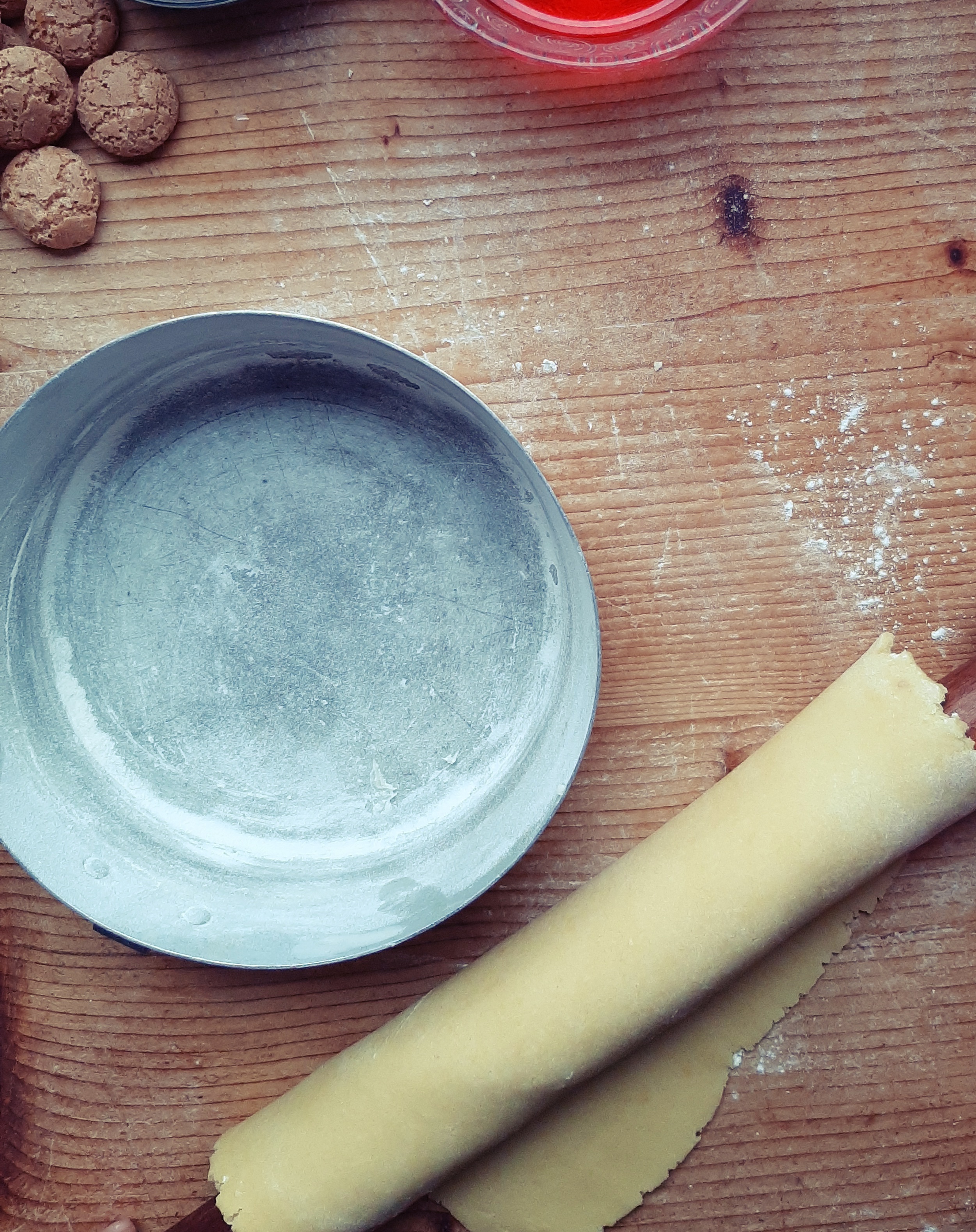- Stendere la frolla, alta circa mezzo centimetro e rivestire la tortiera (diametro 24) imburrata e infarinata. Bucherellare il fondo con la forchetta, stendere uno strato di marmellata brusca (noi abbiamo usato quella di prugne) e stendere la crema ancora tiepida in modo da facilitare l’operazione. Intingere gli amaretti nell’alchermes e posizionarli sulla crema in cerchi concentrici.