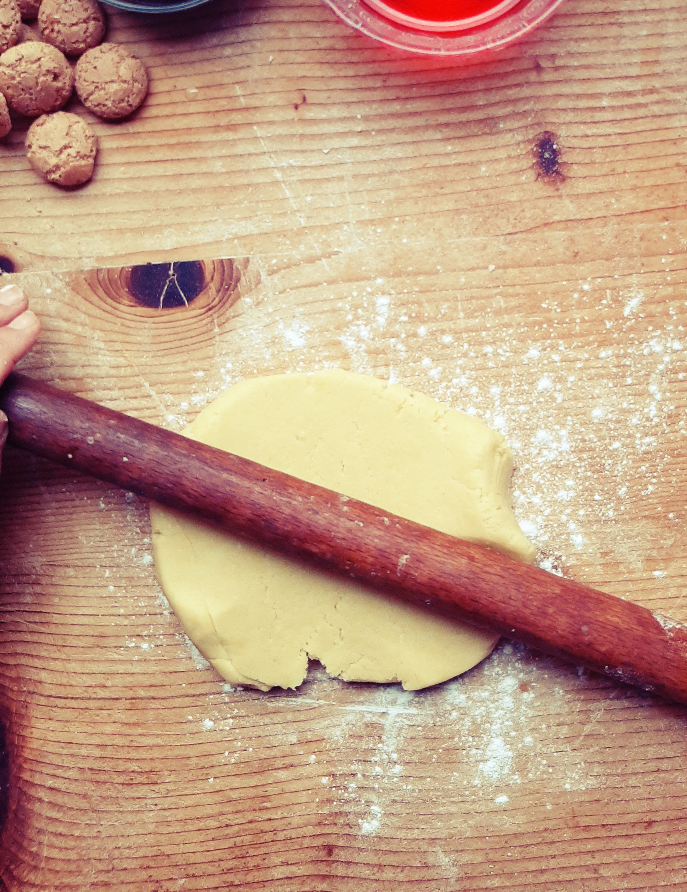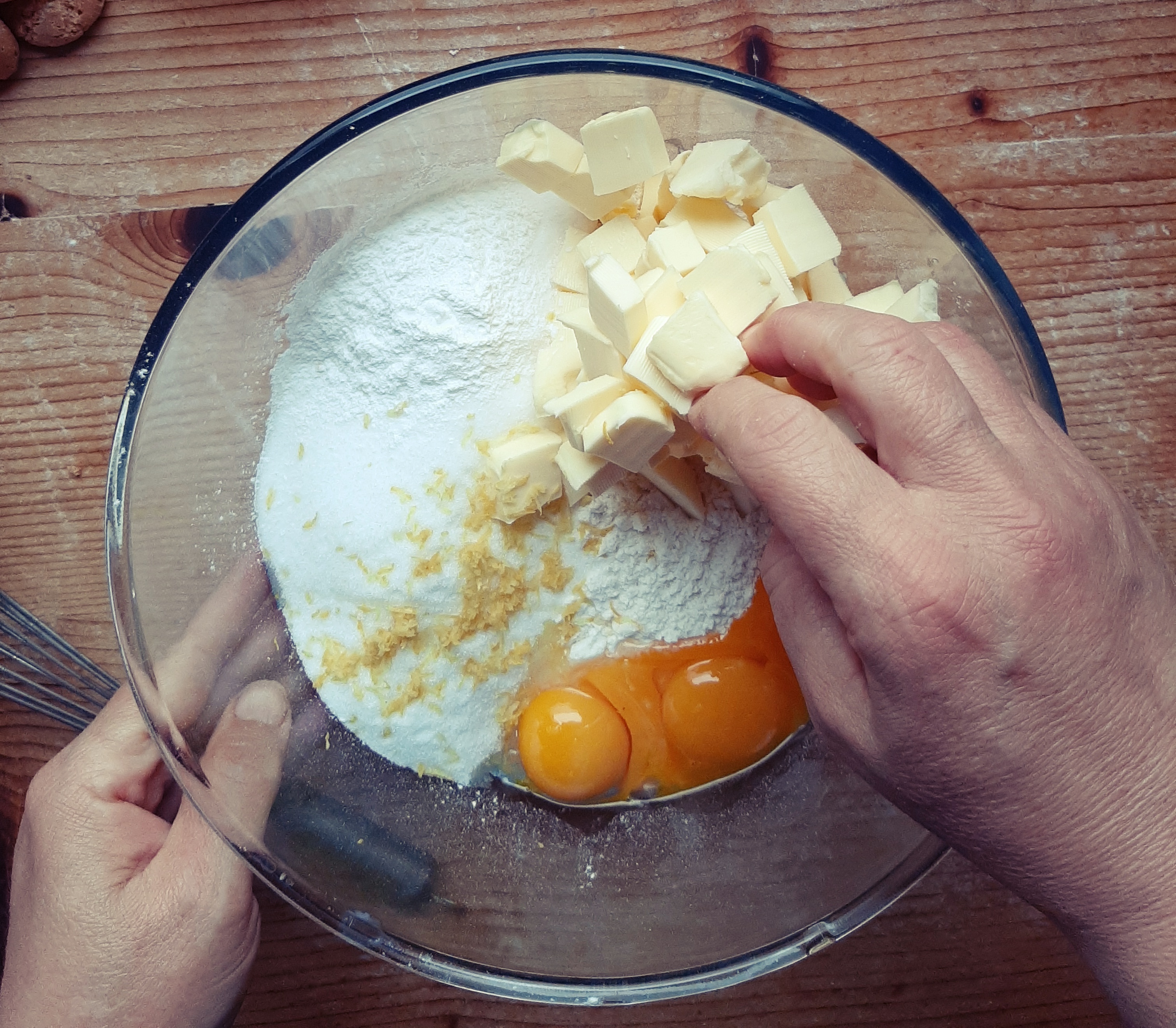 - Impastare tutti gli ingredienti e mettere in pellicola in frigo a riposare.