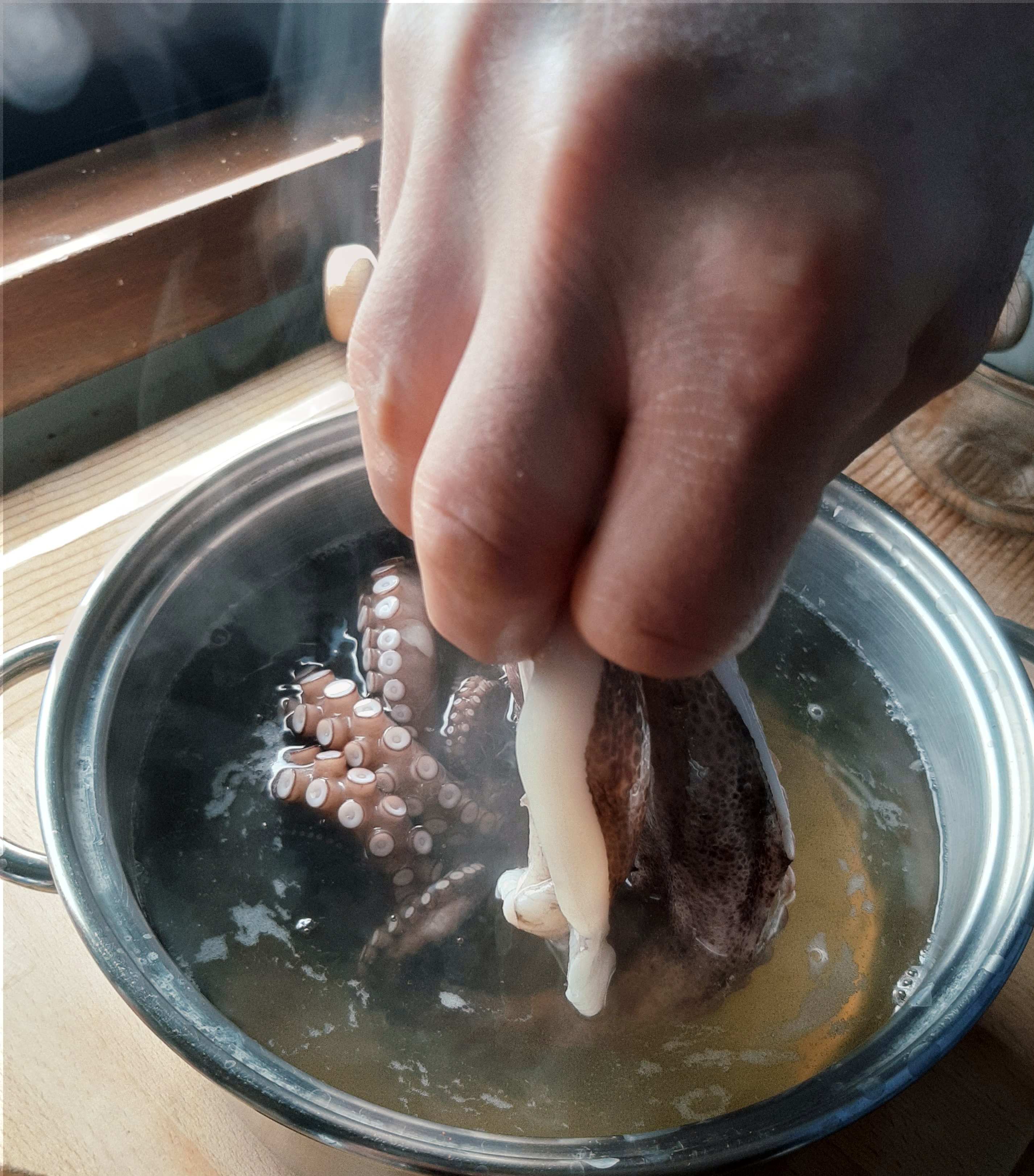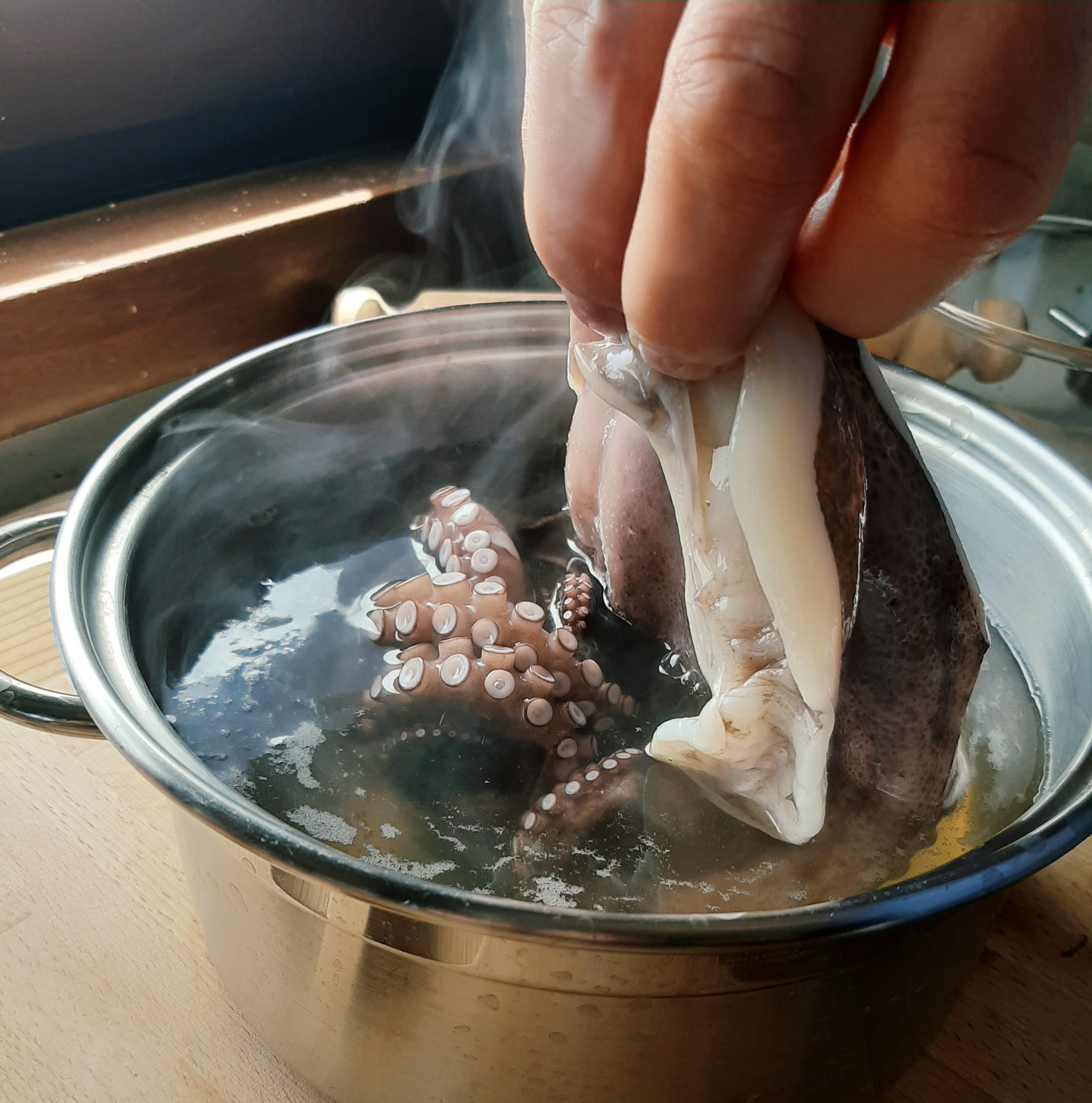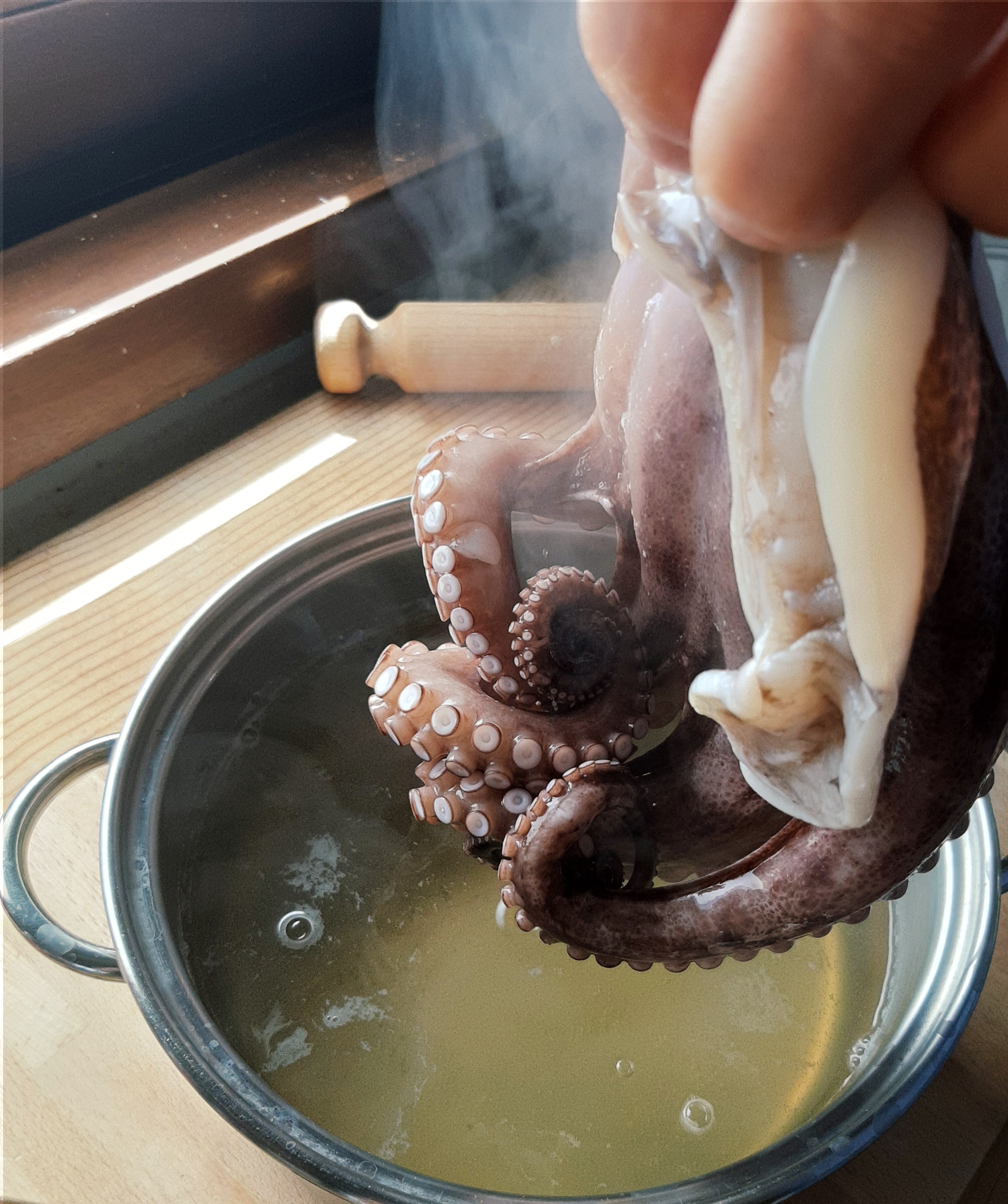 - Portare a bollore dell’acqua in una pentola e intingere i tentacoli più volte fino a farli arricciare.