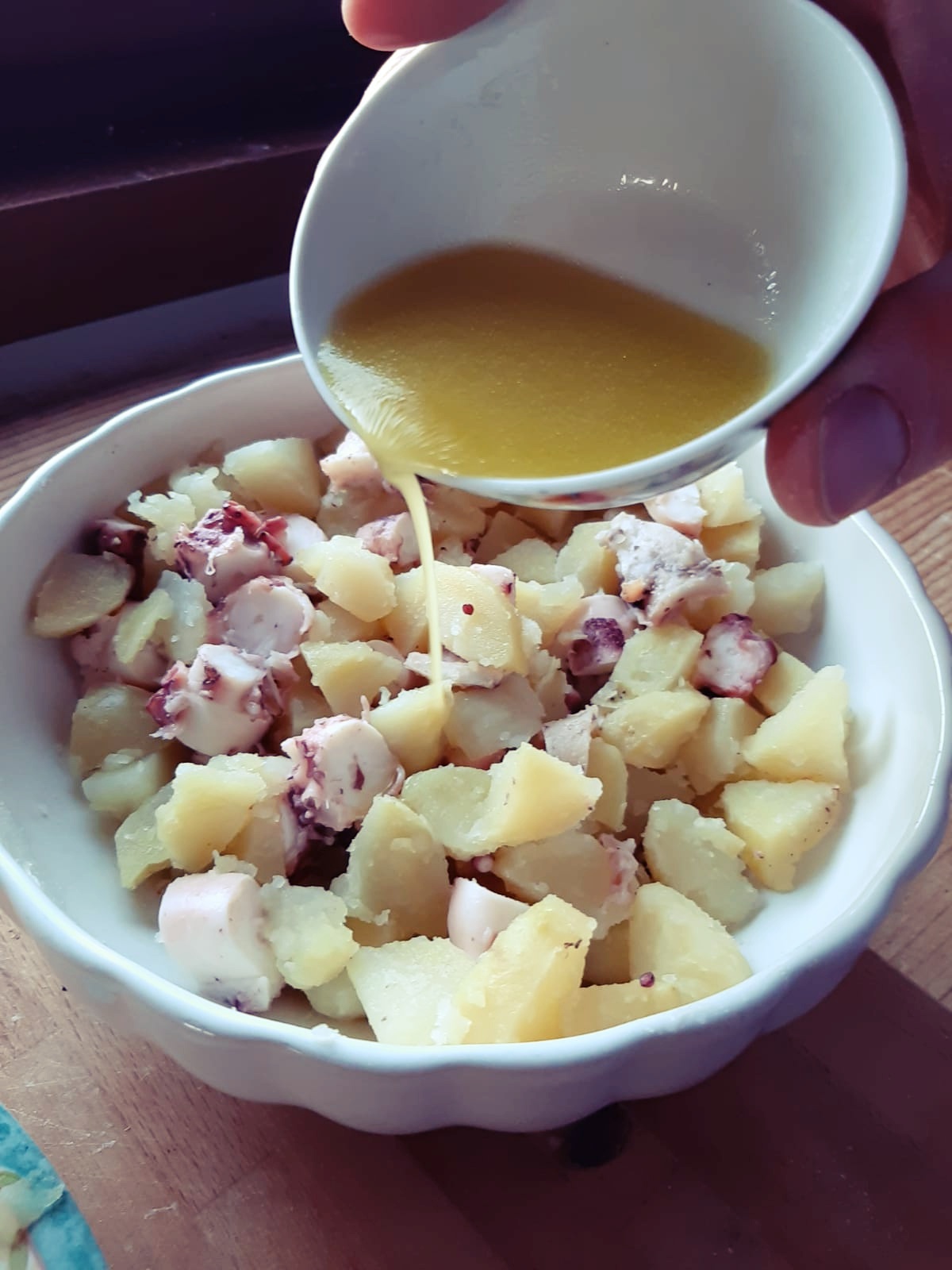 - Tagliamo il polpo e le patate a pezzi di dimensioni simili e condiamo il tutto con una citronette, ottenuta sbattendo con una forchetta olio extra vergine, succo di limone e un pizzico di sale.