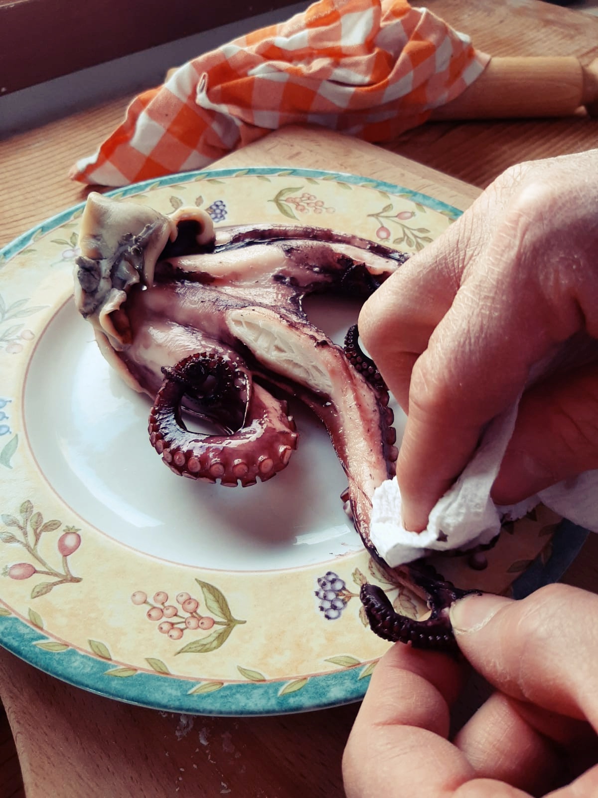 - Io uso una vaporiera con timer, se usate una pentola con il cestello, controllate ogni tanto il livello dell’acqua. Far cuocere circa un’ora e lasciare intiepidire coperto; ancora tiepido passiamo uno scottex strofinando il polpo delicatamente, pulendolo dalla pelle rossastra.