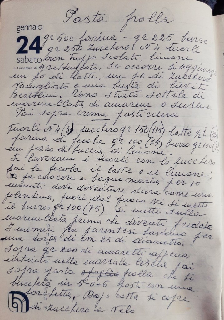 La scrittura è quella delle nostre nonne, che fa sognare e viaggiare con la mente anche solo leggendo il titolo… e in effetti la Signora Elda Cavalca, classe 1918 (nella foto con il marito Carlo Adorni), ci ha permesso in questo modo di entrare in un mondo lontano, dove le uova si raccoglievano nell’aia, gli albumi si chiamavano “chiare” e l’immancabile vanillina si acquistava non a grammi ma a lire.