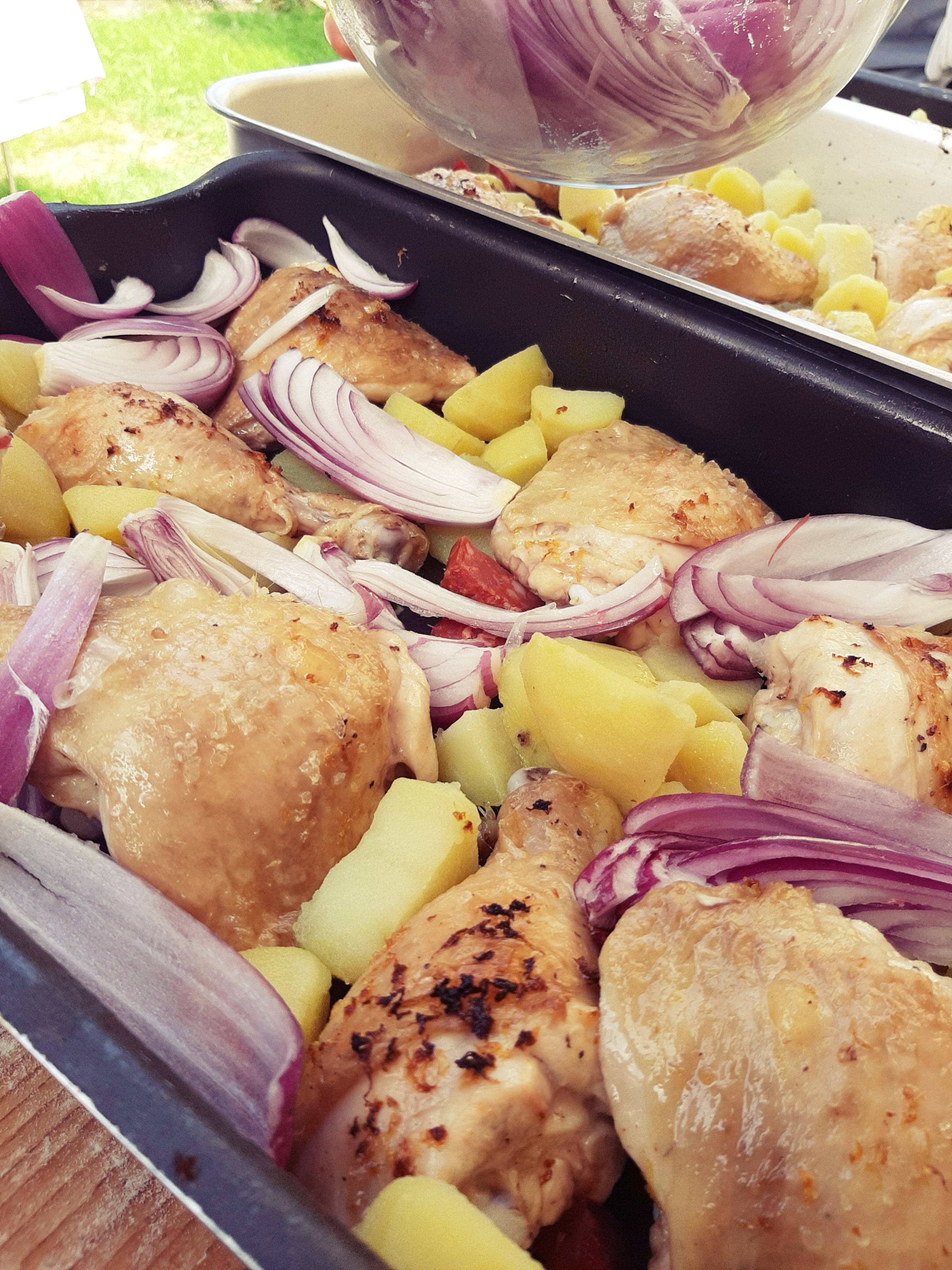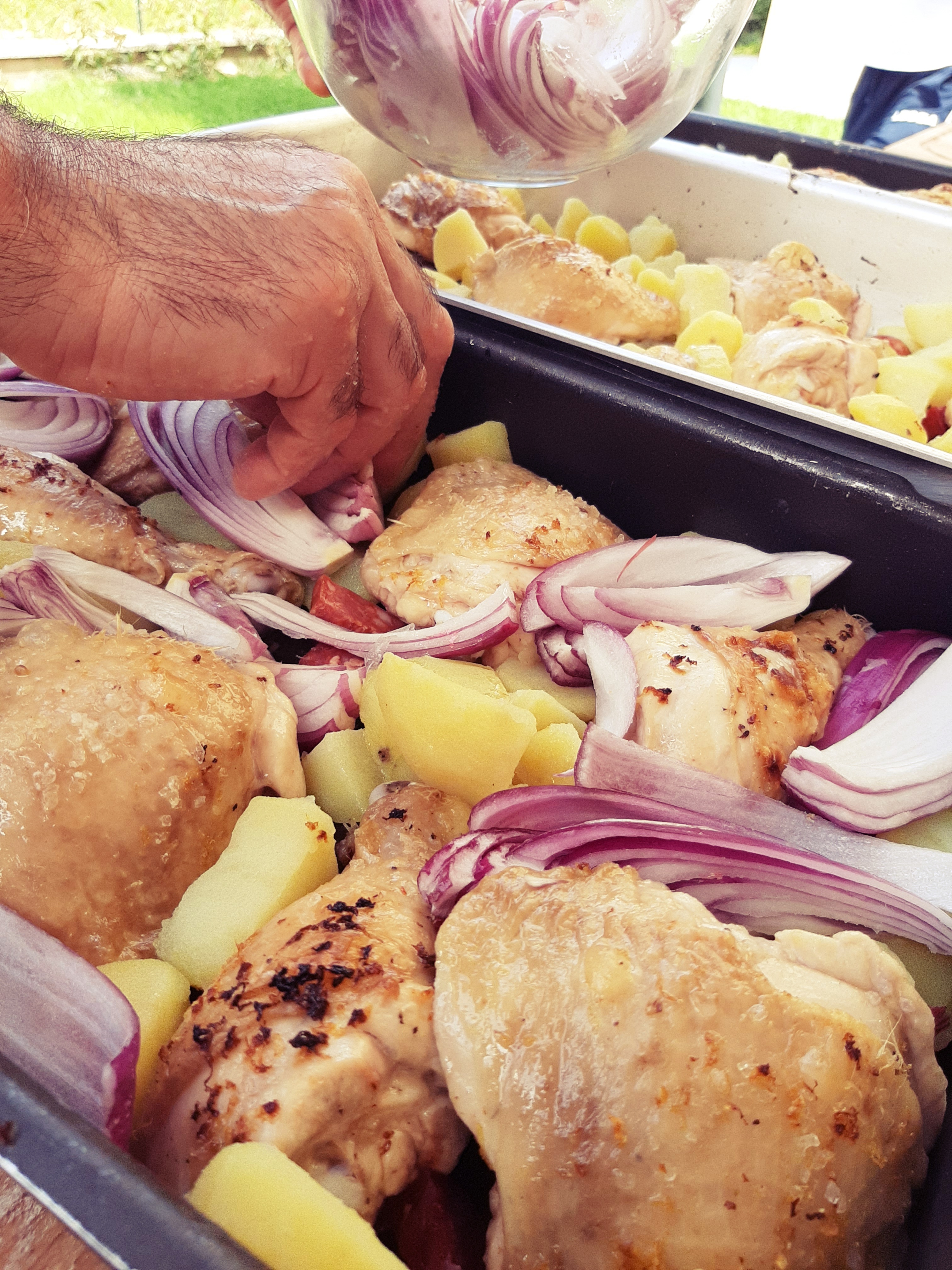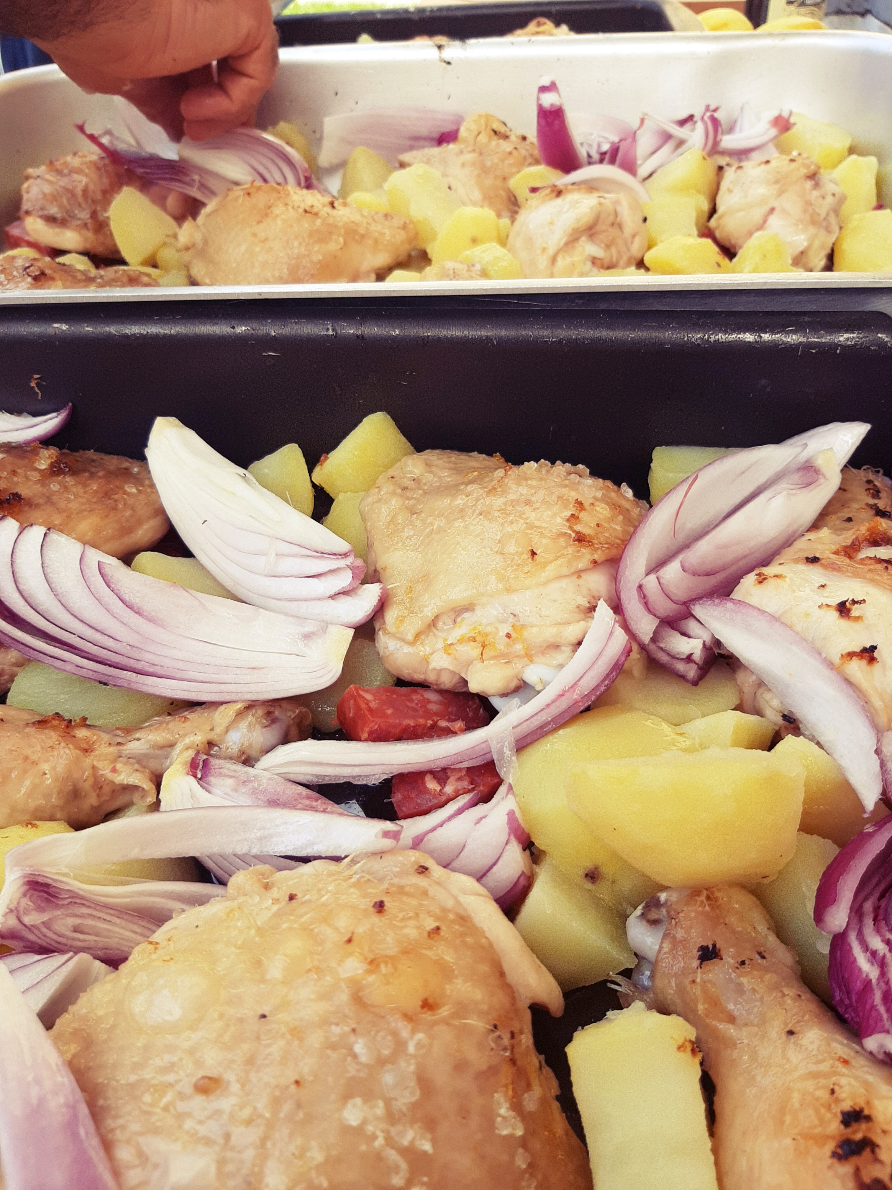 - Passati i 20 minuti, tiriamo fuori il pollo dal forno e sistemiamo il resto degli ingredienti in questo modo: le patate ben distribuite nella teglia, la salsiccia sotto il pollo in modo che non secchi troppo durante la cottura e le cipolle non in superficie ma “incastrate” tra il pollo e le patate cosicché l’umidità le mantenga comunque morbide.