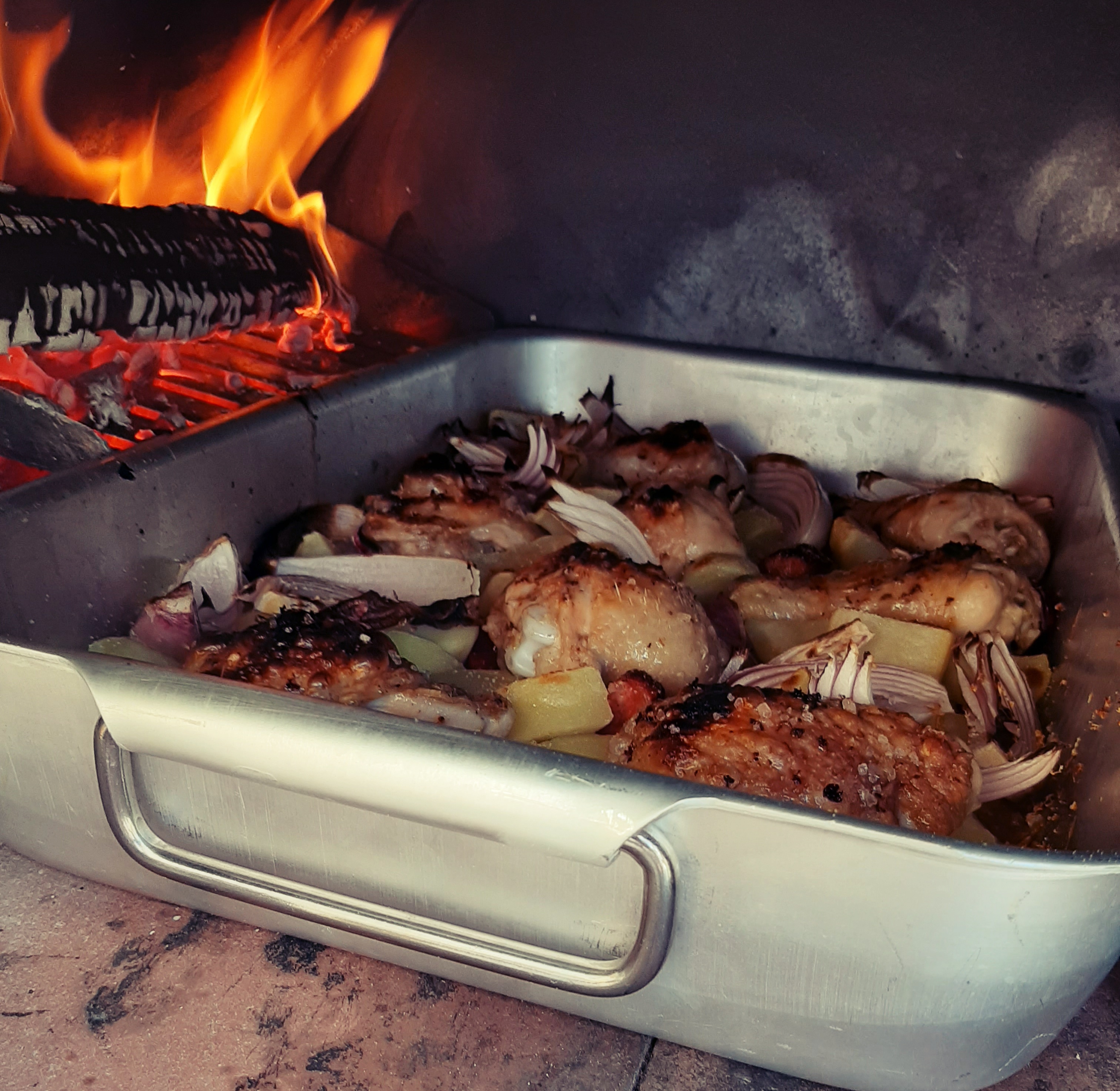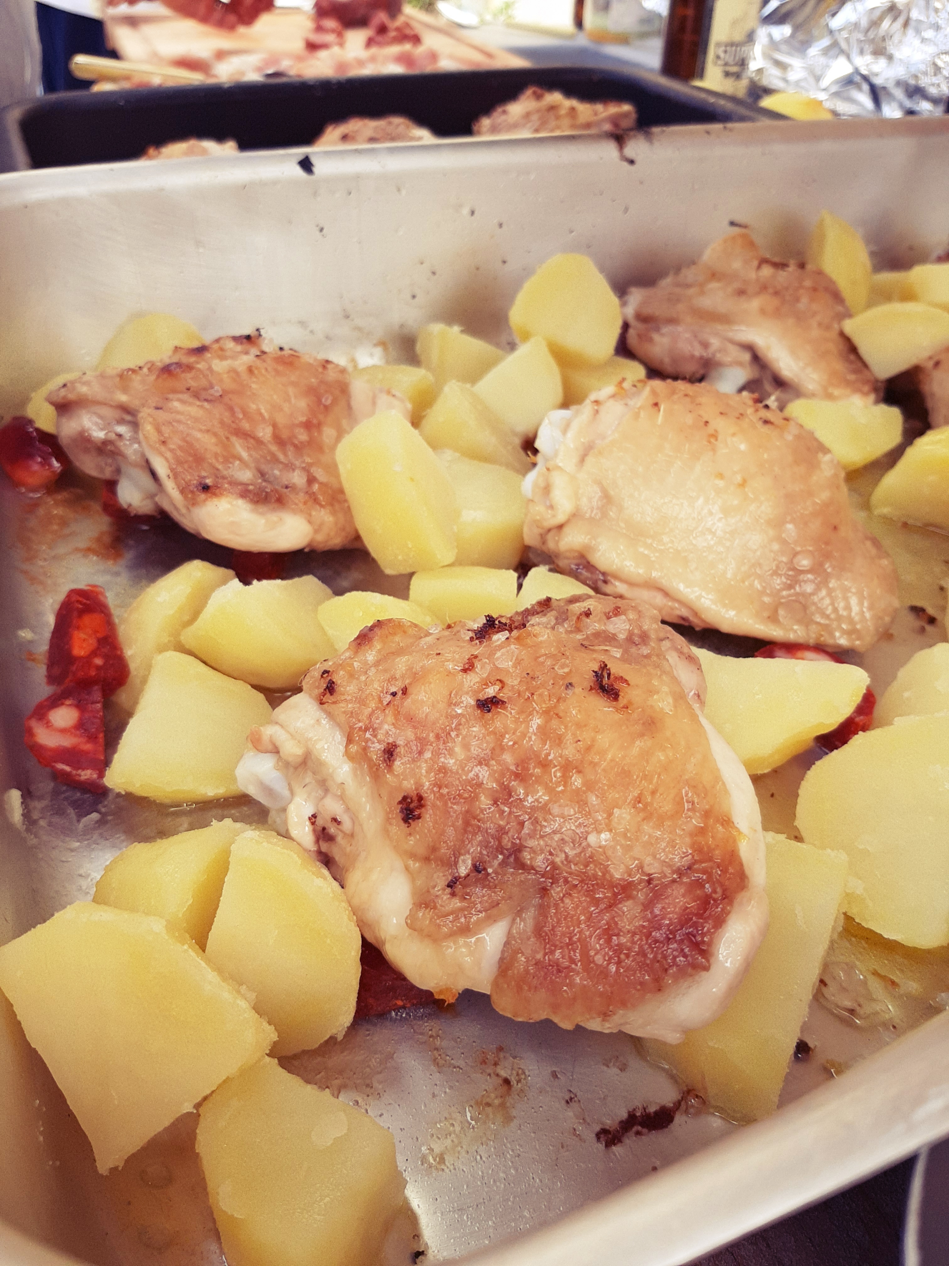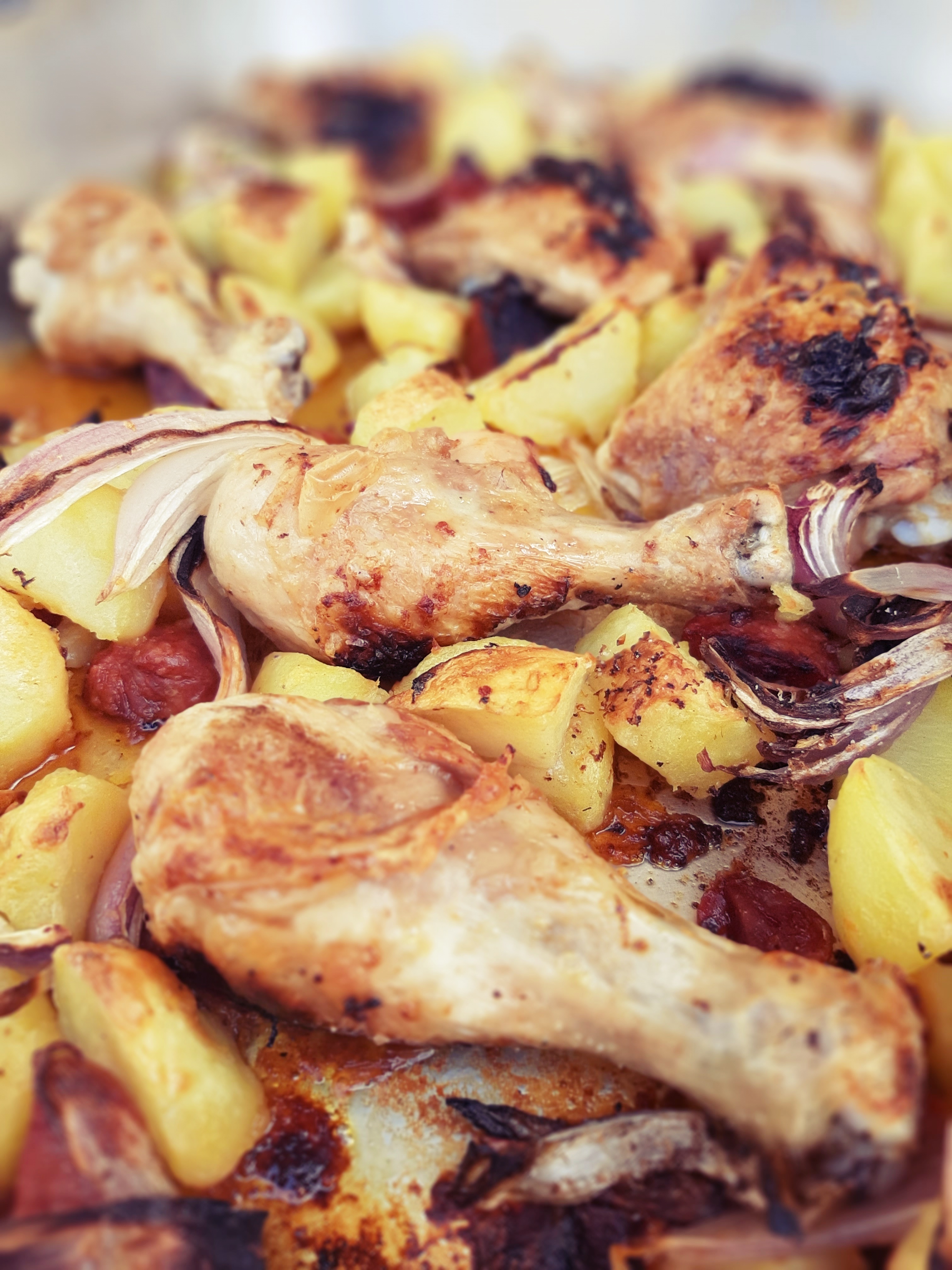 - Passati i 20 minuti, tiriamo fuori il pollo dal forno e sistemiamo il resto degli ingredienti in questo modo: le patate ben distribuite nella teglia, la salsiccia sotto il pollo in modo che non secchi troppo durante la cottura e le cipolle non in superficie ma “incastrate” tra il pollo e le patate cosicché l’umidità le mantenga comunque morbide.