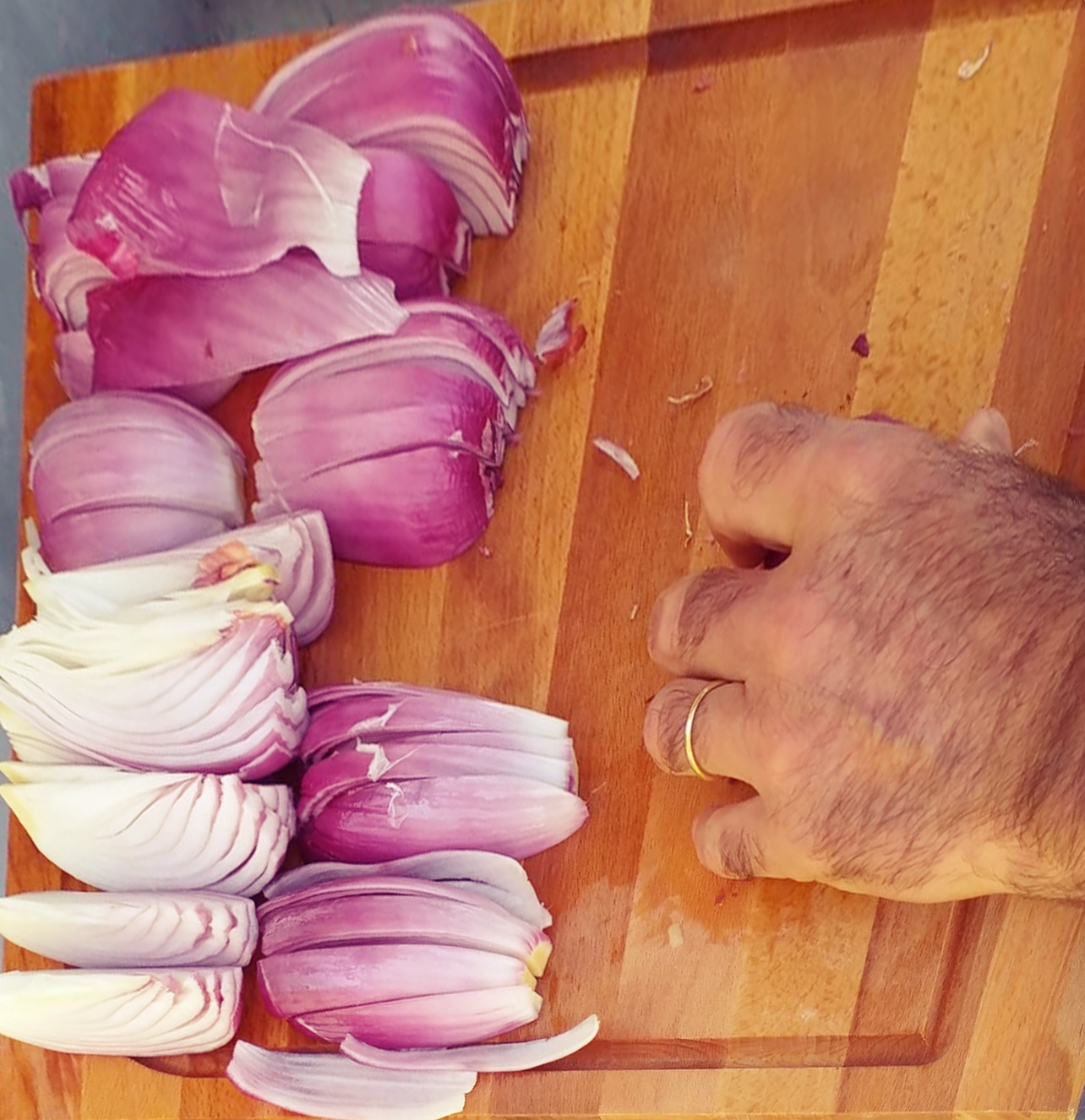 - Intanto che il pollo è in forno e le patate sono state già precotte, prepariamo le cipolle, tagliandole a spicchi abbastanza spessi e la salsiccia piccante, tagliata a dadini di circa 2 cm.