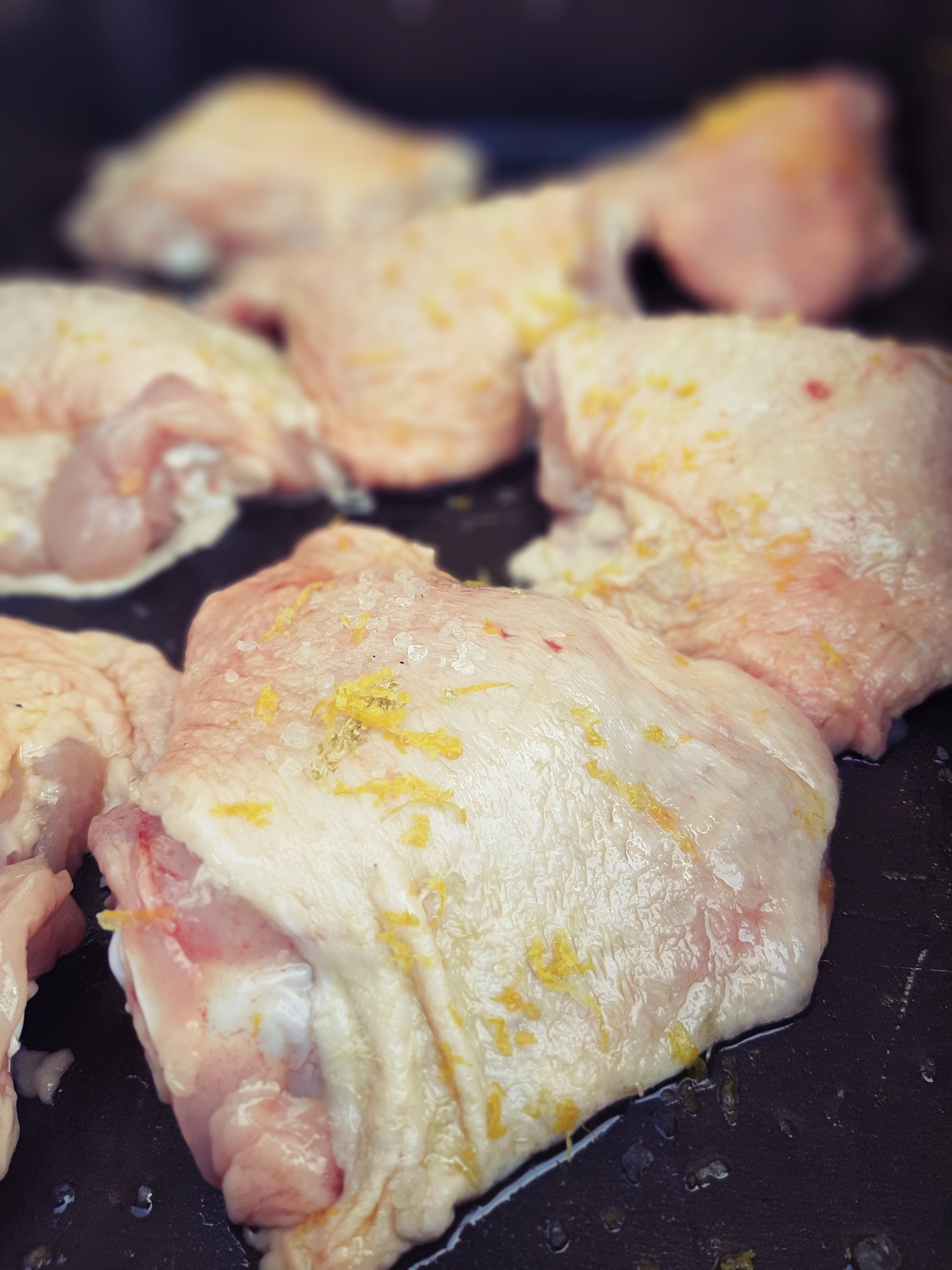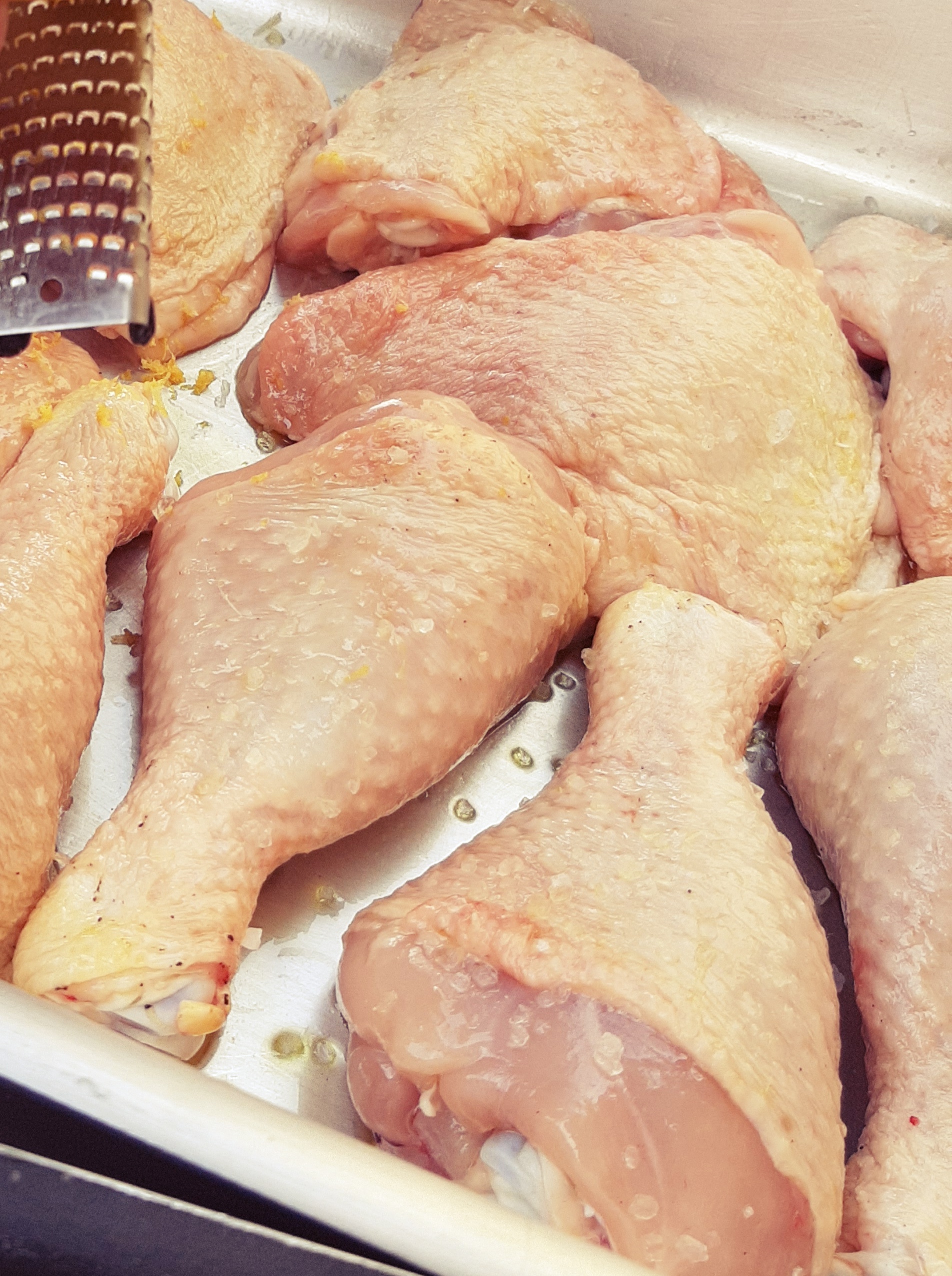 - Con una grattugia fine, grattugiamo la buccia dell’arancio e dei limoni sulle parti del pollo, saliamo con il sale grosso e andiamo in forno a 200°C per 20 minuti circa.