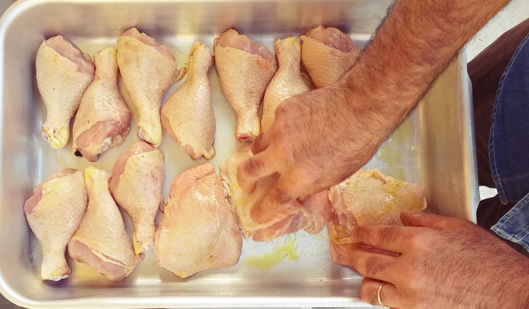 - Nel frattempo irroriamo la teglia con abbondante olio extravergine d’oliva, adagiamo i pezzi di pollo e li massaggiamo leggermente sempre con un goccio d’olio.
