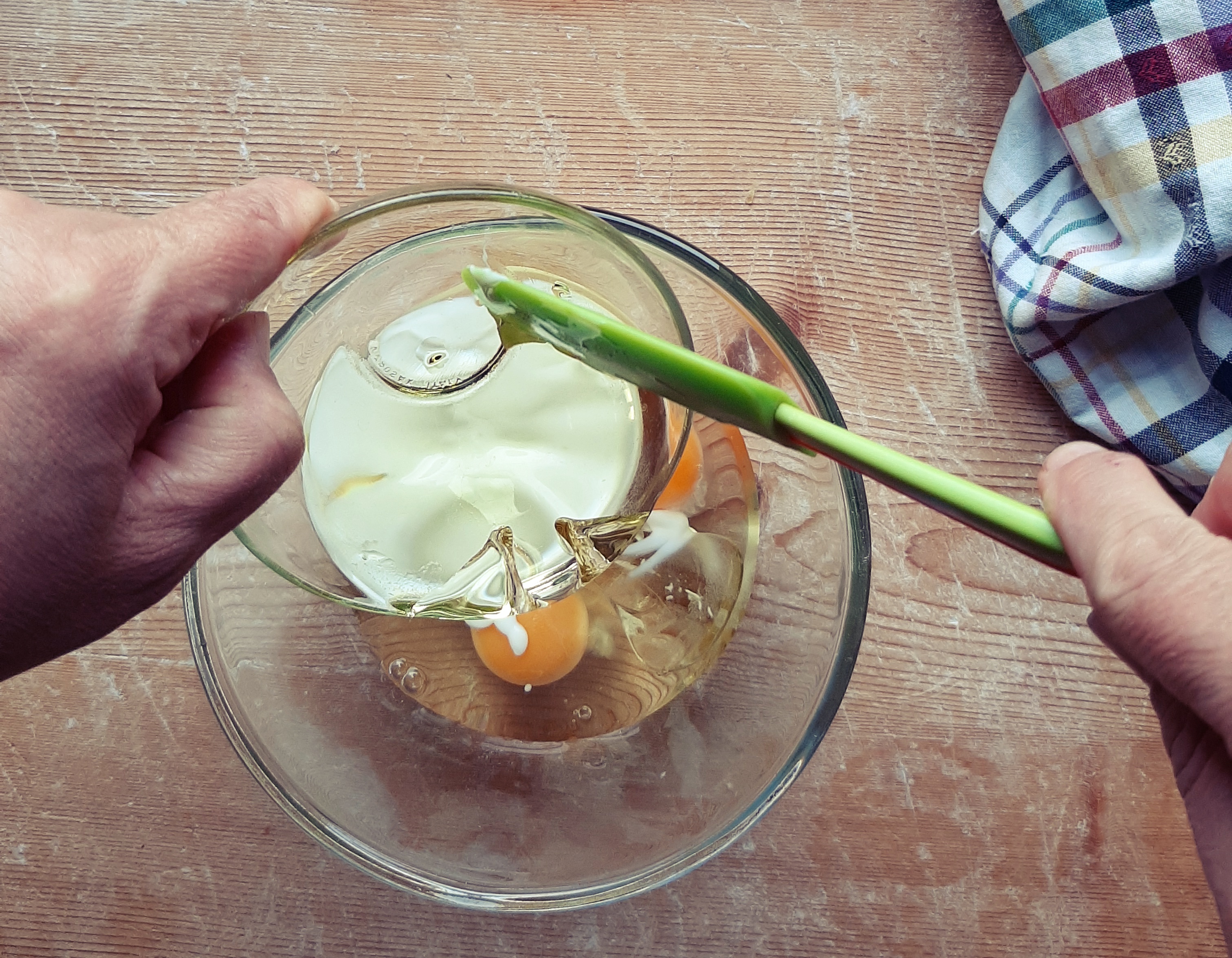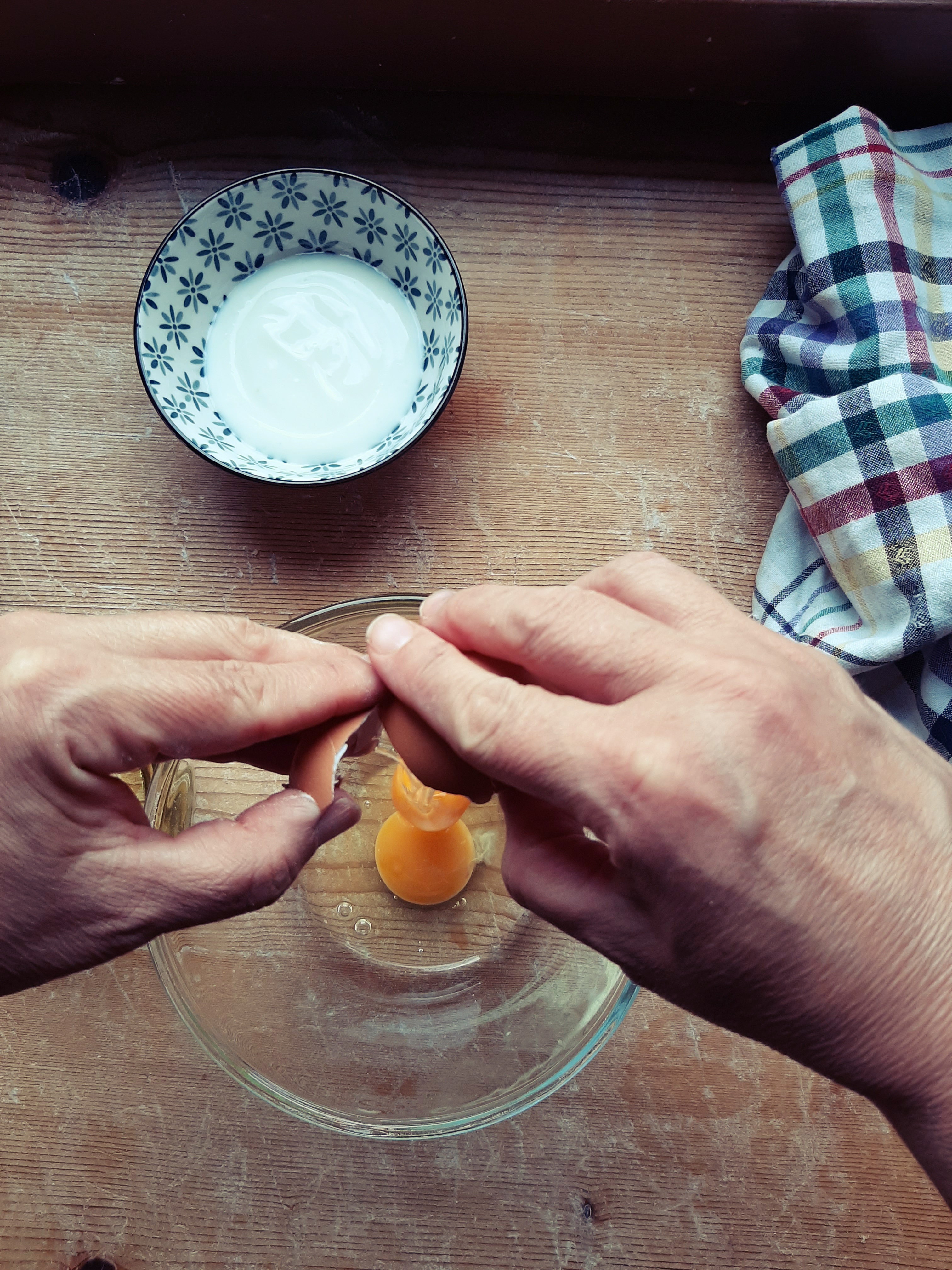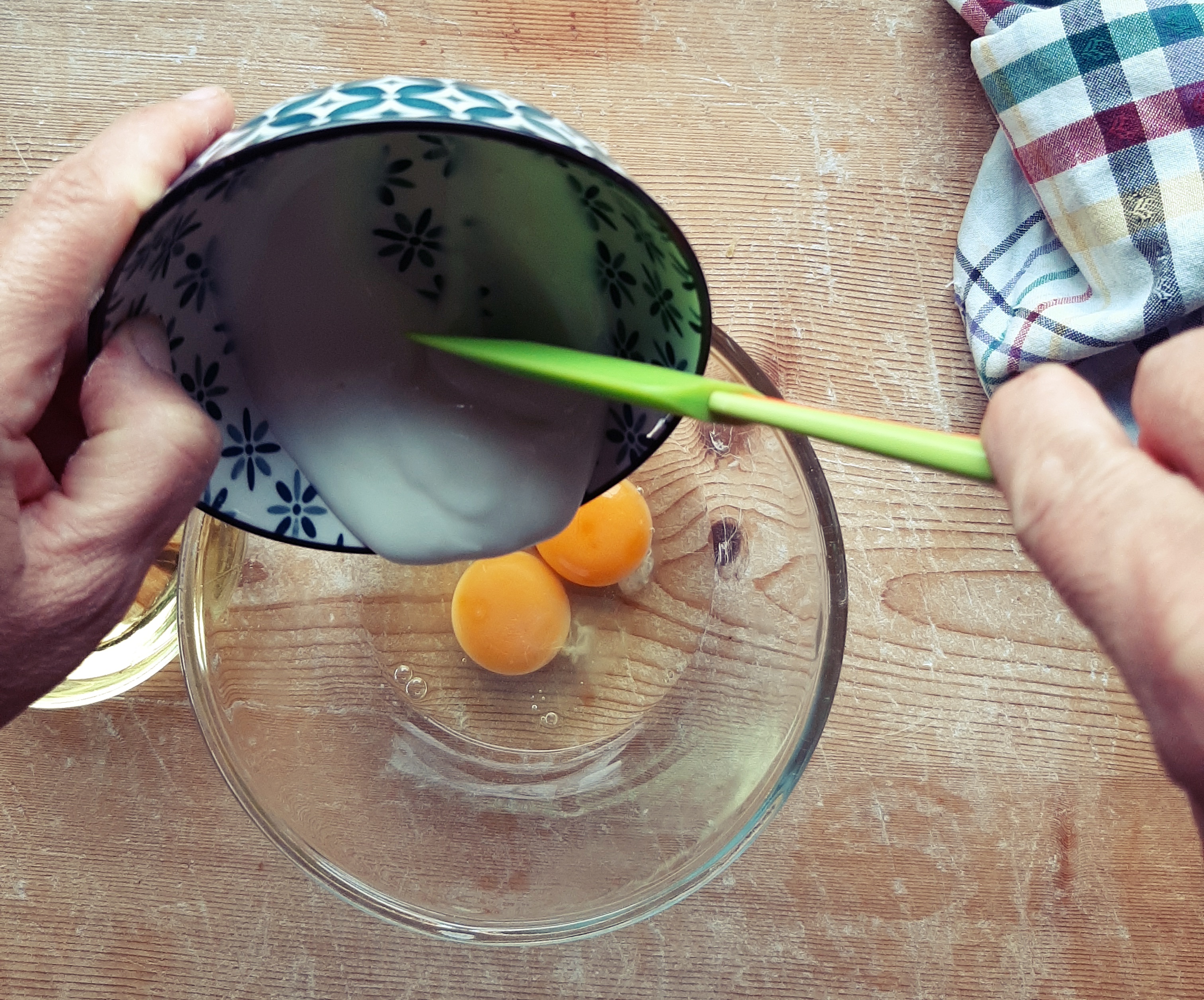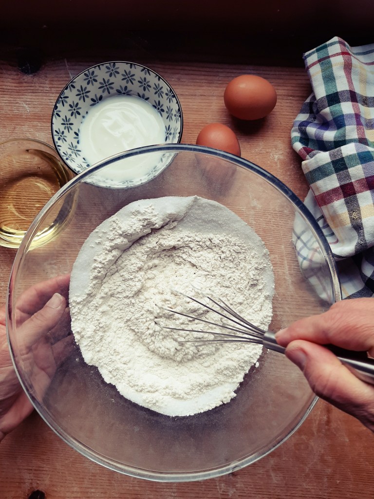 - In un’altra ciotola più piccola miscelare le uova, lo yogurt, l’olio e il sale.