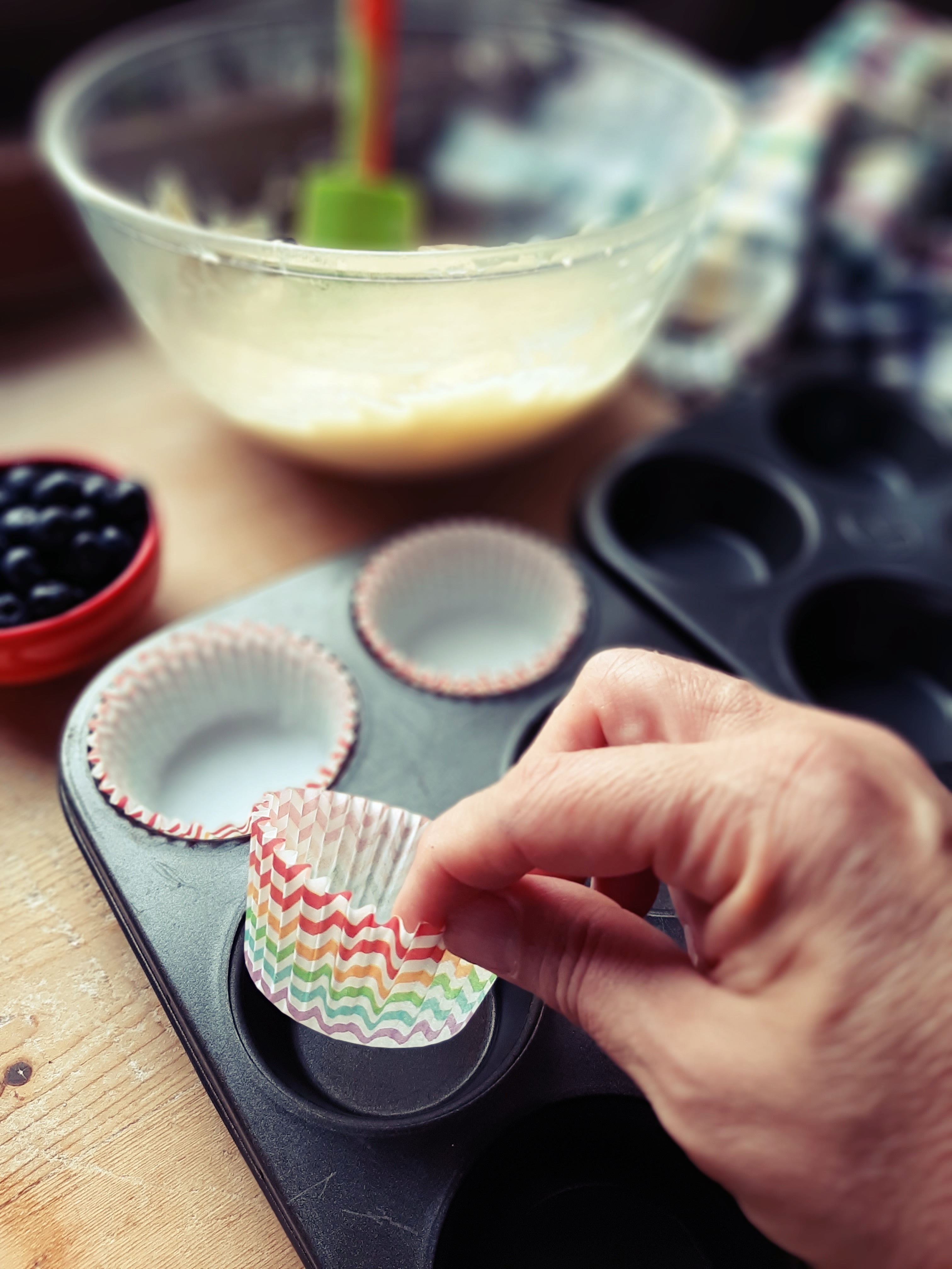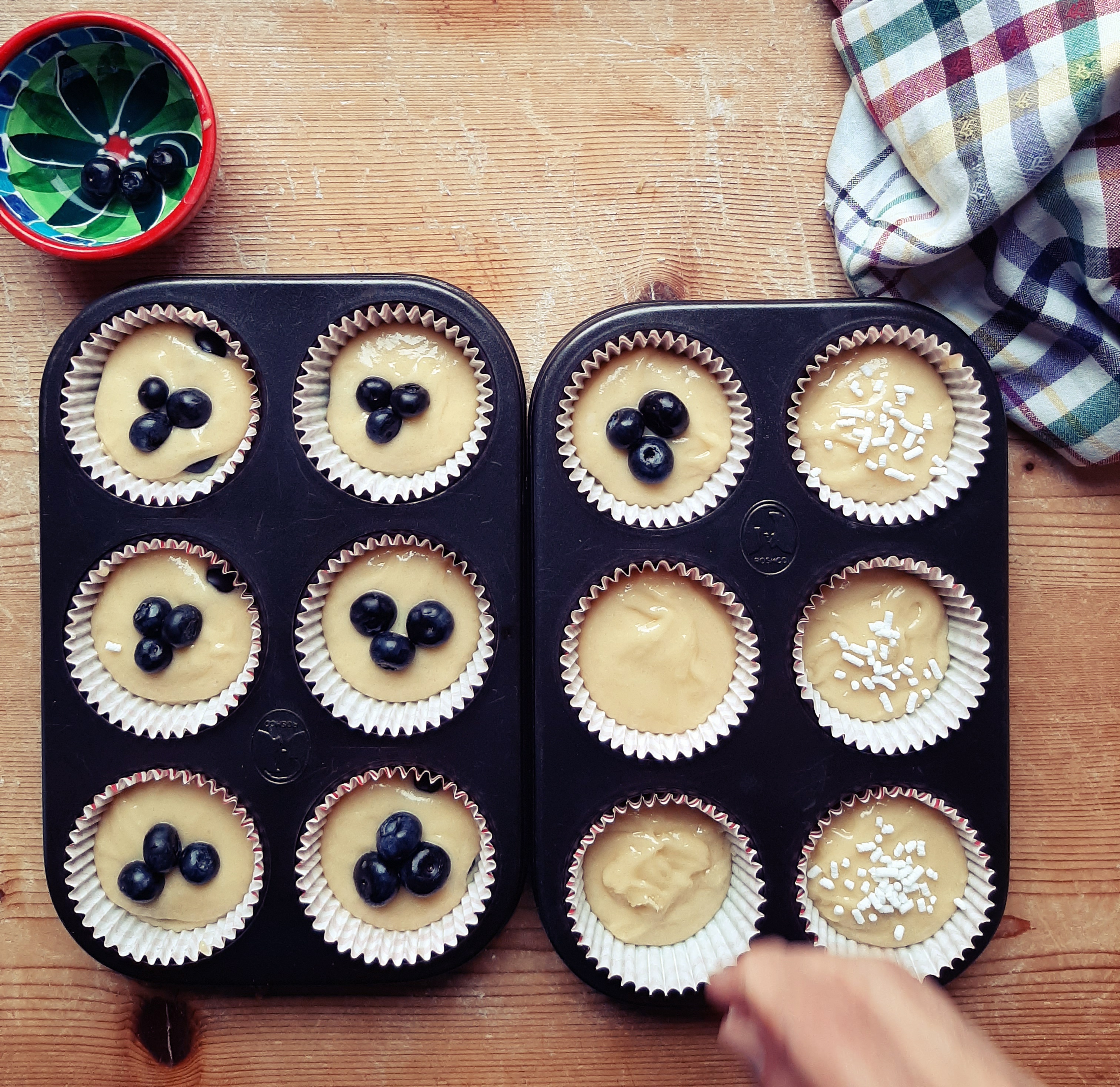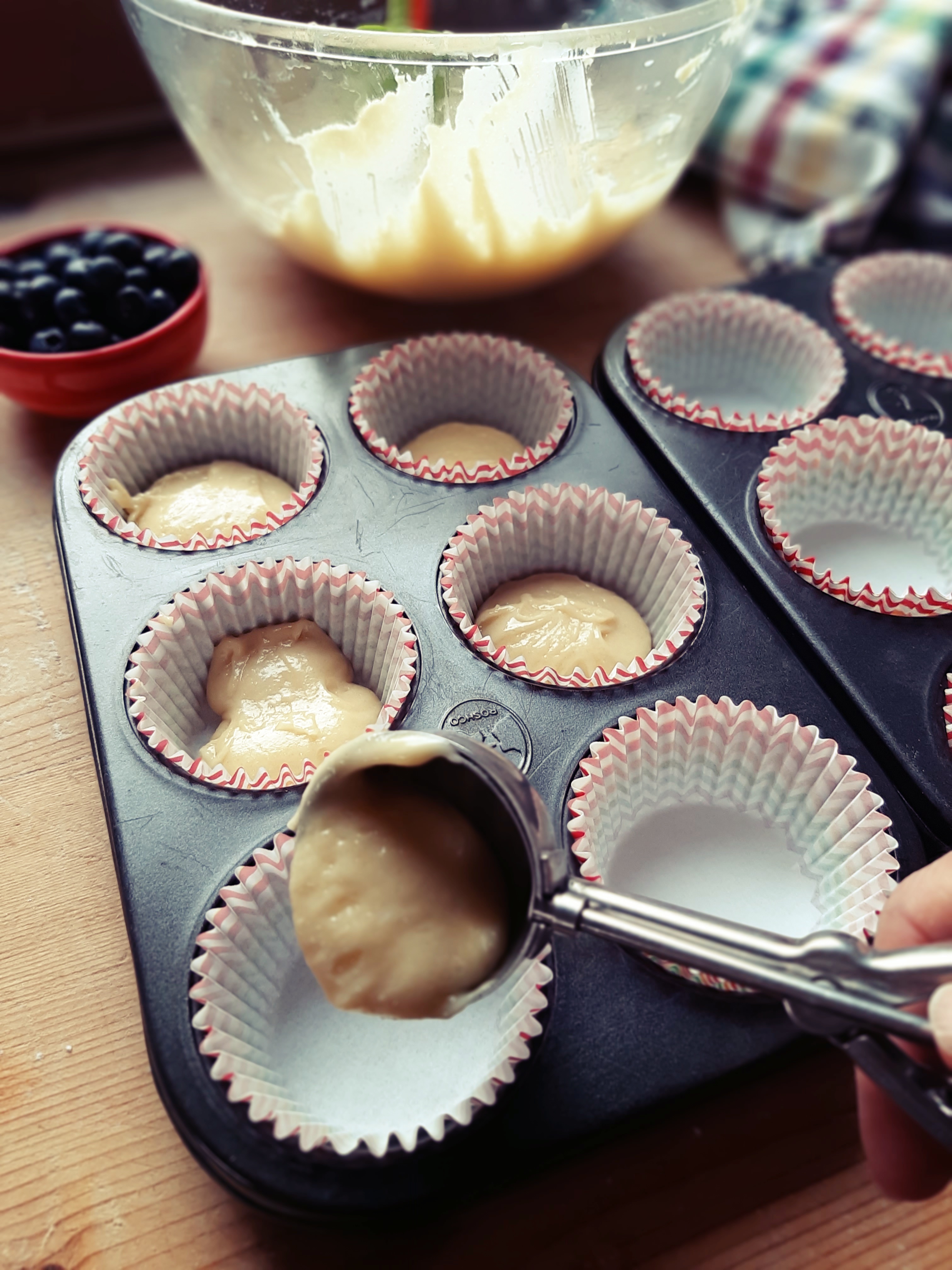 - Posizionare i pirottini negli stampi da muffin e con un dosatore per gelato, mettere una piccola parte di impasto sul fondo. Aggiungere i mirtilli (o altro) e riempire a 3/4 con un altro pò di impasto e finire con qualche altro mirtillo sopra.