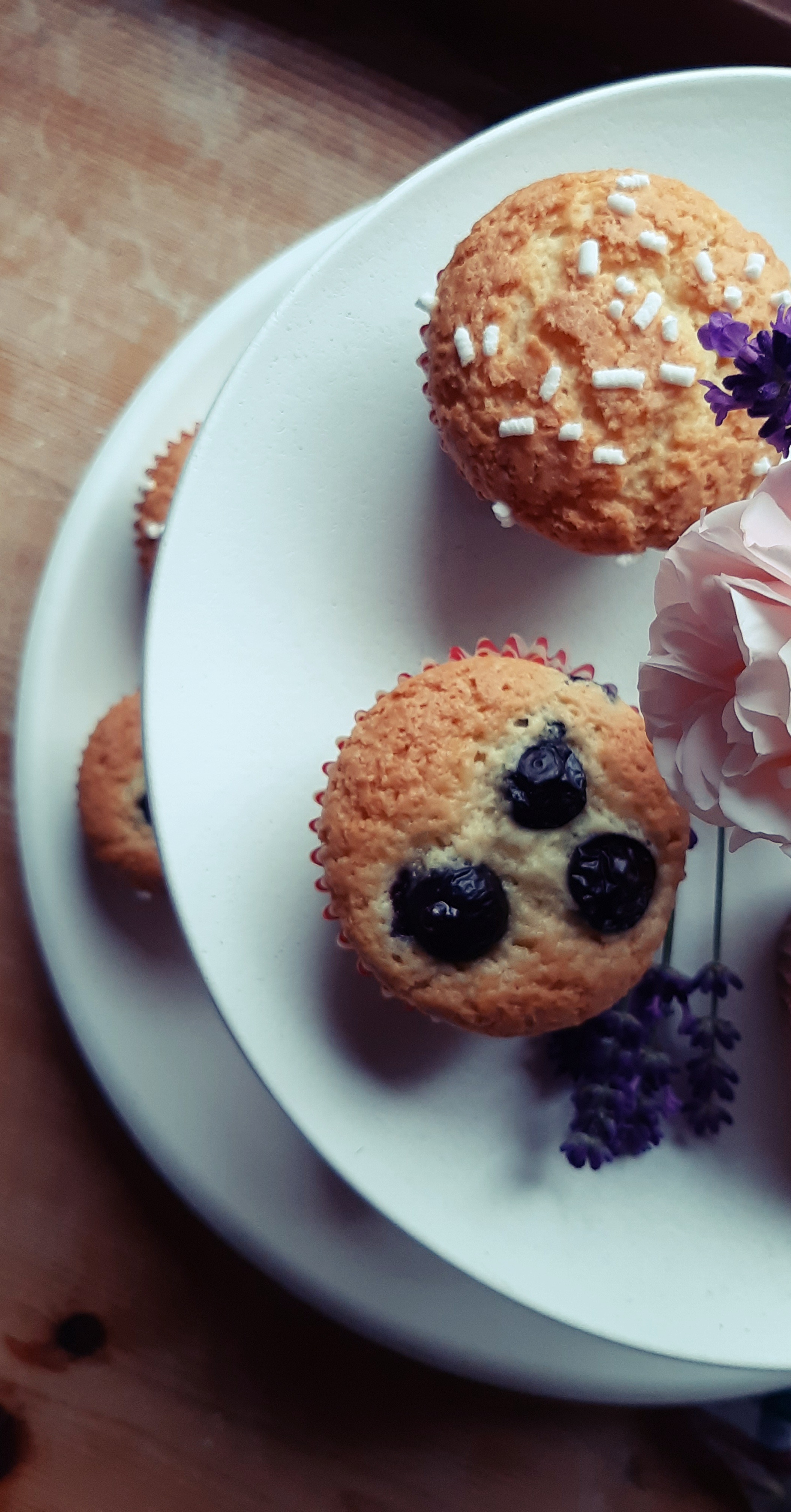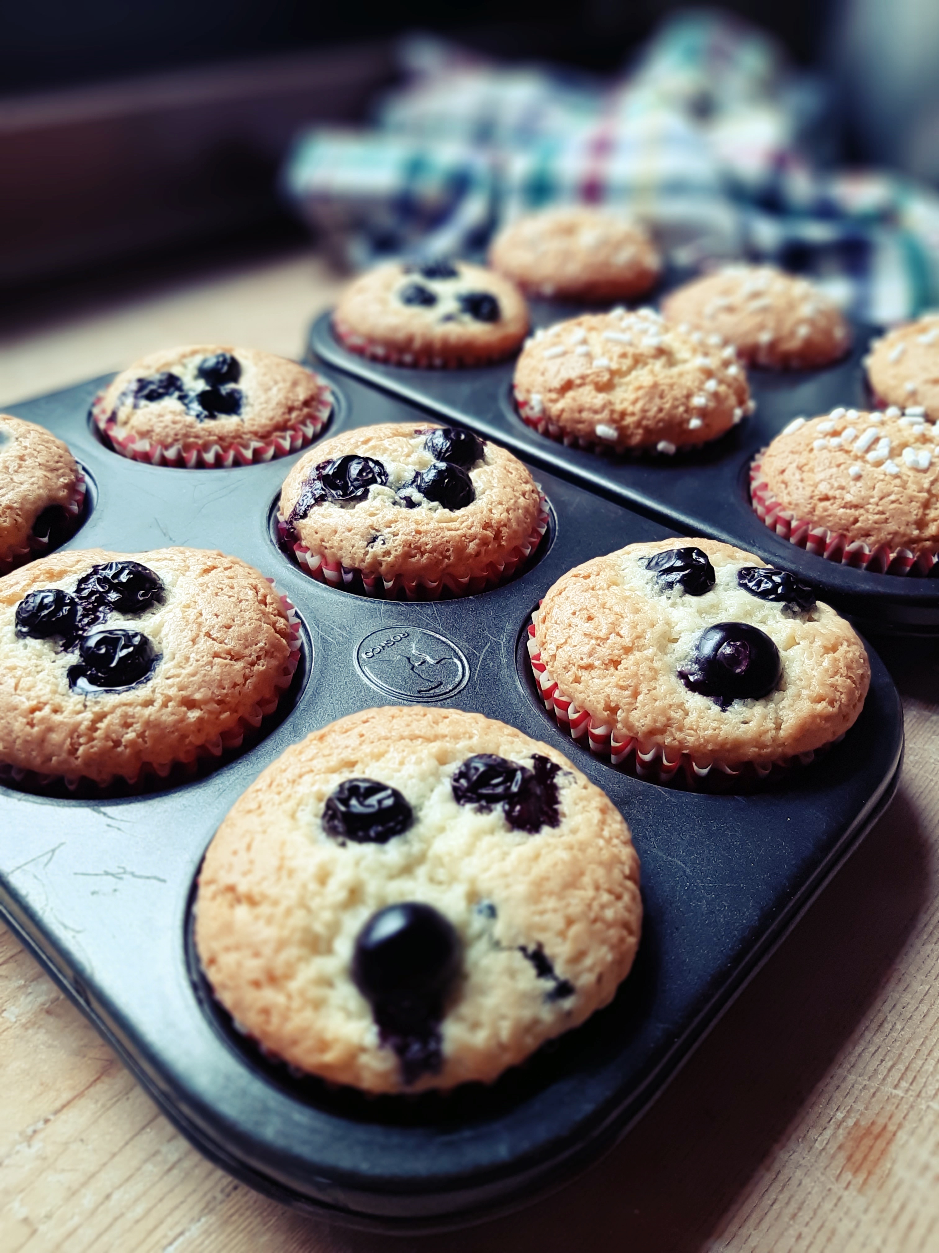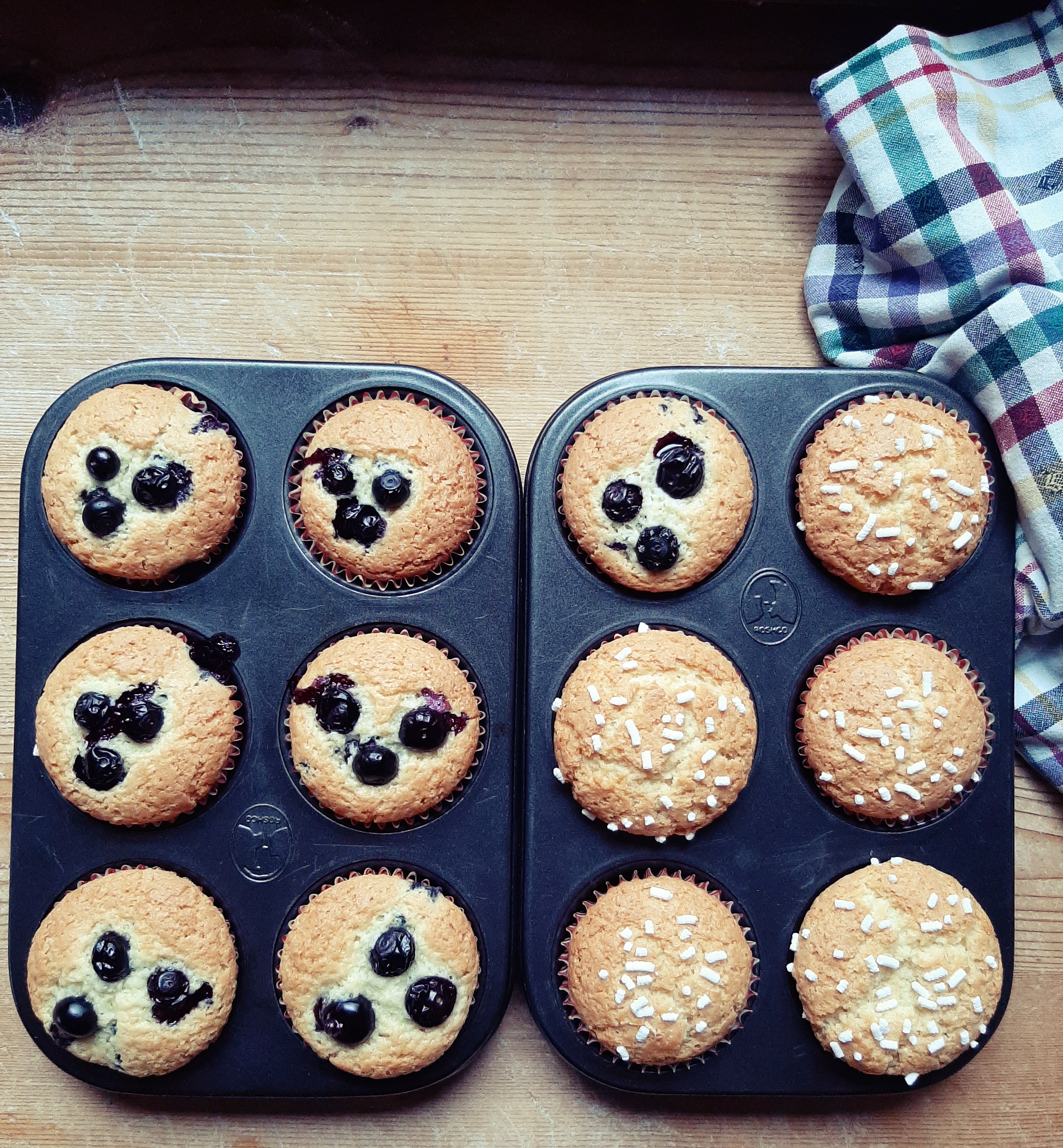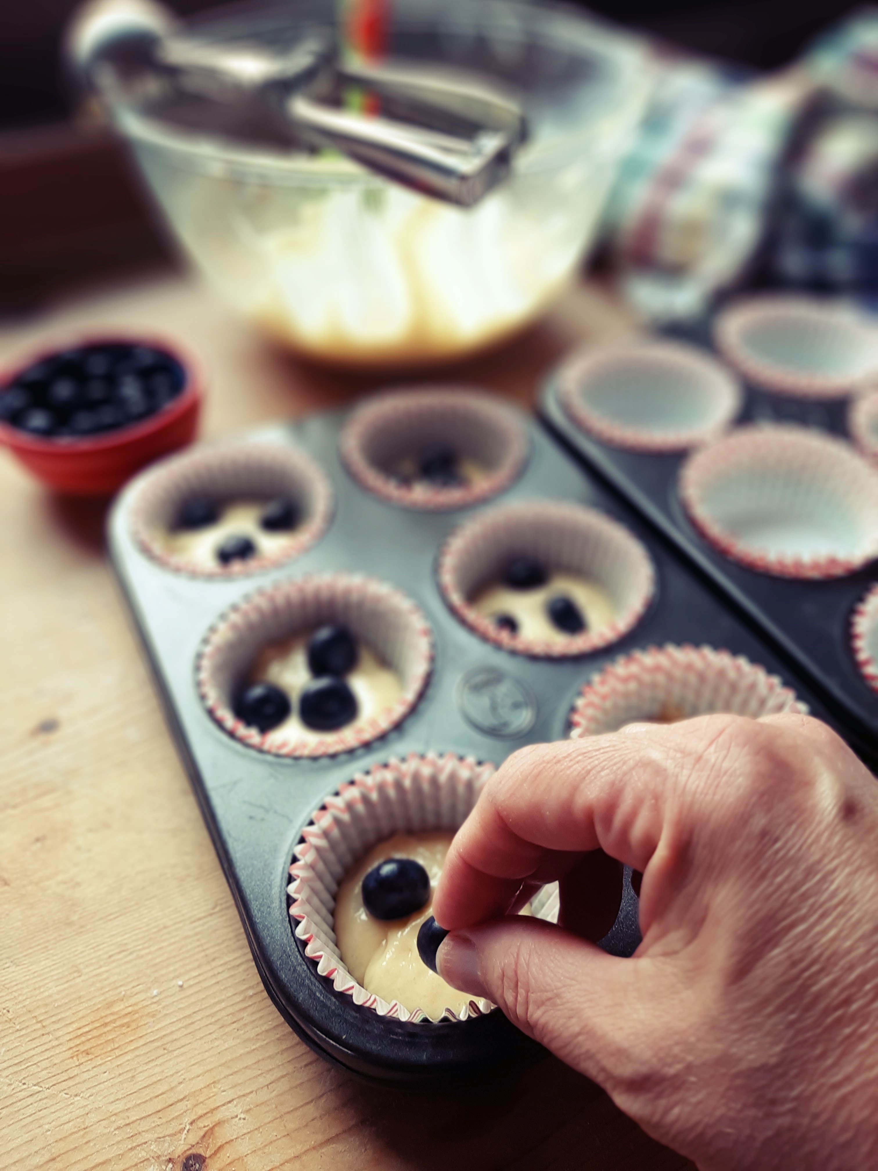 - Posizionare i pirottini negli stampi da muffin e con un dosatore per gelato, mettere una piccola parte di impasto sul fondo. Aggiungere i mirtilli (o altro) e riempire a 3/4 con un altro pò di impasto e finire con qualche altro mirtillo sopra.