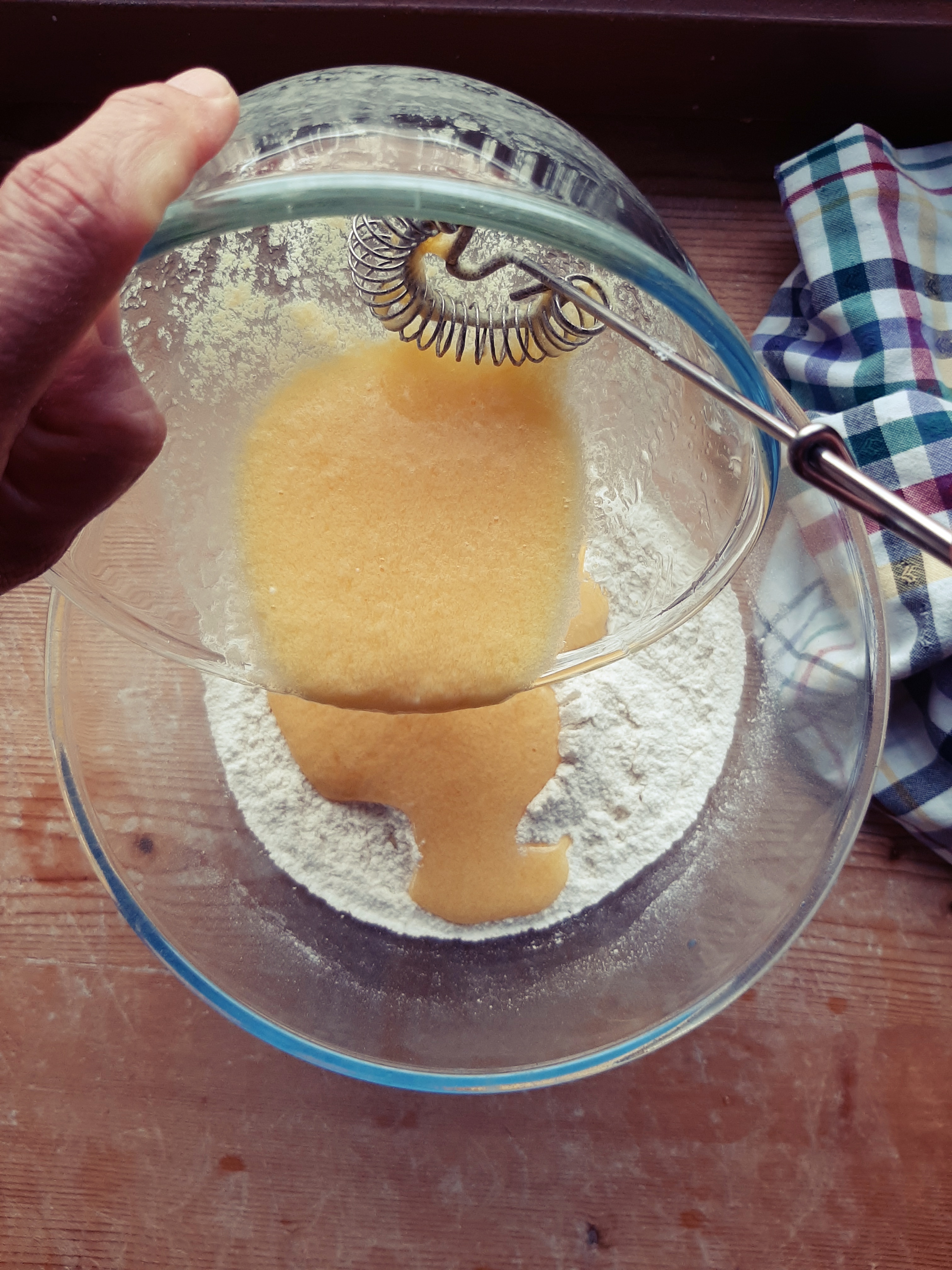 - In una ciotola capiente mescolare con una frusta farina, zucchero e lievito.