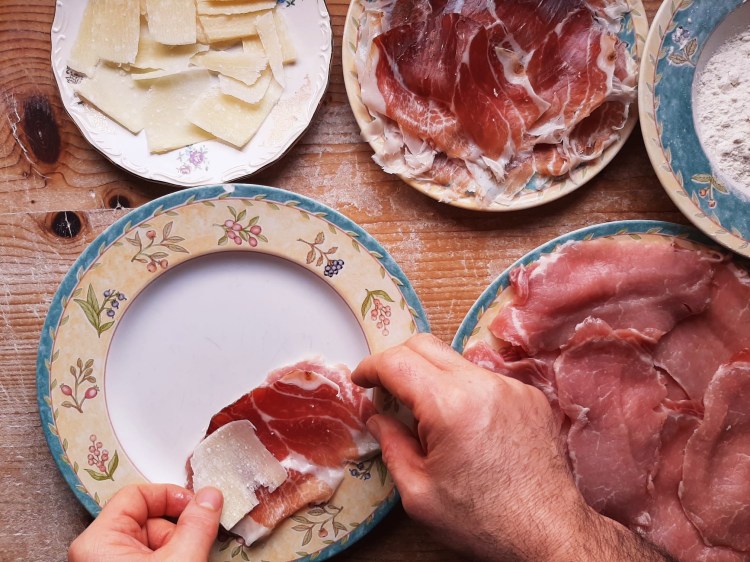 - – Lay ½ Prosciutto slice and one parmigiano Reggiano slice on every lonza one