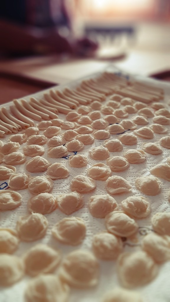 Poi quelle mani che tagliano con l’aiuto del coltello con la punta arrotondata, dei piccoli pezzettini di pasta, la trascinano sul tagliere di legno e, appoggiandola al pollice, la girano mettendo in evidenza la parte più grezza, che dovrà raccogliere il condimento.