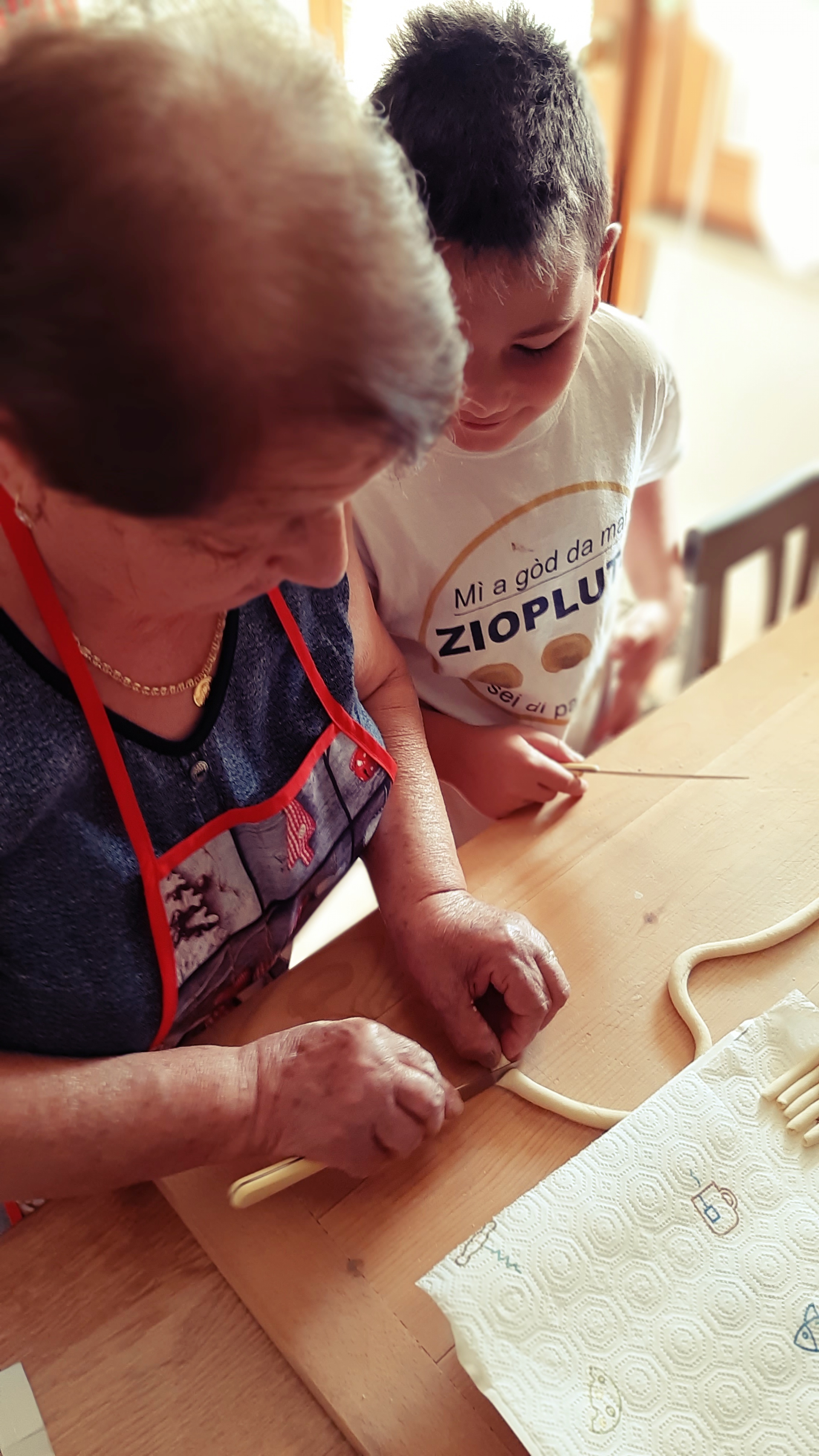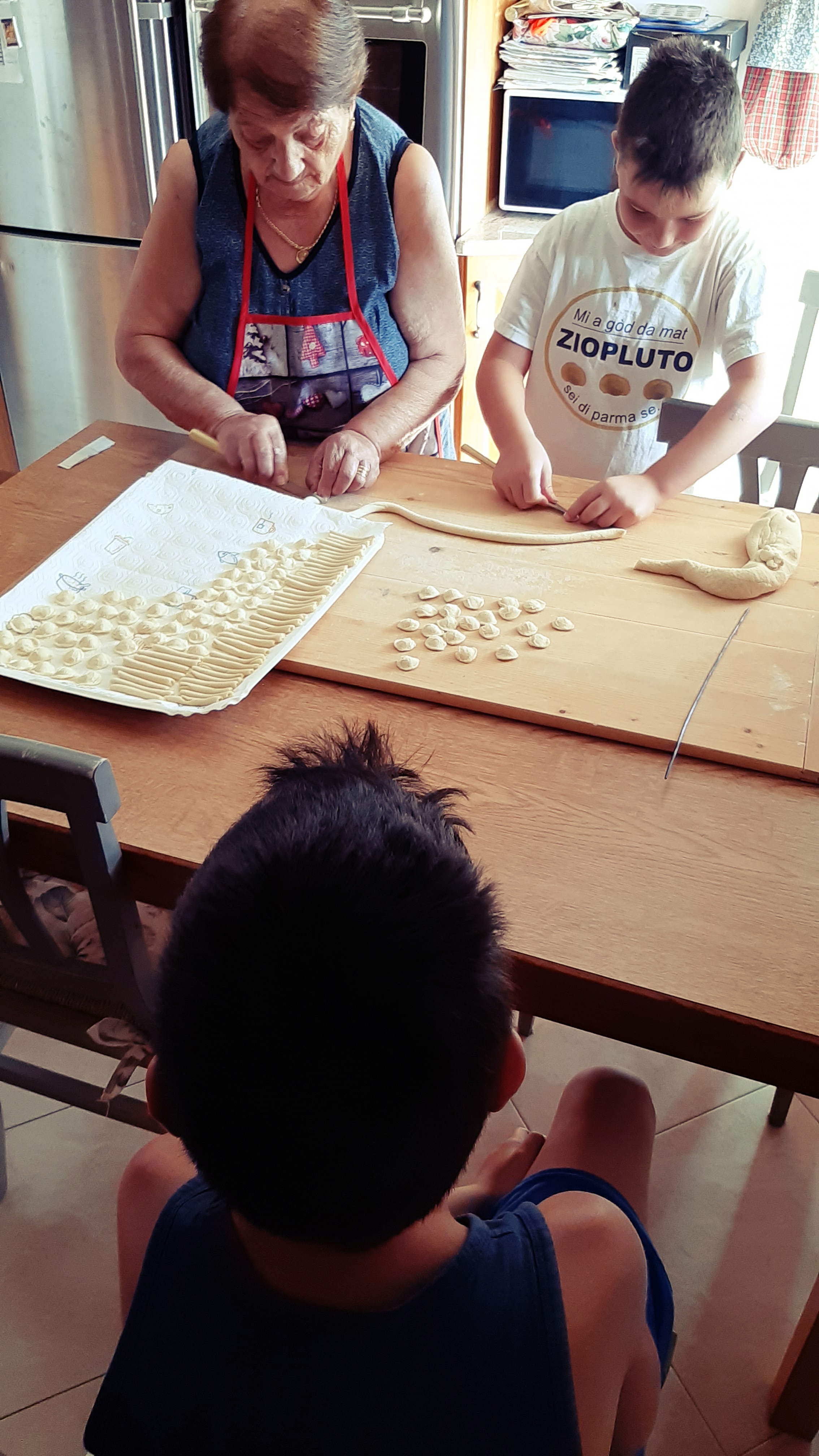 ….e nel frattempo,intorno al tagliere, arrivano anche i nipoti, Luca e Lorenzo, che prima timidamente, poi con più coraggio, osservano e cercano di imitare i gesti della nonna, rinnovando quella tradizione che diventa quasi un rito ancestrale che speriamo non si interrompa mai.