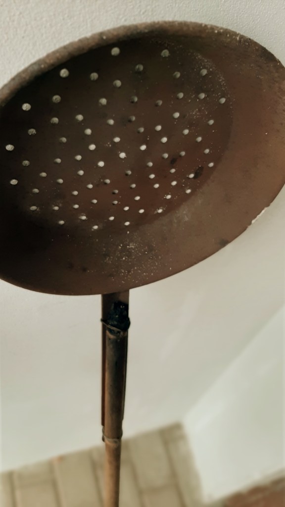 La padella coi fori e il manico lungo per poter cuocere le castagne direttamente sul fuoco, l’abbiamo “rispolverata” proprio l’anno scorso, per fare i “brusè” nel nostro forno a legna.
