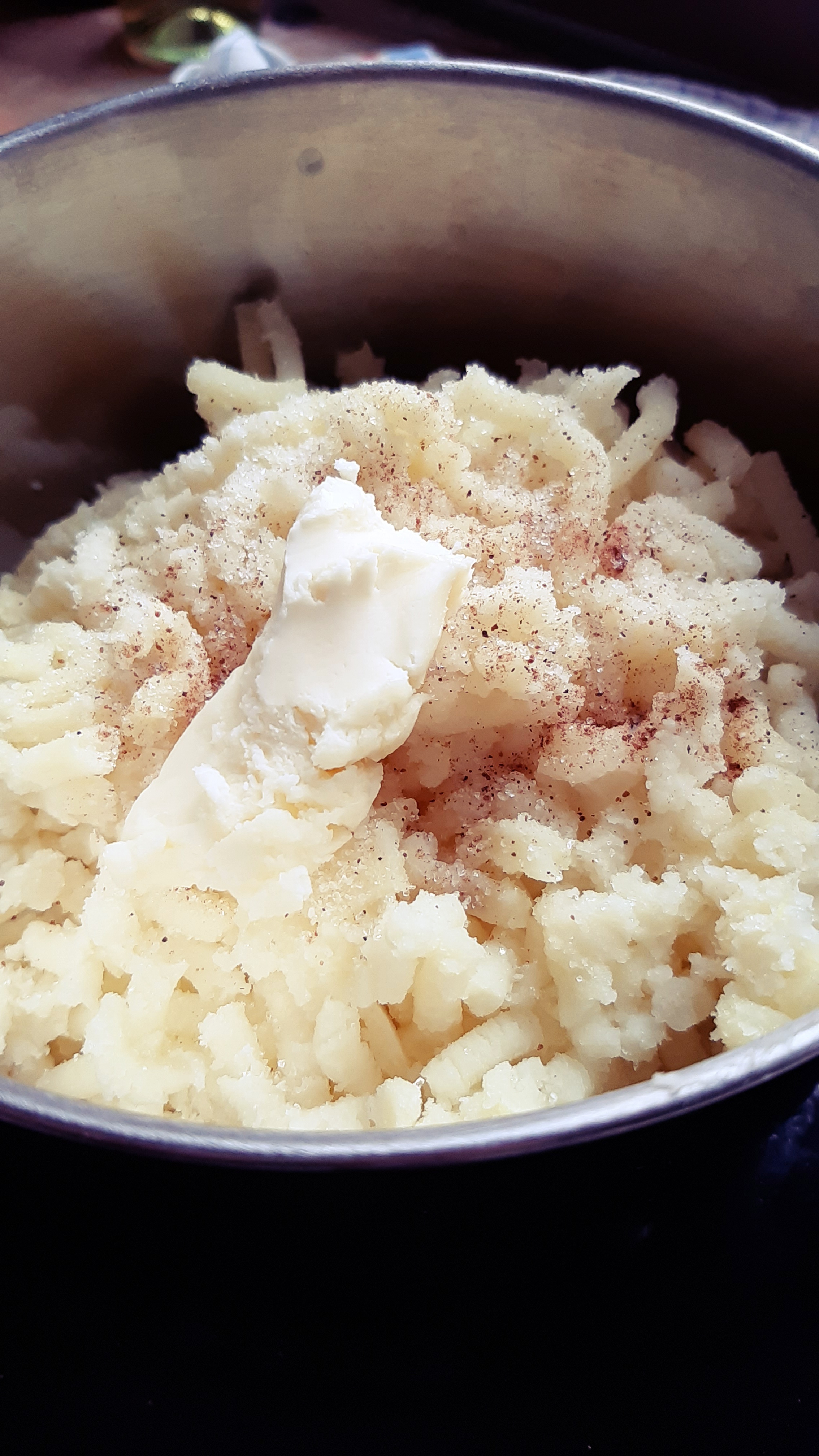 - Lessare le patate con la buccia in acqua salata (oppure al vapore come abbiamo fatto noi) e una volta cotte e spellate, schiacciarle con lo schiacciapatate direttamente dentro il pentolino.
