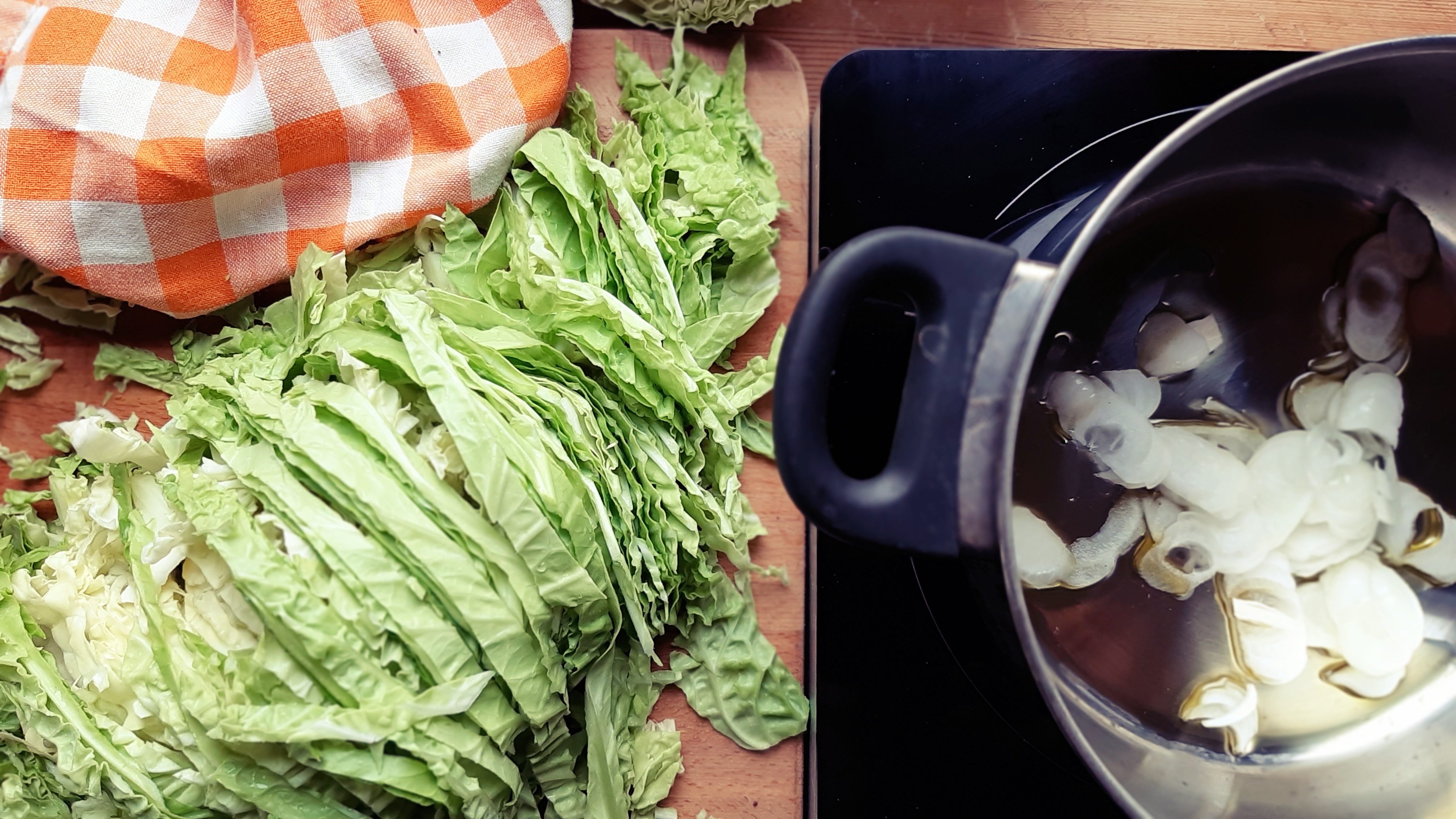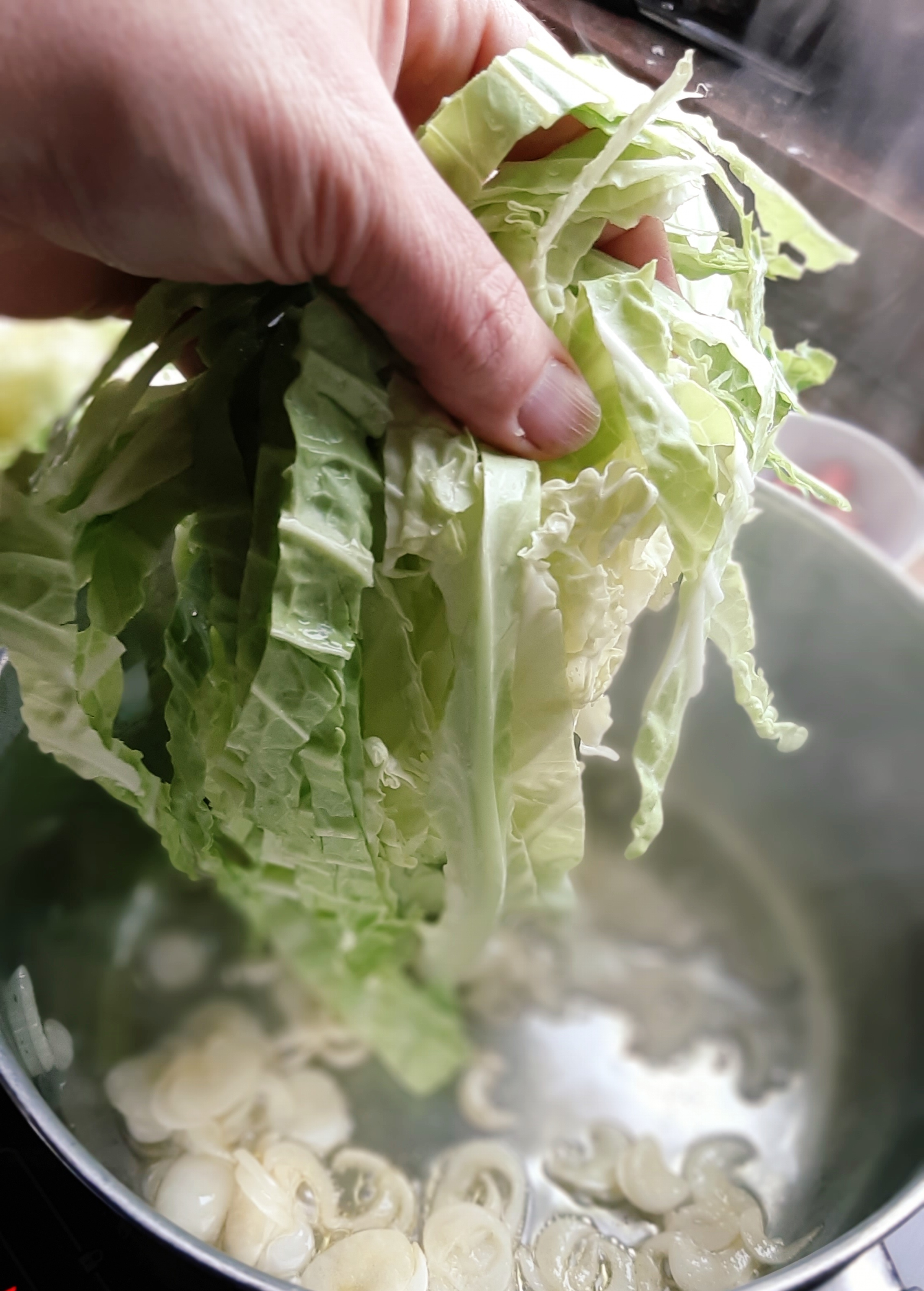 - Mettere a soffriggere in olio extravergine, la cipollina tagliata e fare appassire a fuoco basso; nel frattempo tagliamo la verza, ben lavata, a listarelle non troppo sottili, che poi aggiungeremo alla padella con il soffritto.