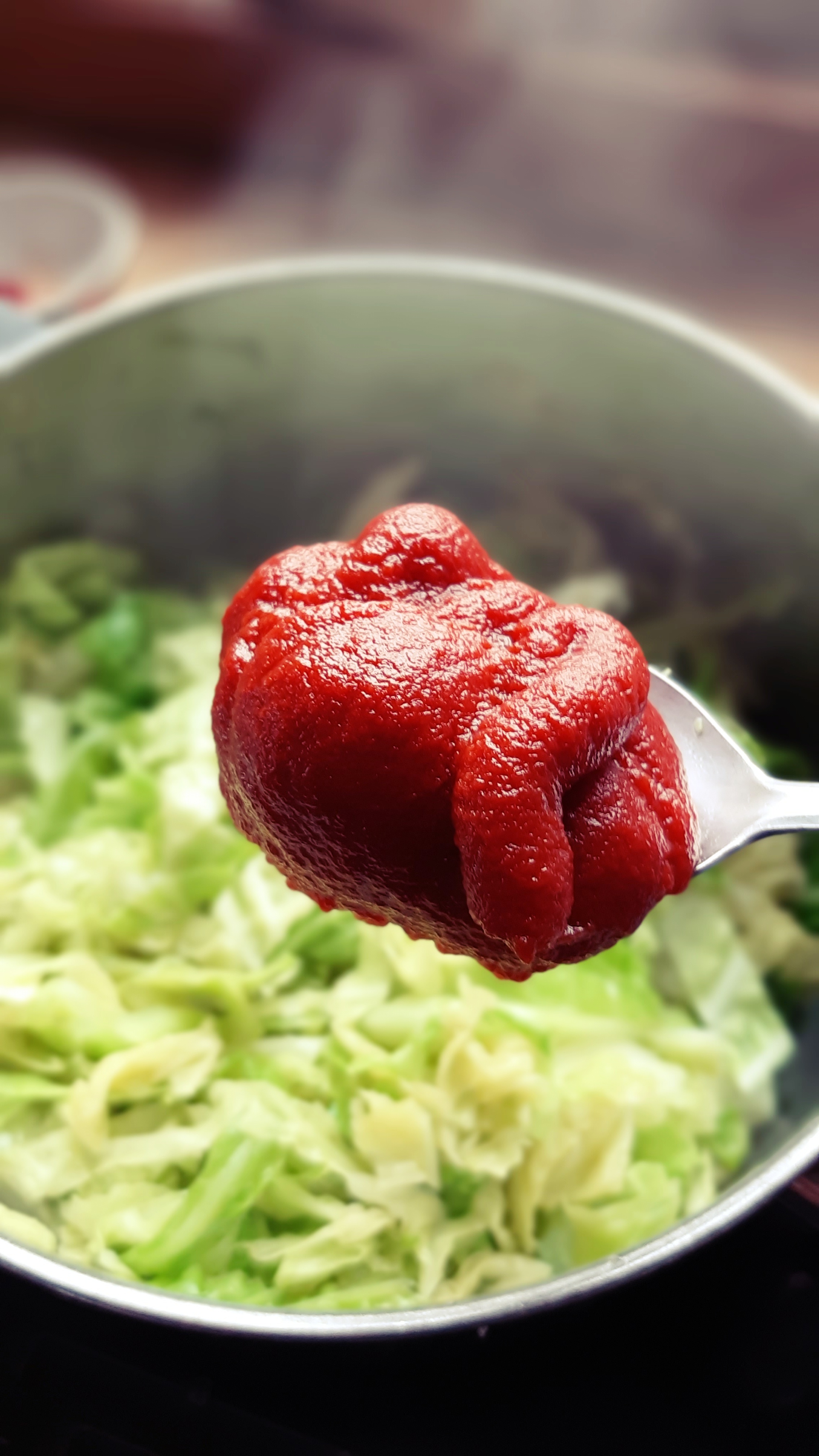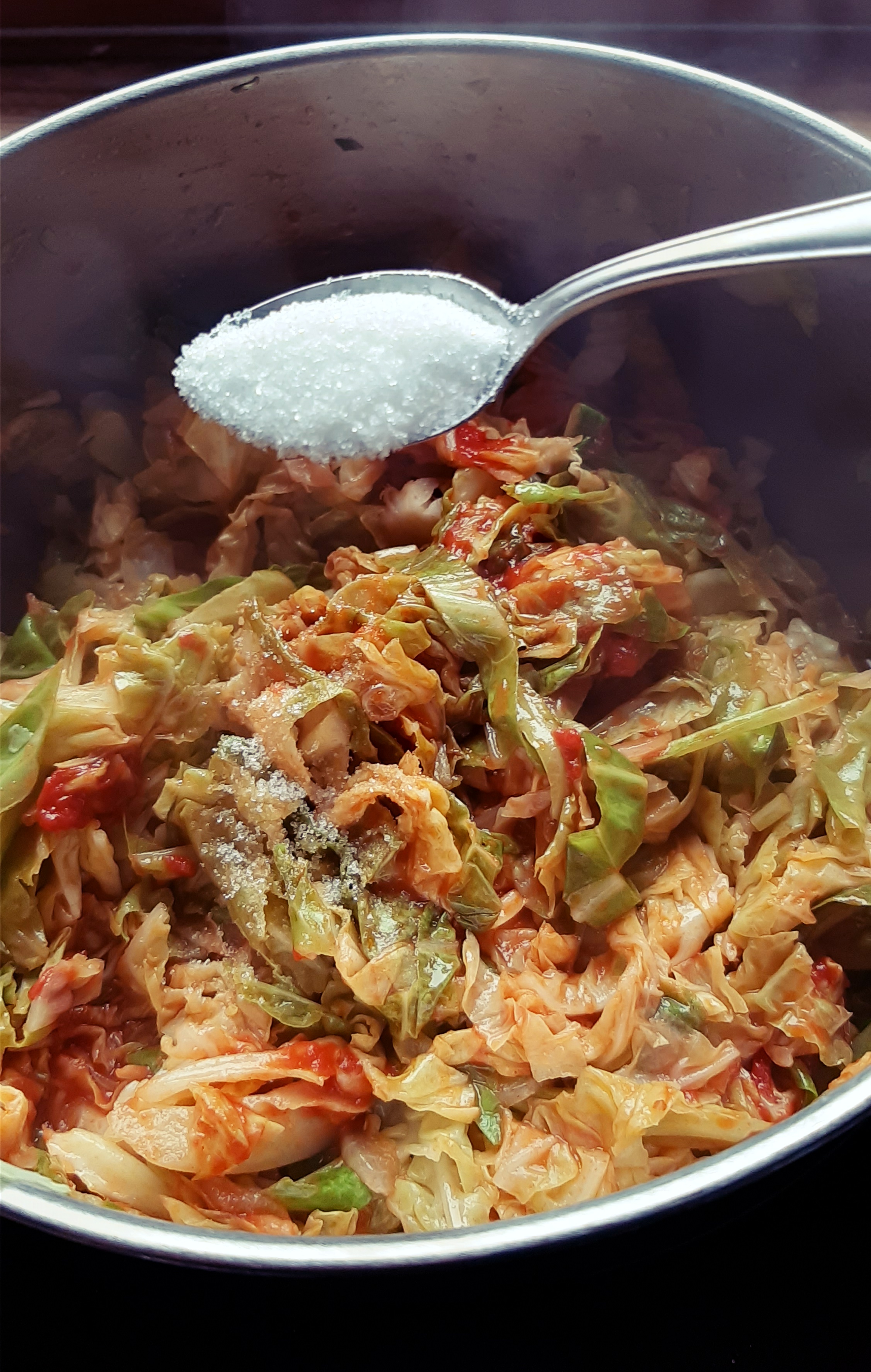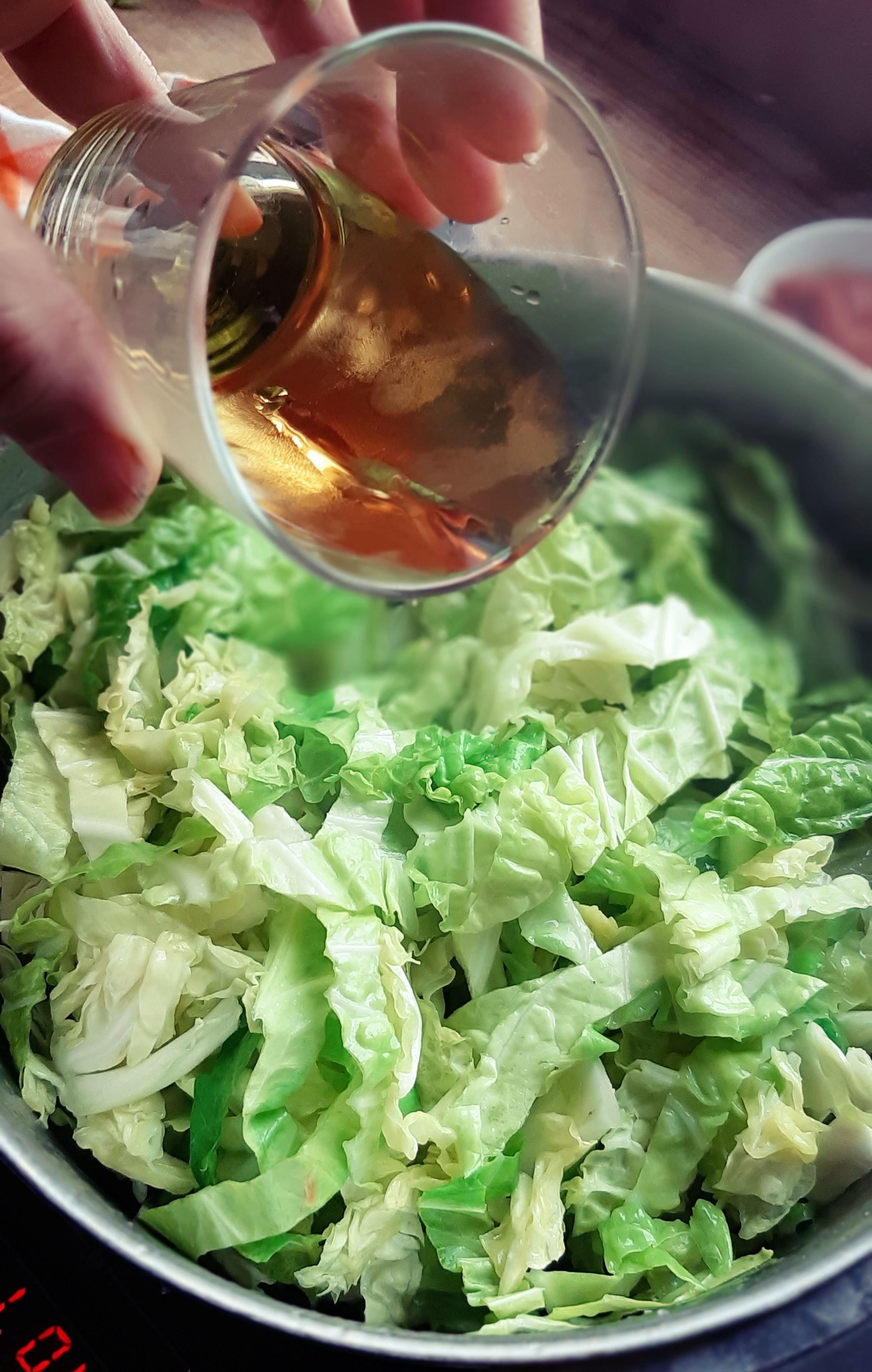 - Facciamo appassire leggermente la verza e poi sfumiamo con l’aceto di vino bianco.
