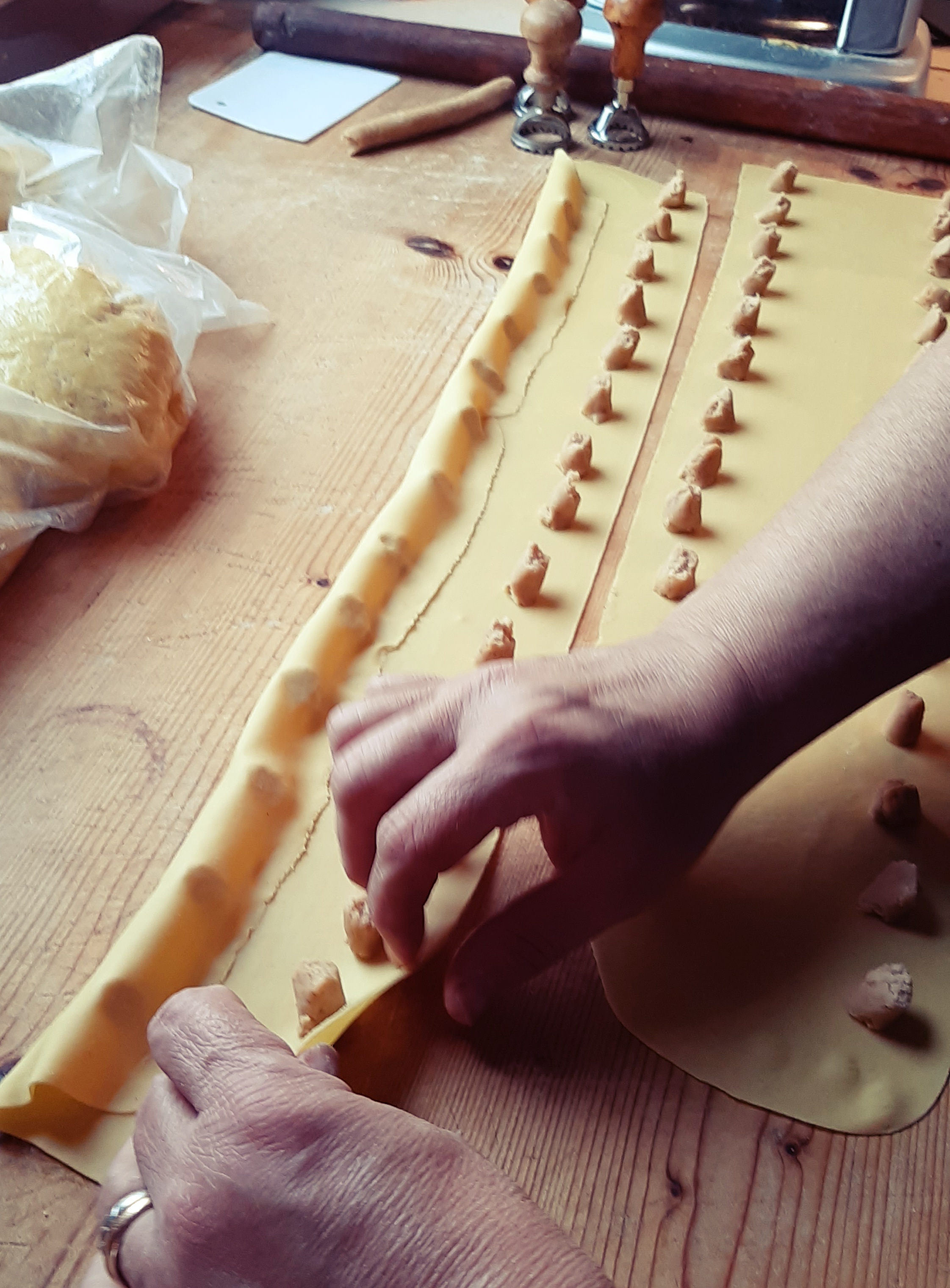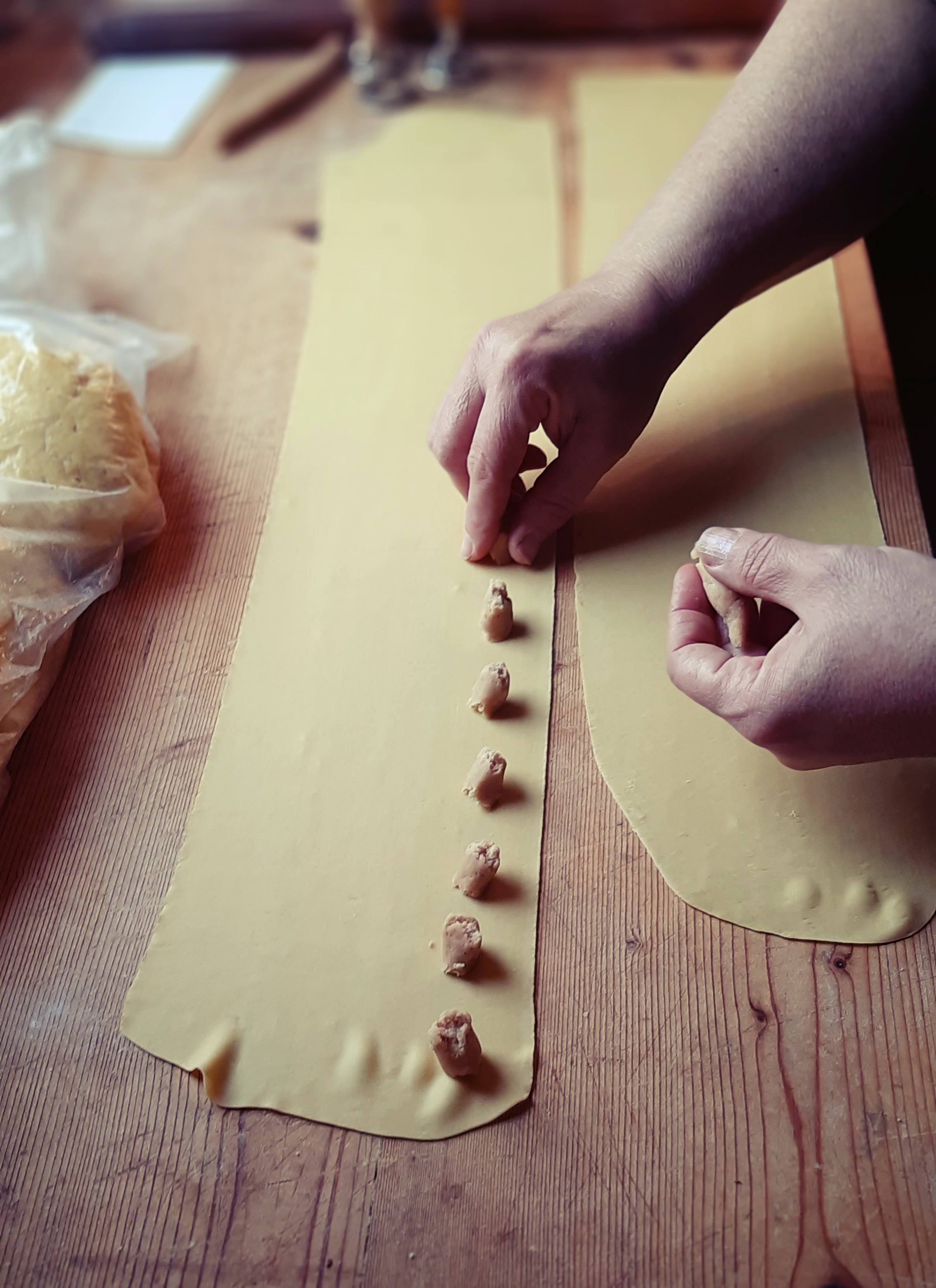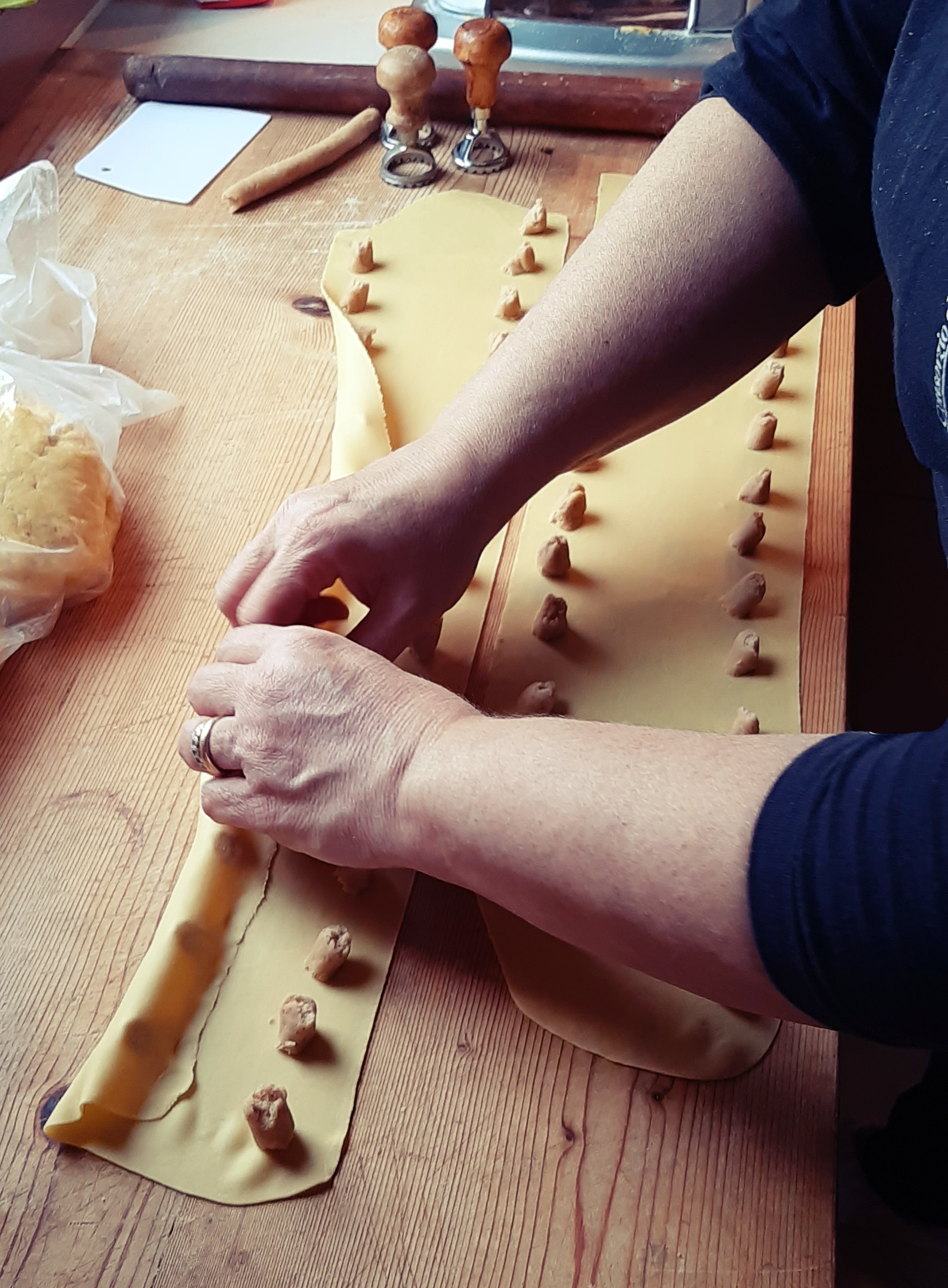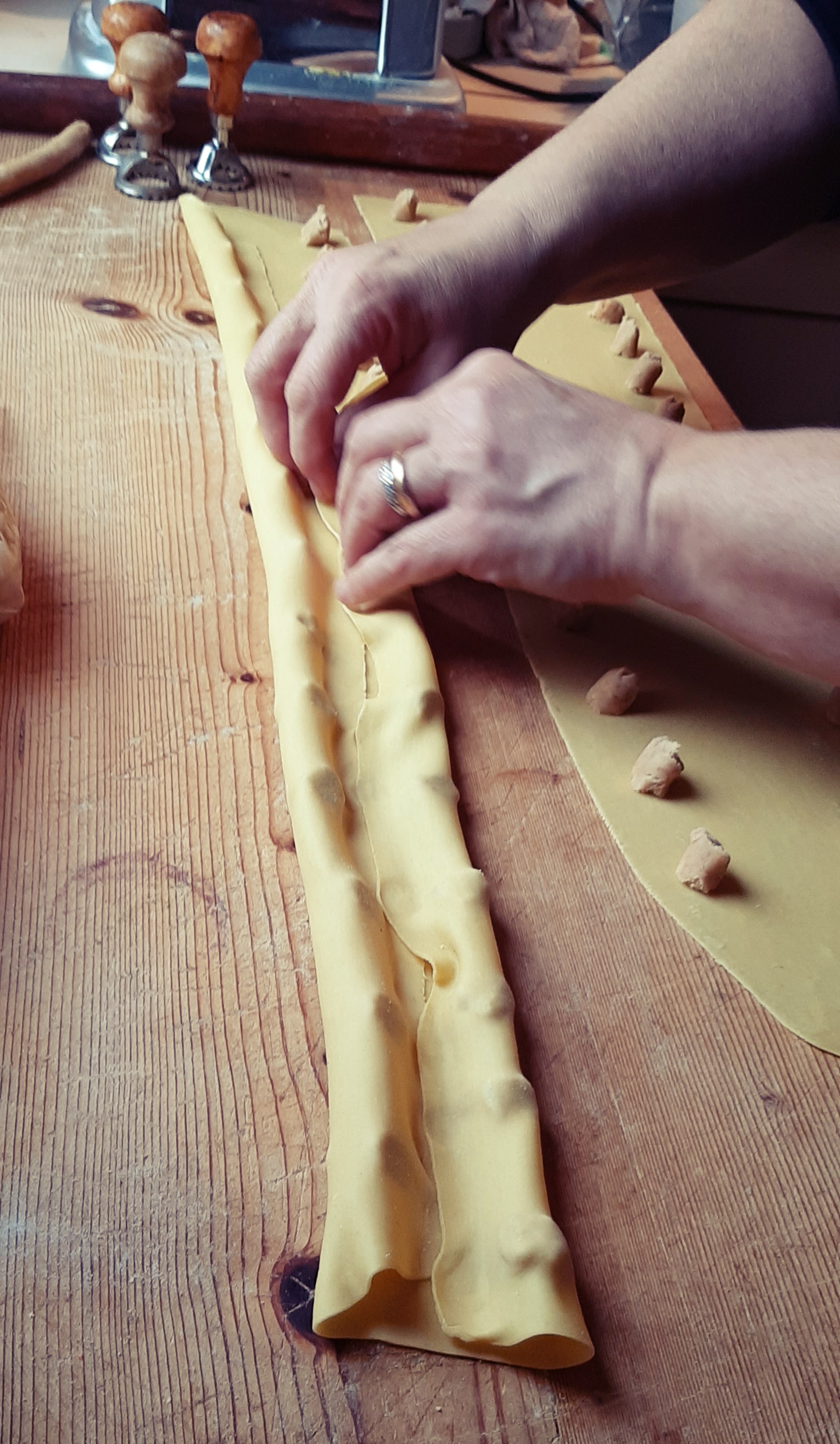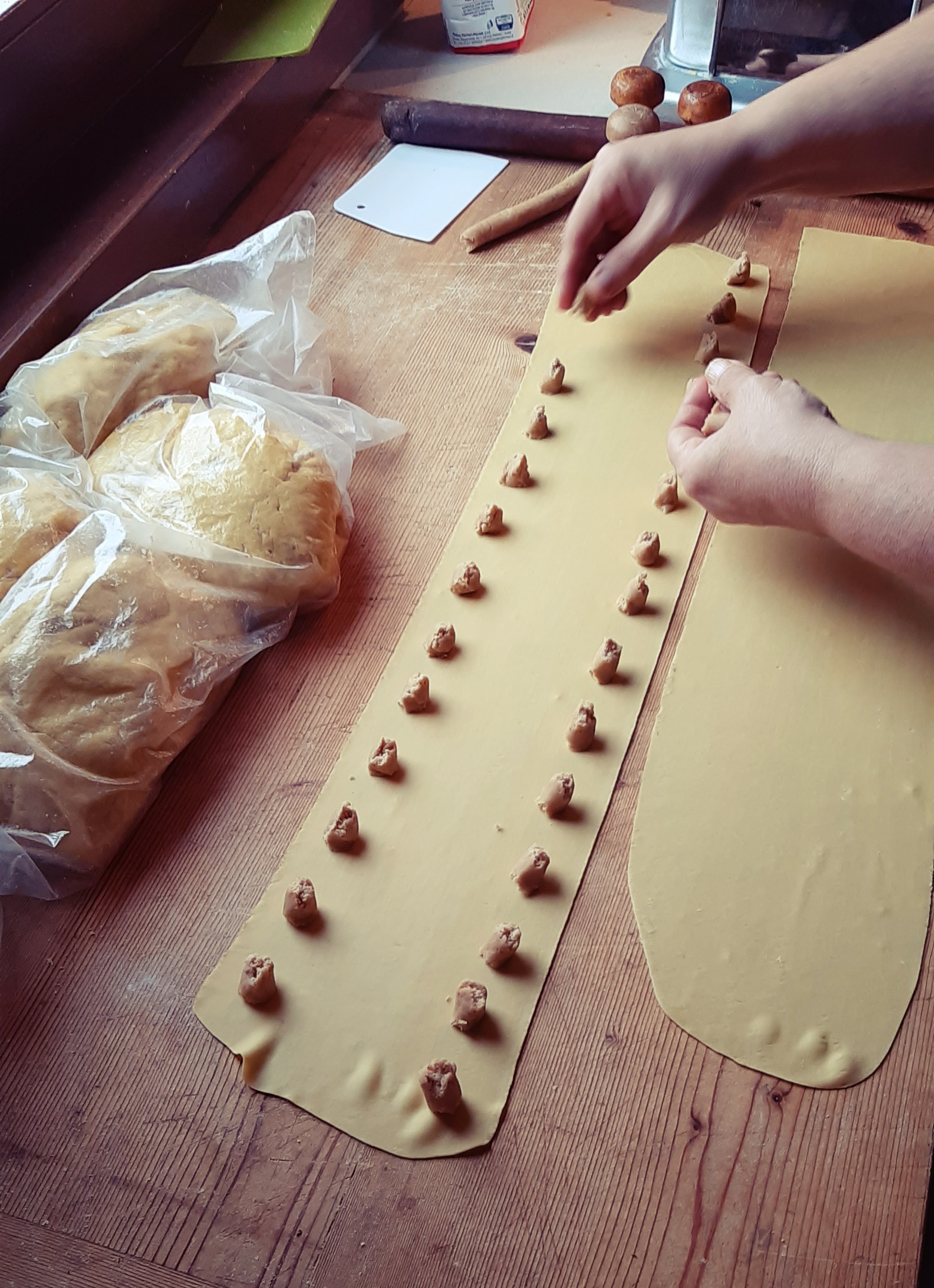 Pronti per confezionare i nostri cappelletti! Tiriamo la sfoglia ben sottile (per me nell’ultimo passaggio), facciamo due file serrate con i mucchietti di ripieno e copriamo con la restante sfoglia; pressiamo con le dita in modo da far uscire tutta l’aria e tagliamo con l’attrezzo dentato o liscio. Disponiamo i cappelletti su un piano coperto da un canovaccio o una tovaglia e una volta terminati possiamo congelarli stesi sui vassoi e poi insacchettati già congelati oppure, come faceva la nonna Velia, si lasciano asciugare 24 ore in una stanza al freddo (senza riscaldamento e possibilmente con la finestra socchiusa) e poi si mettono nei sacchetti gelo per congelarli.