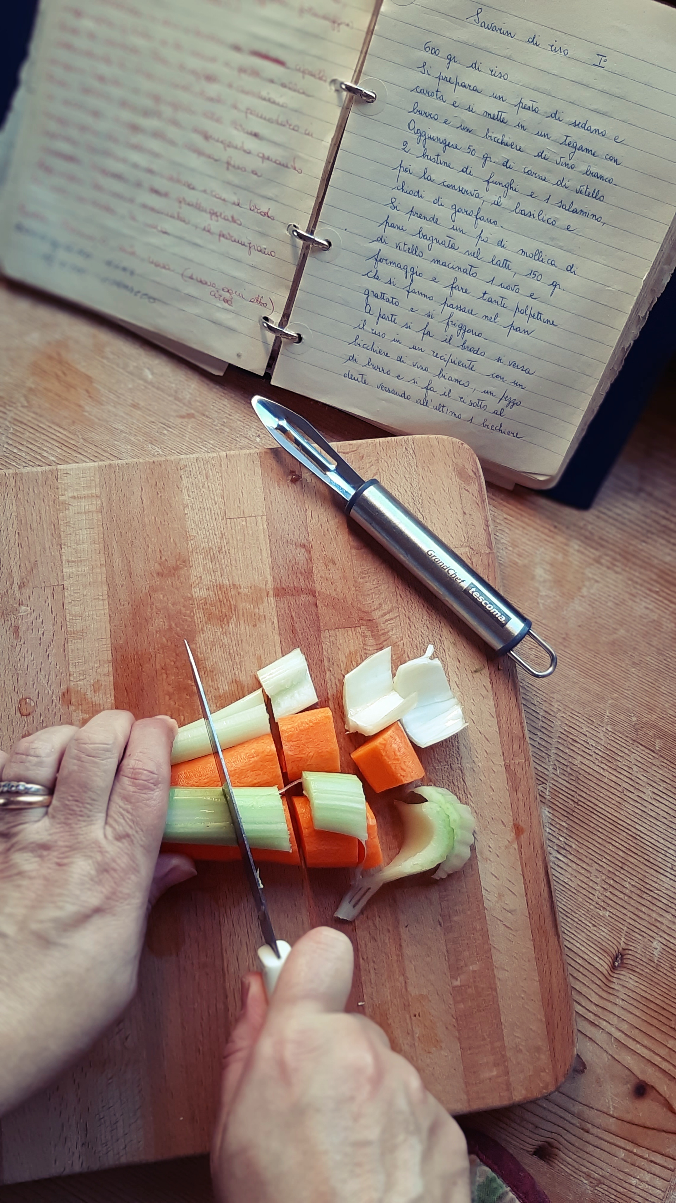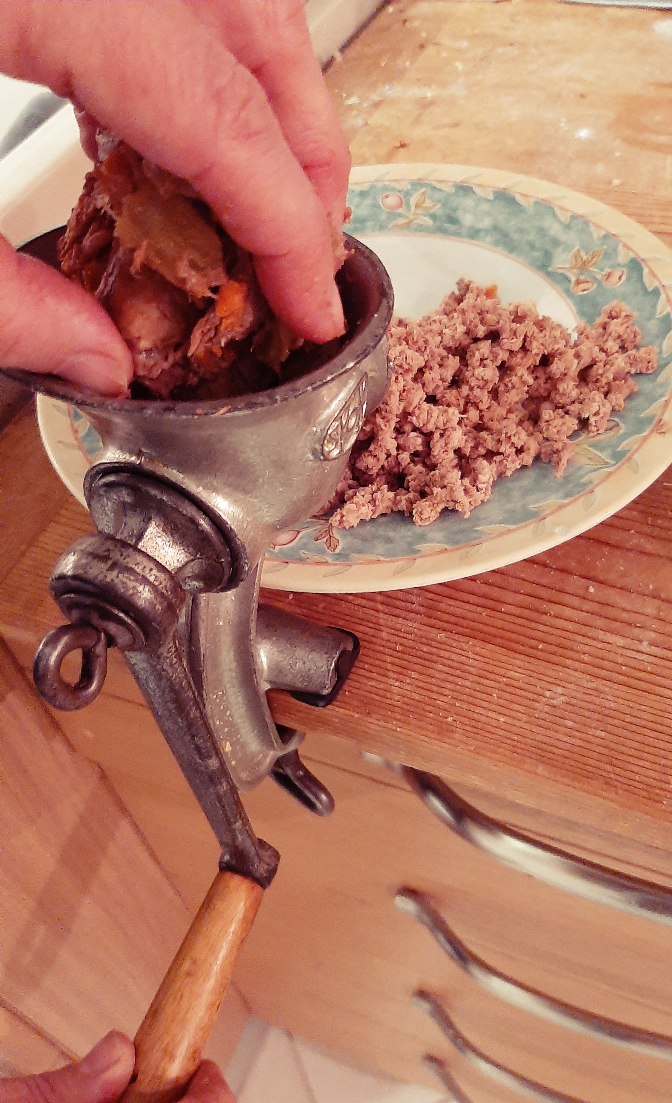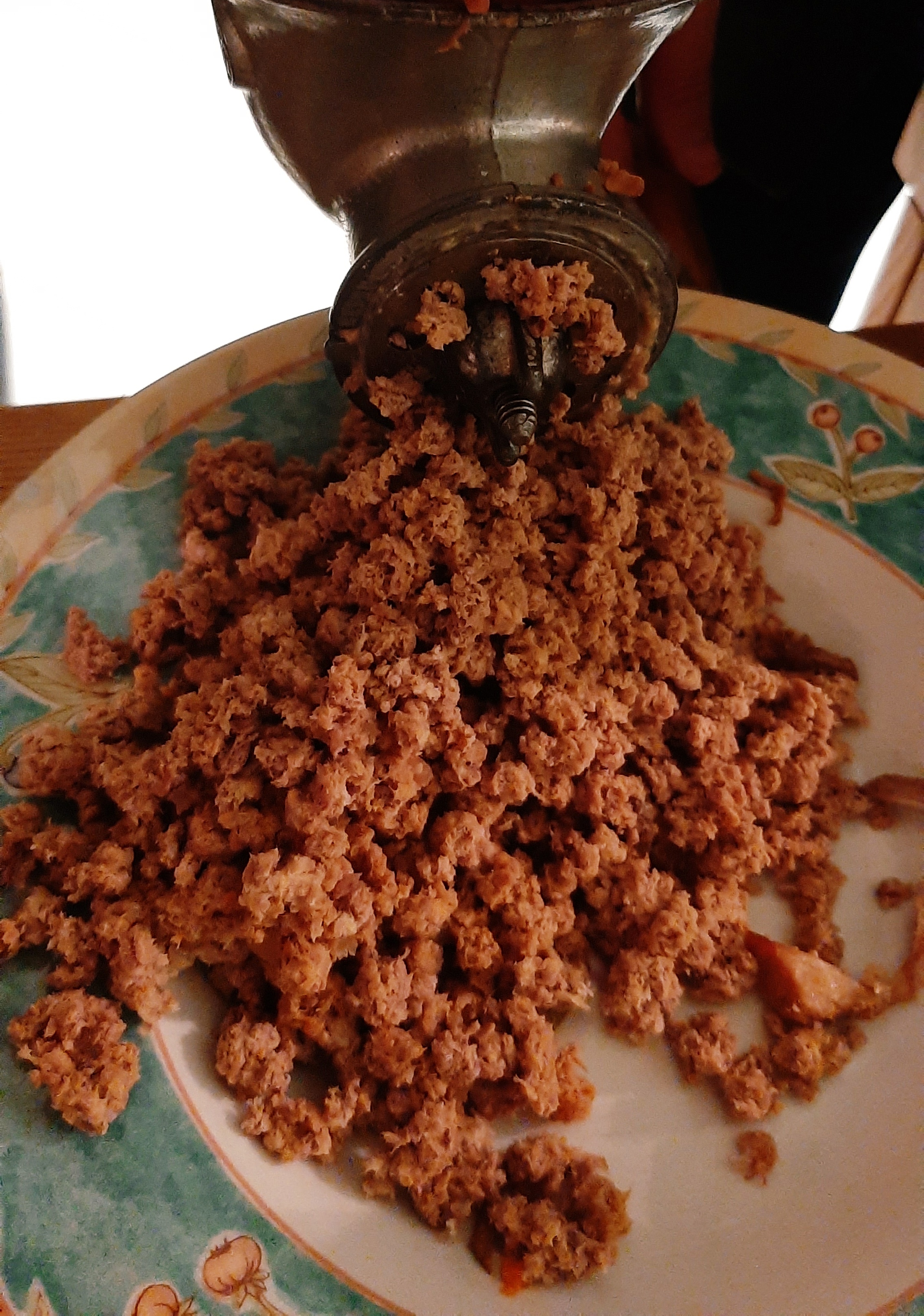 Fatto ciò, cominciamo a tritare la carne; noi lo facciamo con un macinino ereditato dai nonni che rende tutto ancora più magico.
