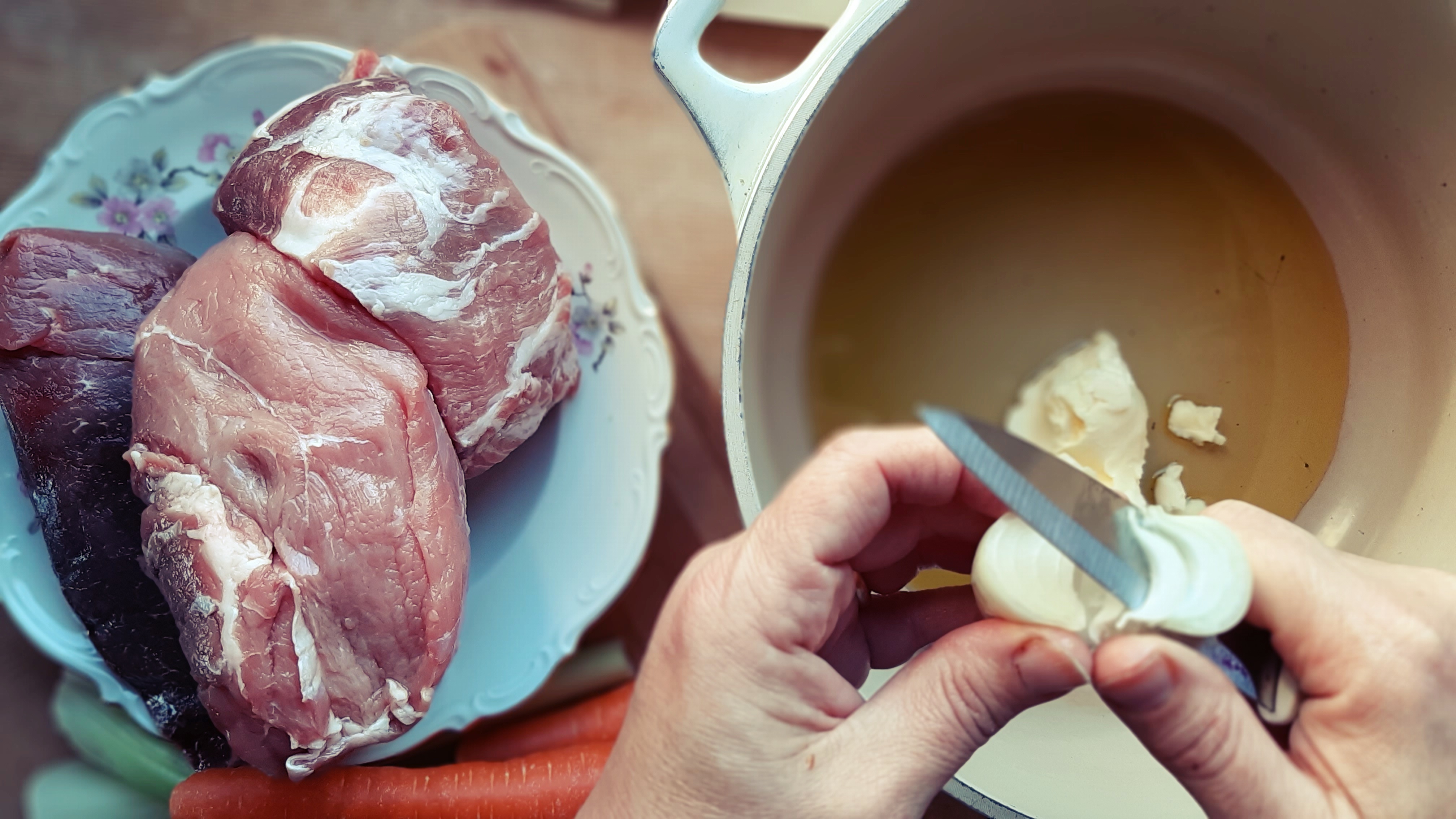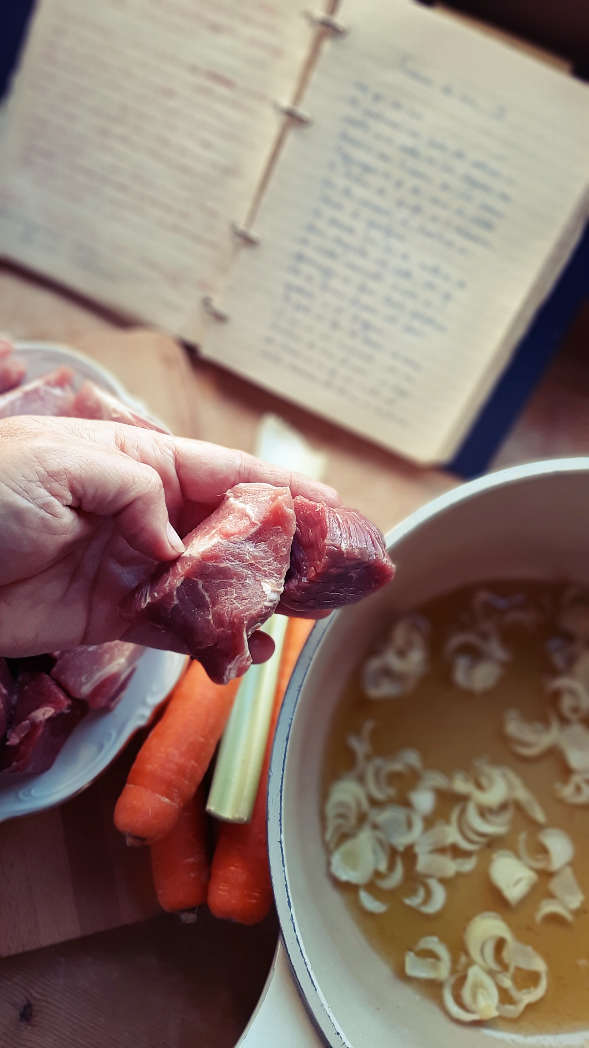 Partiamo con il soffriggere molto delicatamente la cipolla nell’olio extravergine d’oliva e una noce di burro; mentre il tutto va a fuoco basso, tagliamo la carne a pezzettoni.