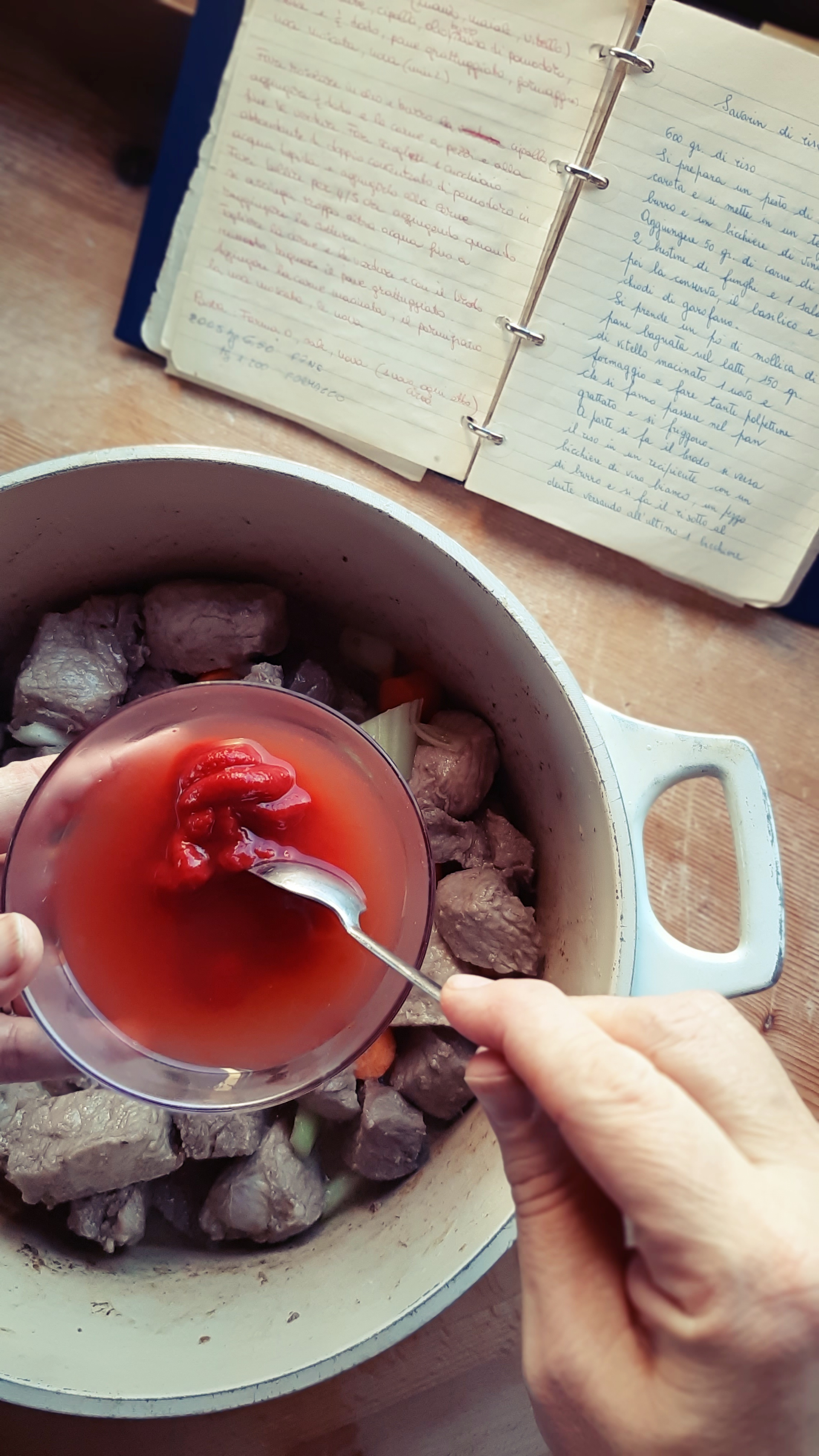 Se non siete poetici o semplicemente non avete un piatto con la crepa, sfumate la carne direttamente con il vino rosso appena prima di mettere il concentrato di pomodoro e l’acqua.