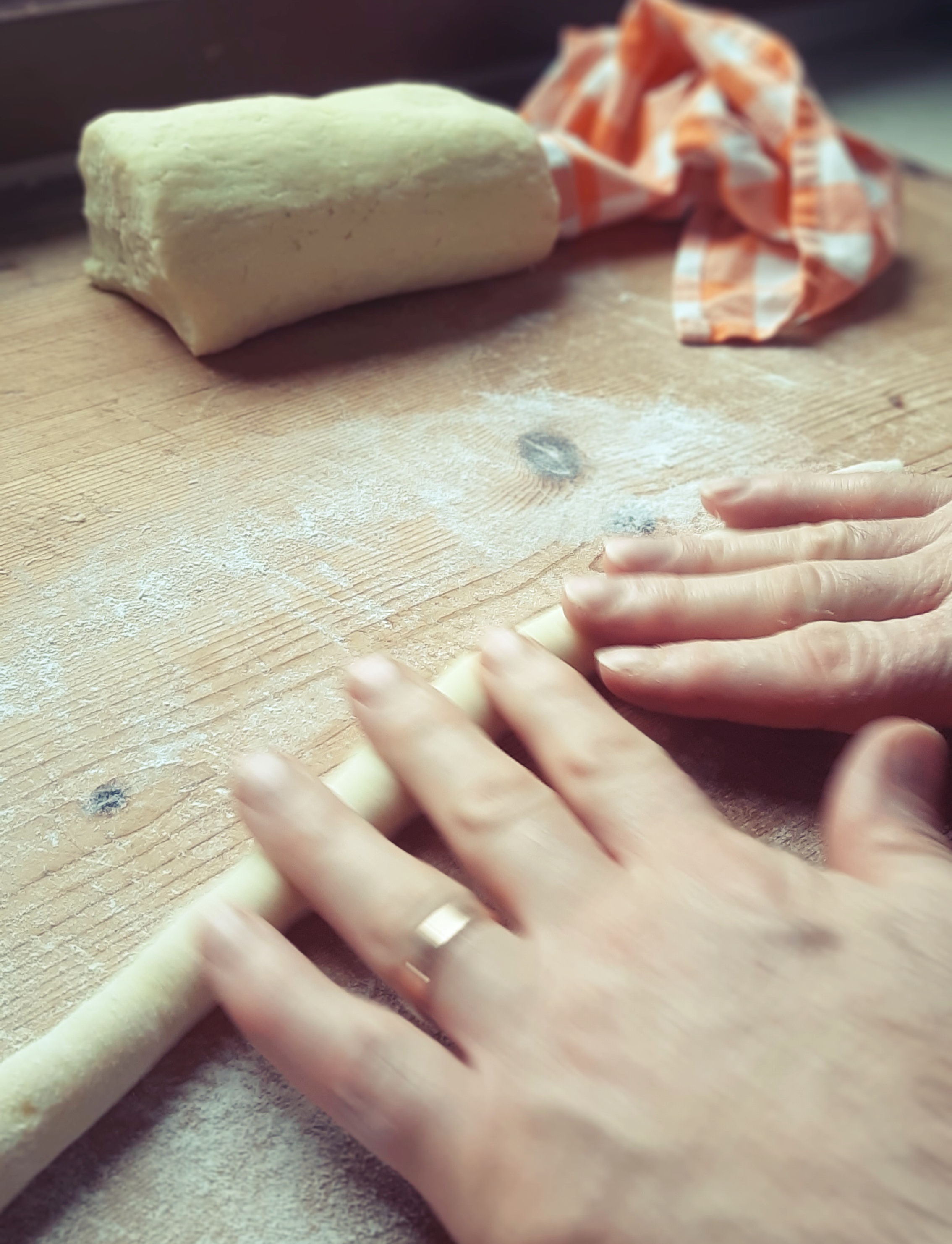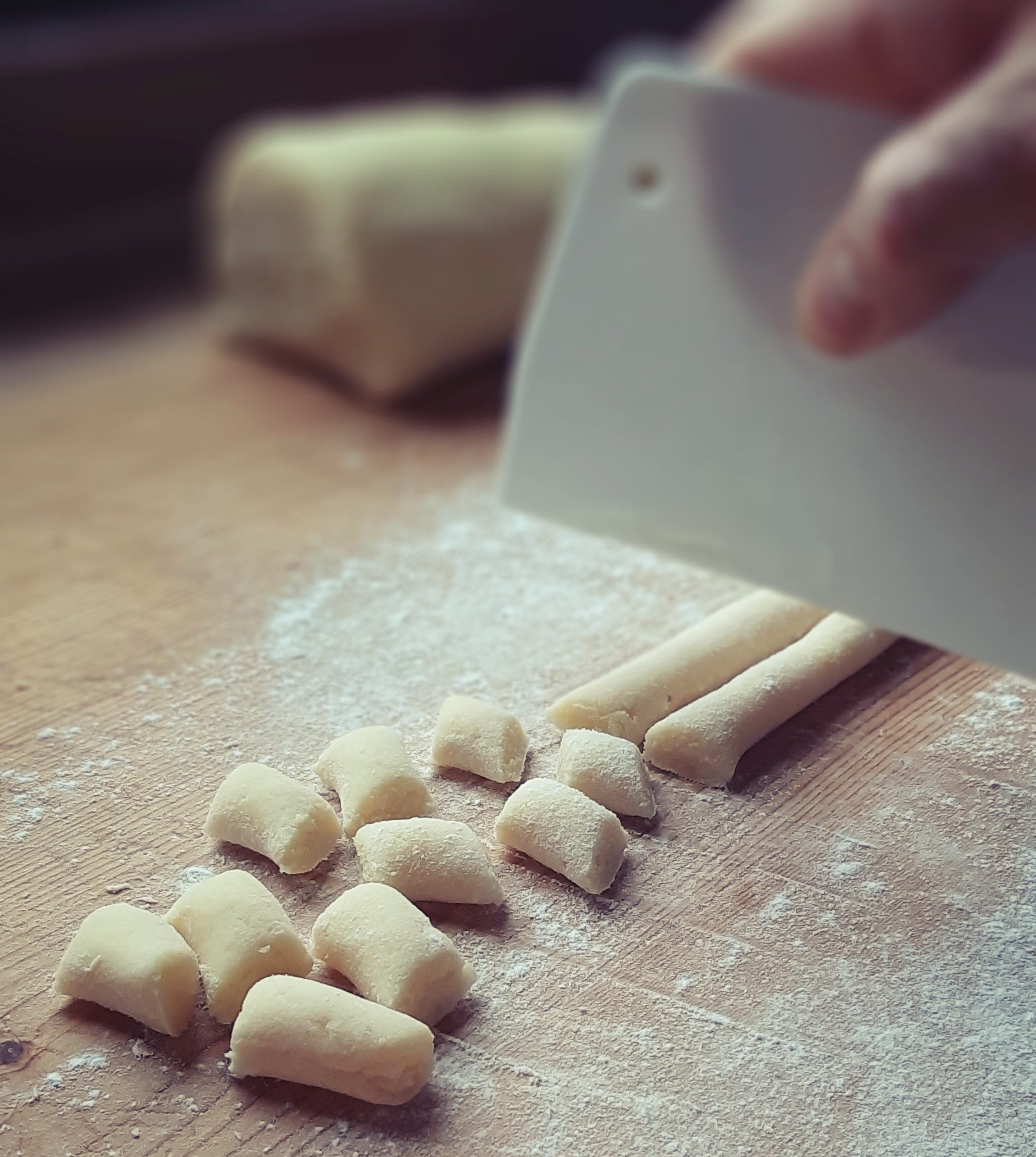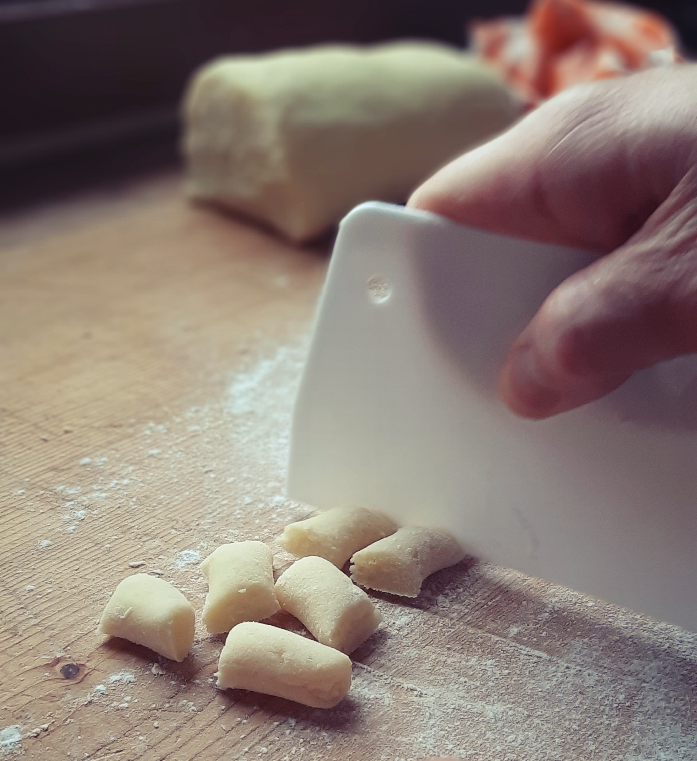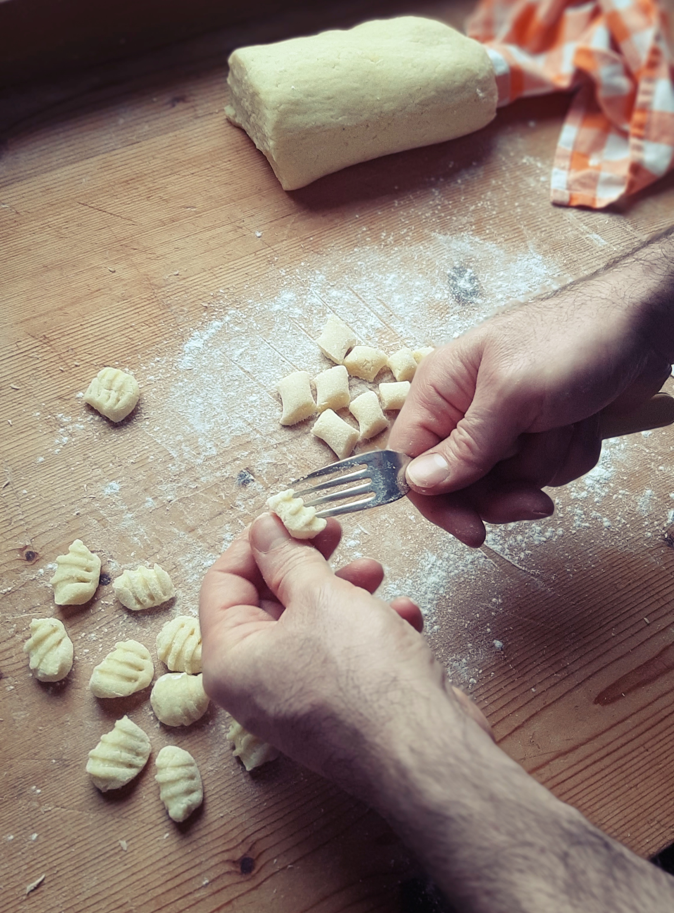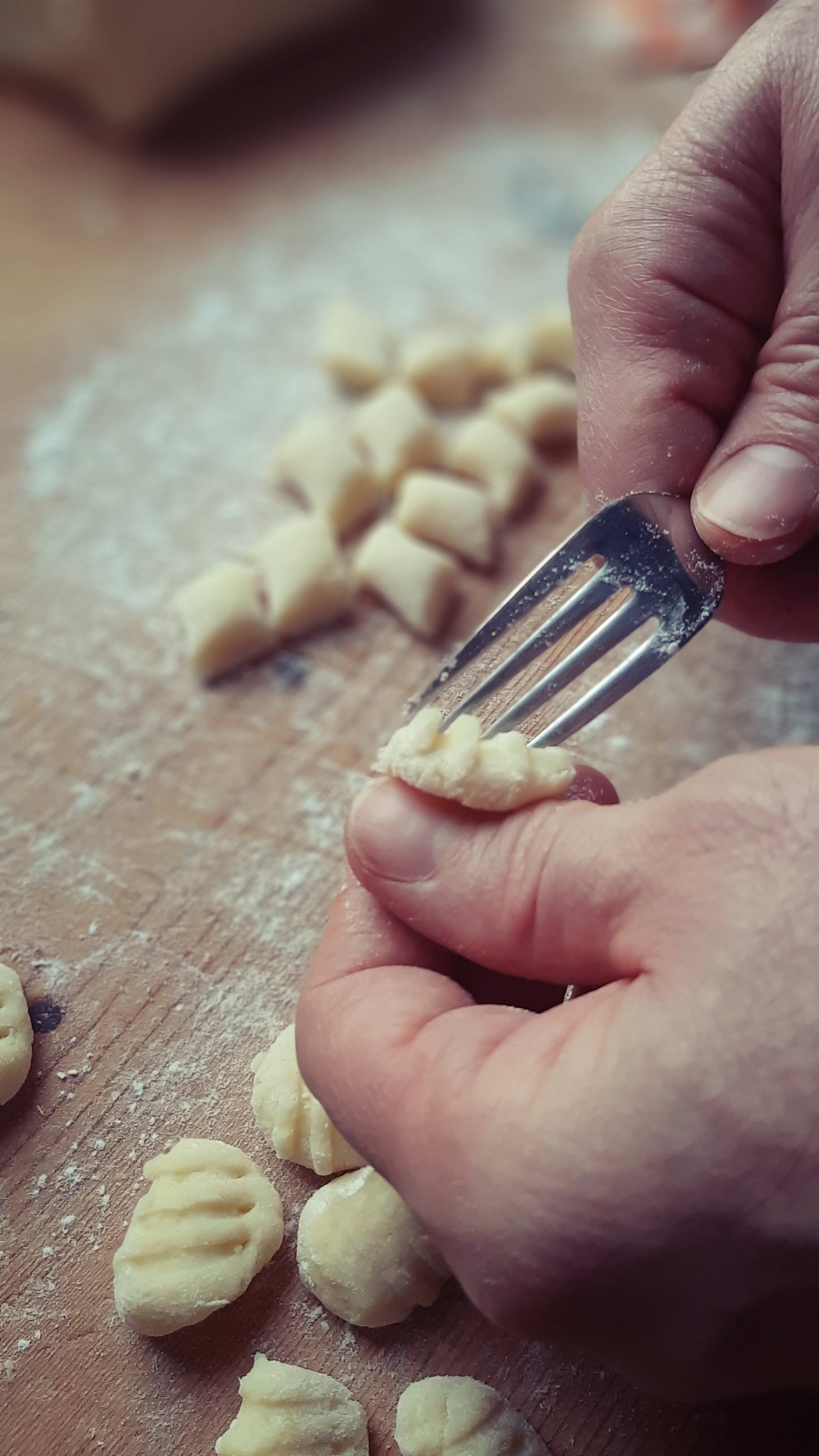 - Una volta ottenuto un impasto bello sodo, cominciamo a formare i nostri gnocchi e, se abbiamo tempo (…e anche voglia!) con i rebbi di una forchetta incidiamo gli gnocchi in modo da formare quelle scanalature tipiche che agevoleranno un migliore assorbimento del condimento.