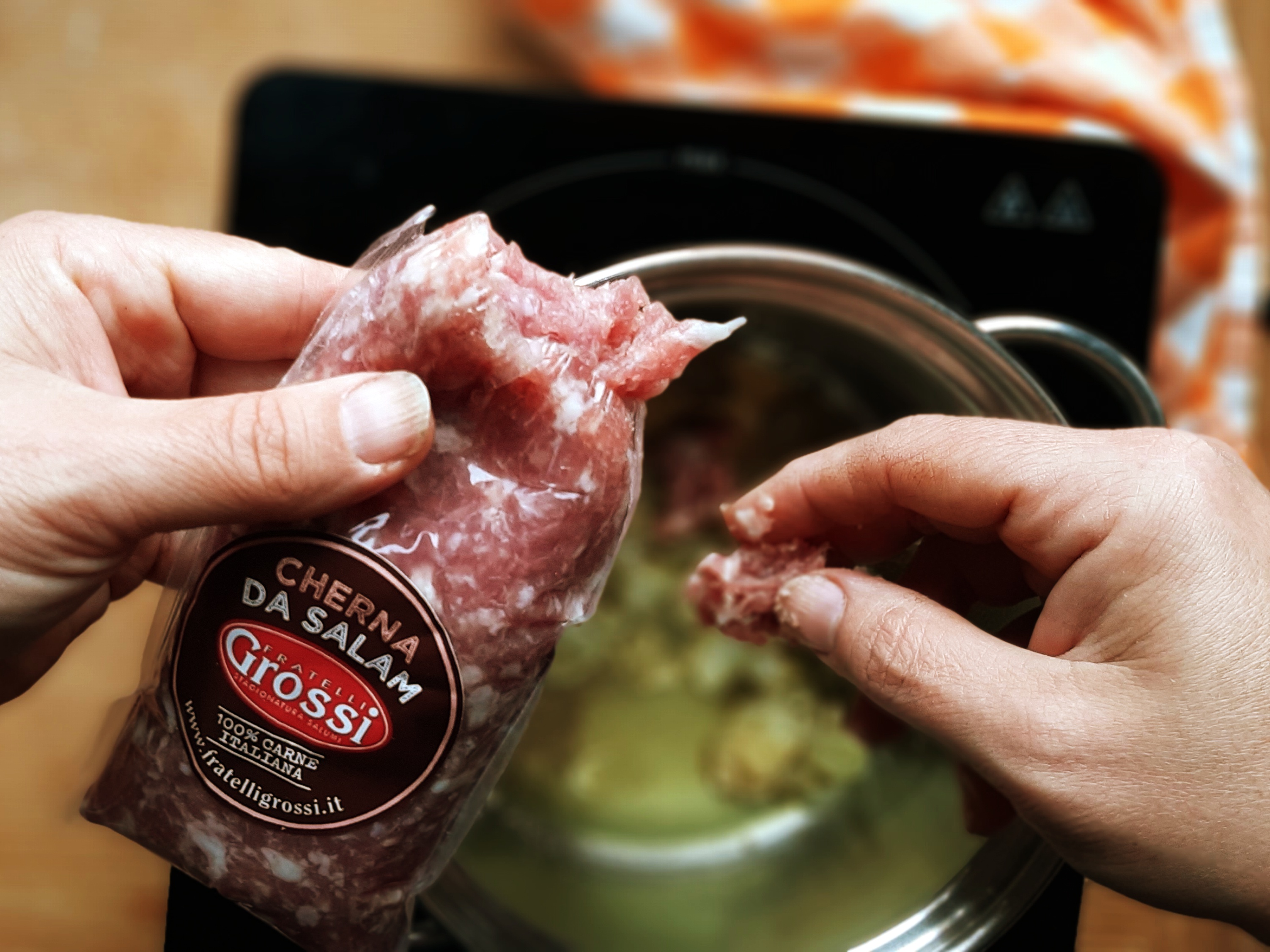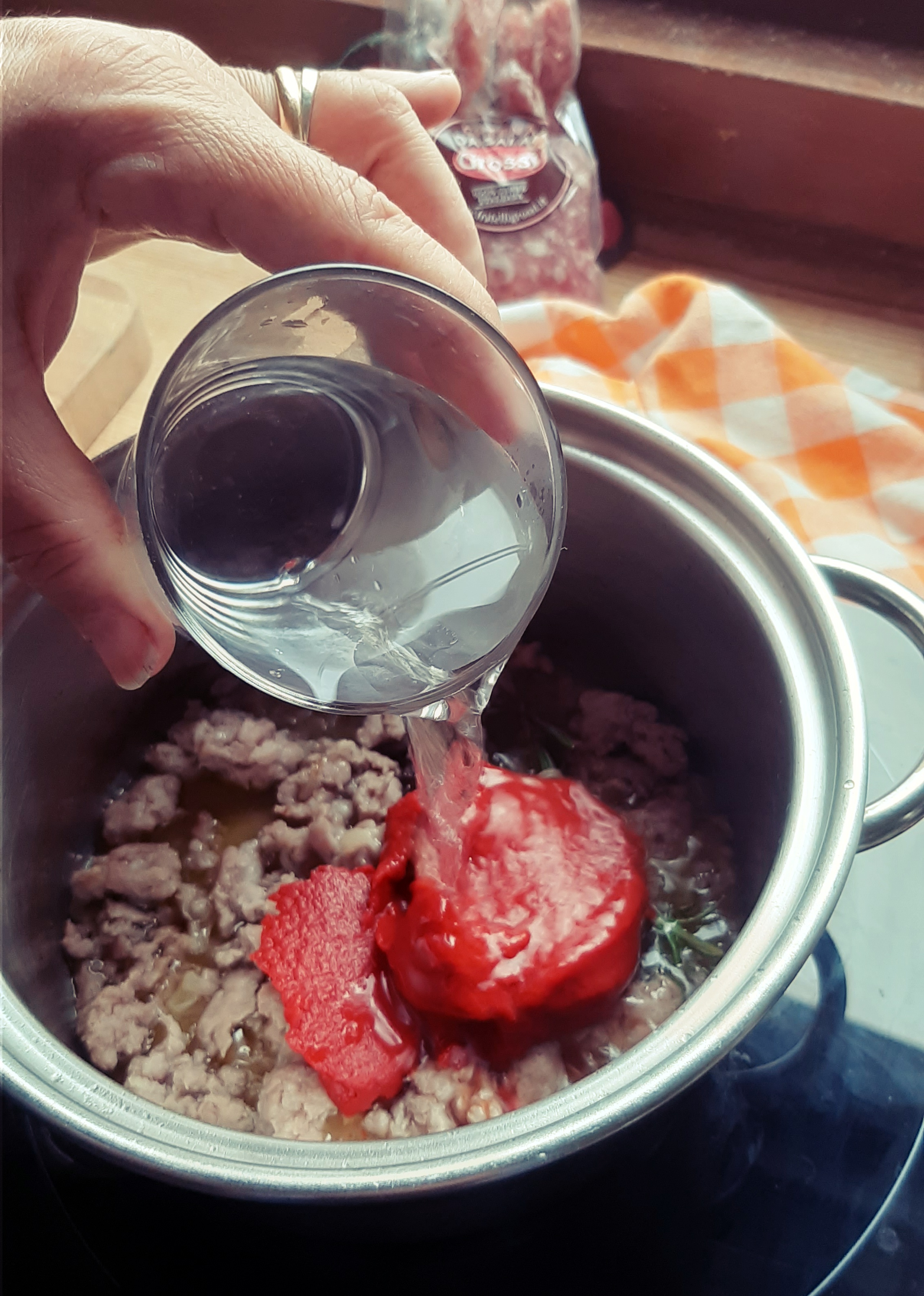 - E’ il momento della carne da salame (noi abbiamo usato quella dei Fratelli Grossi; se volete qualche informazione in più ecco il link – http://www.fratelligrossi.it/prodotto/insaccati-freschi/ ); l’abbiamo spezzettata con le mani a tocchetti e aggiunta alla cipolla soffritta con un rametto di rosmarino avvolto in una cordicella per non far disperdere i suoi aghi nel sugo e, una volta rosolato il tutto, sfumiamo con un mezzo bicchiere di vino bianco; aggiungiamo 2 o 3 cucchiai di doppio concentrato di pomodoro e allunghiamo con 1 o 2 bicchieri di acqua.