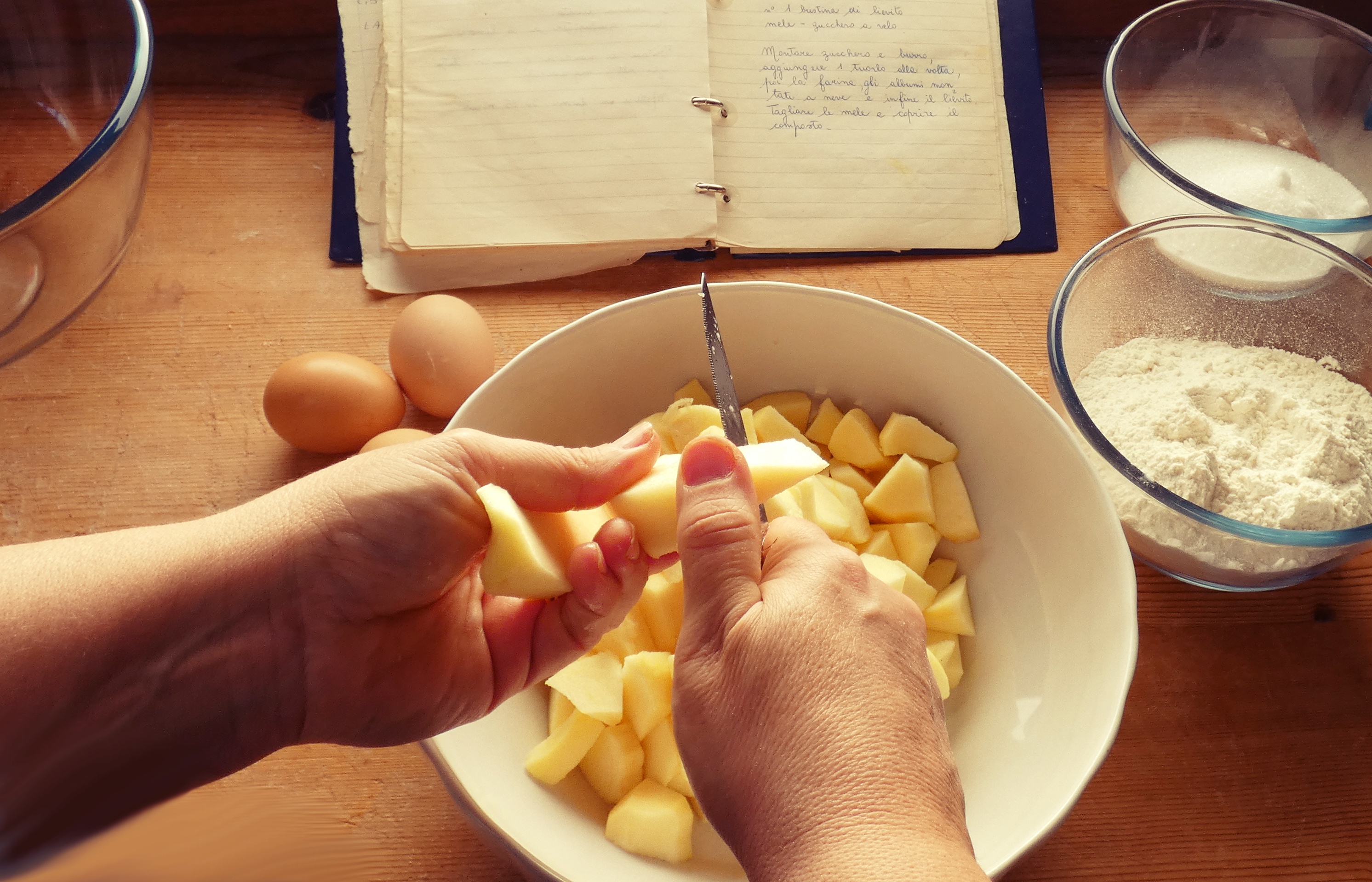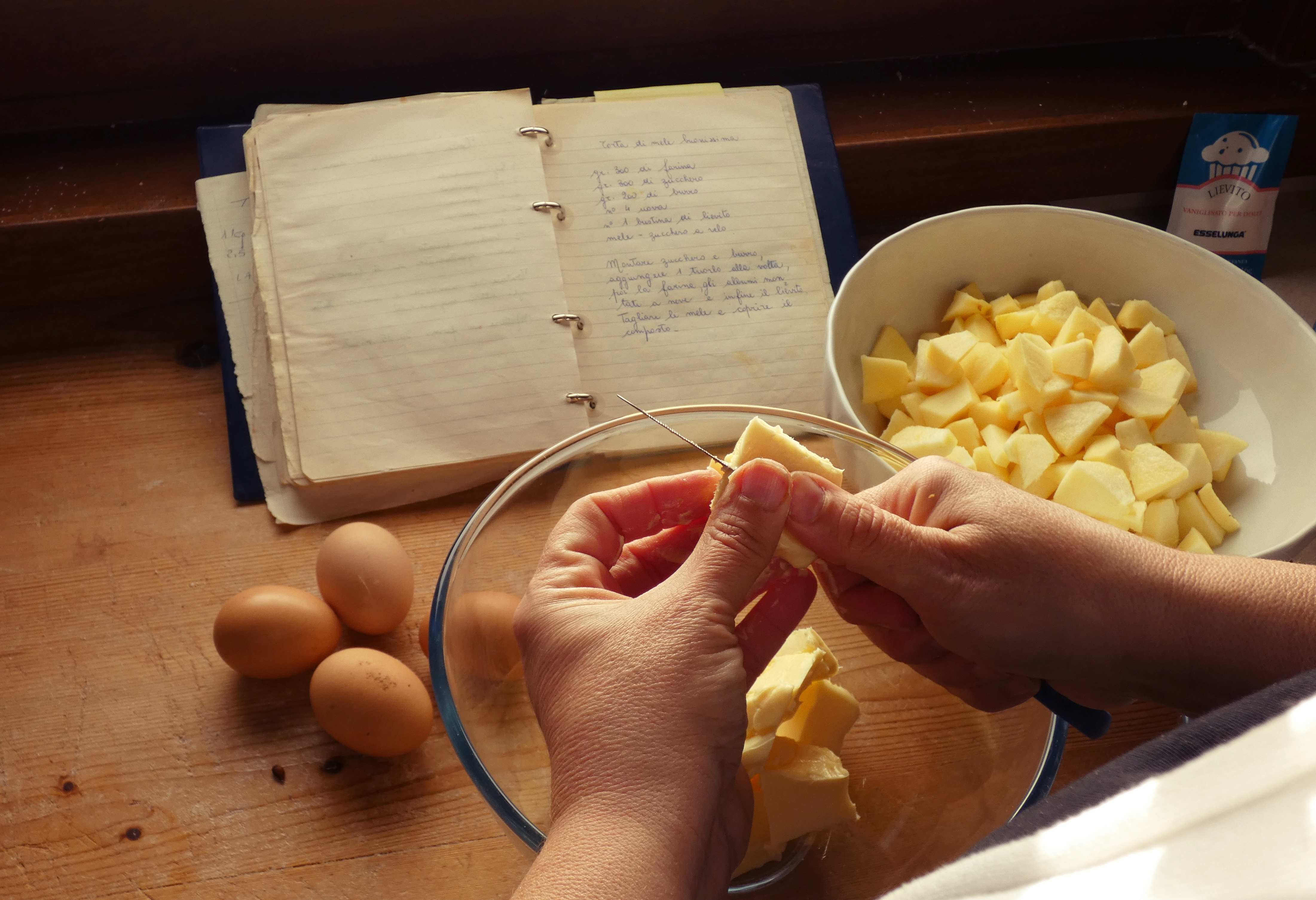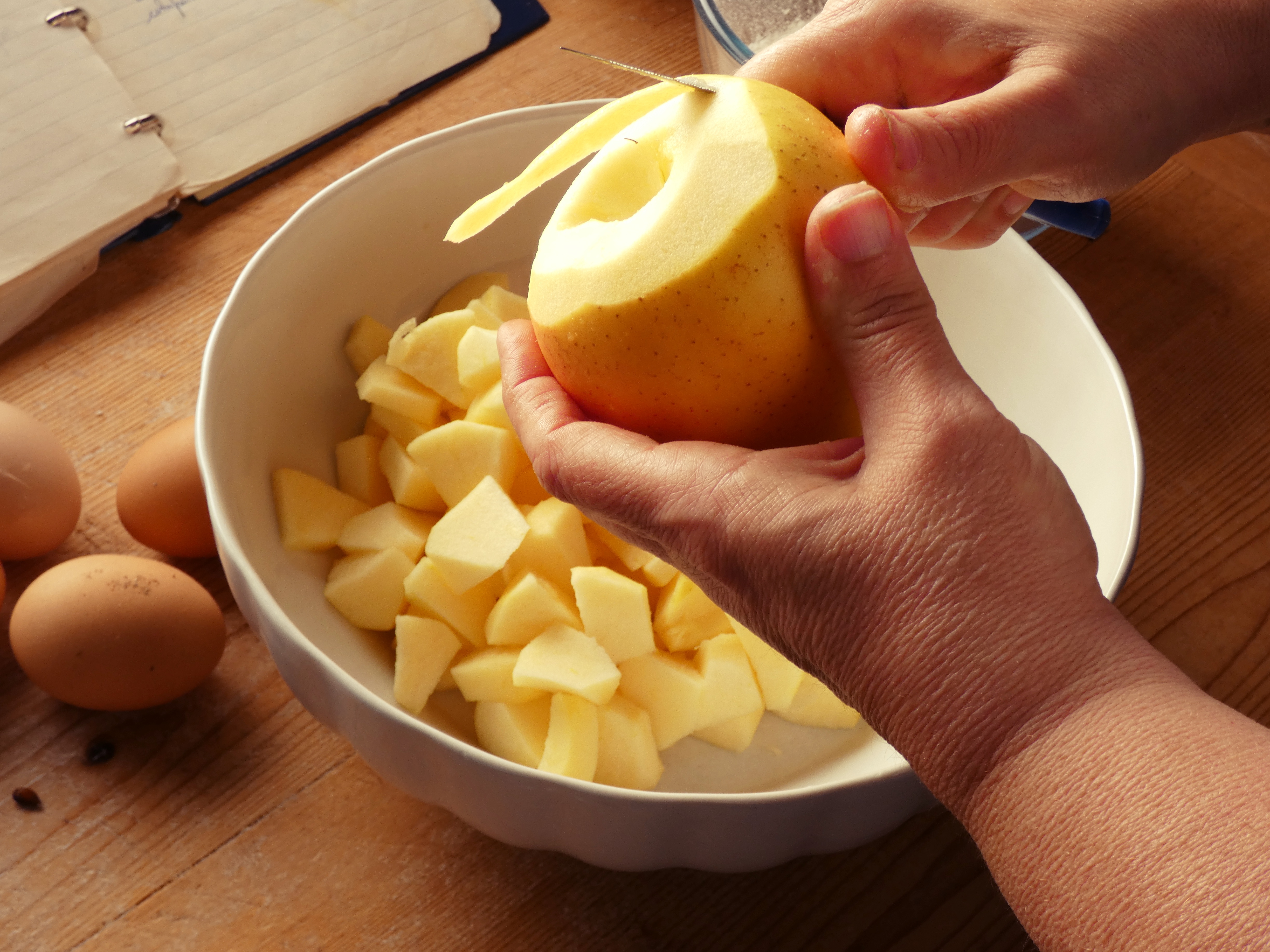 - Uniamo il composto alle mele tagliate a tocchetti e versiamo tutto in una teglia unta e infarinata diametro 26.