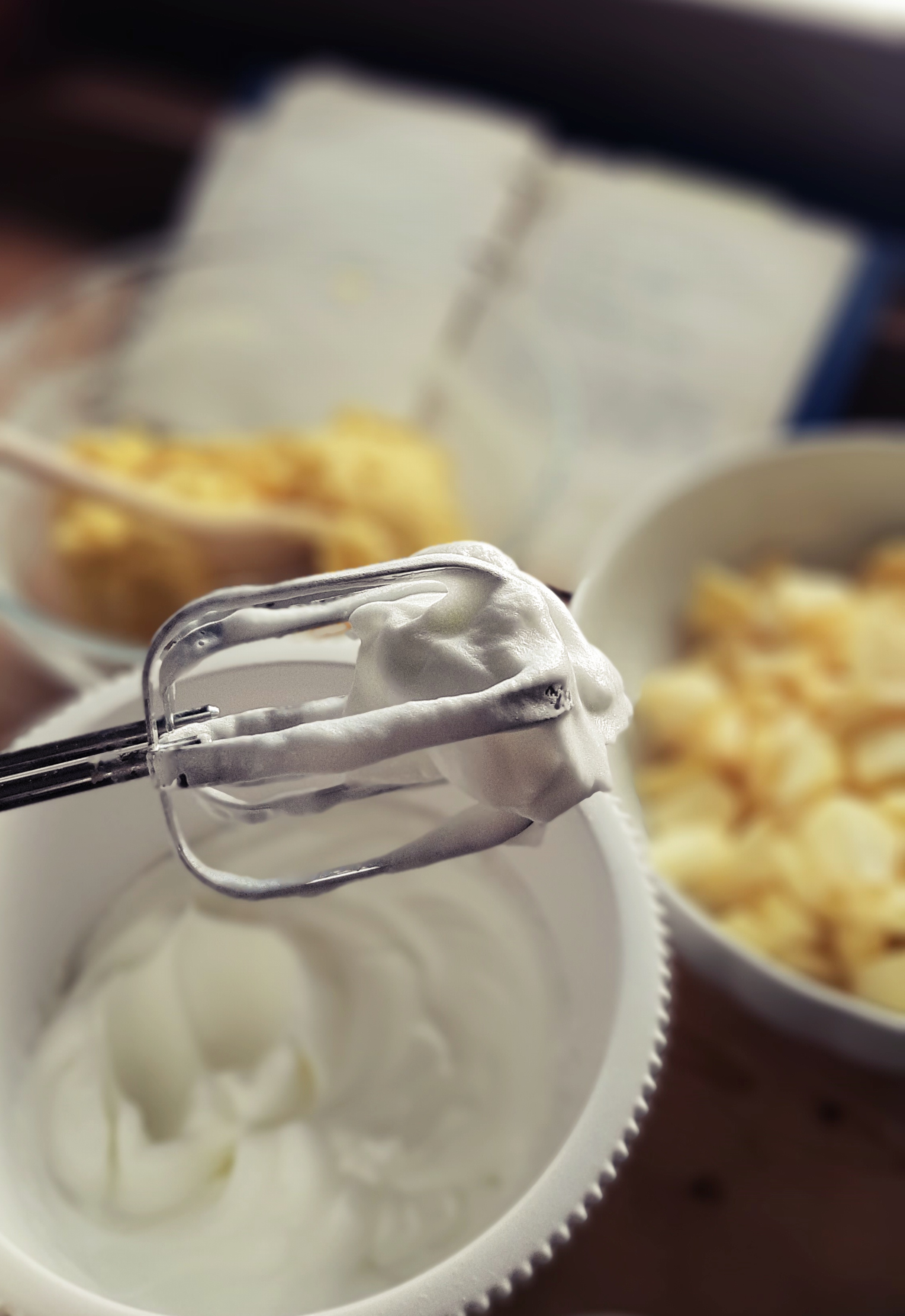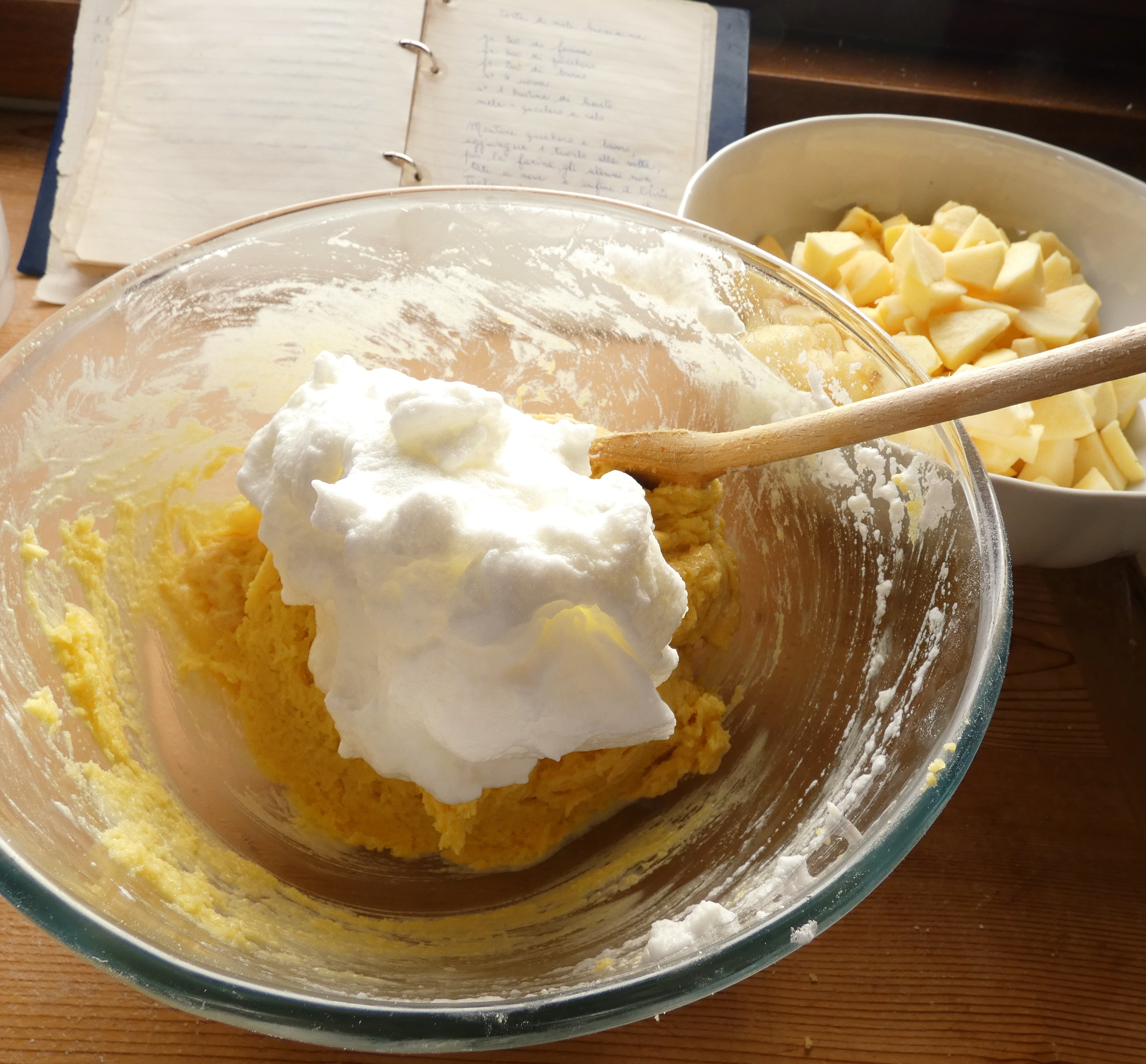 - Montiamo a neve ferma gli albumi e li aggiungiamo in tre passaggi al composto, prima mescolando con il cucchiaio, poi invece con la spatola delicatamente, dall’alto verso il basso.