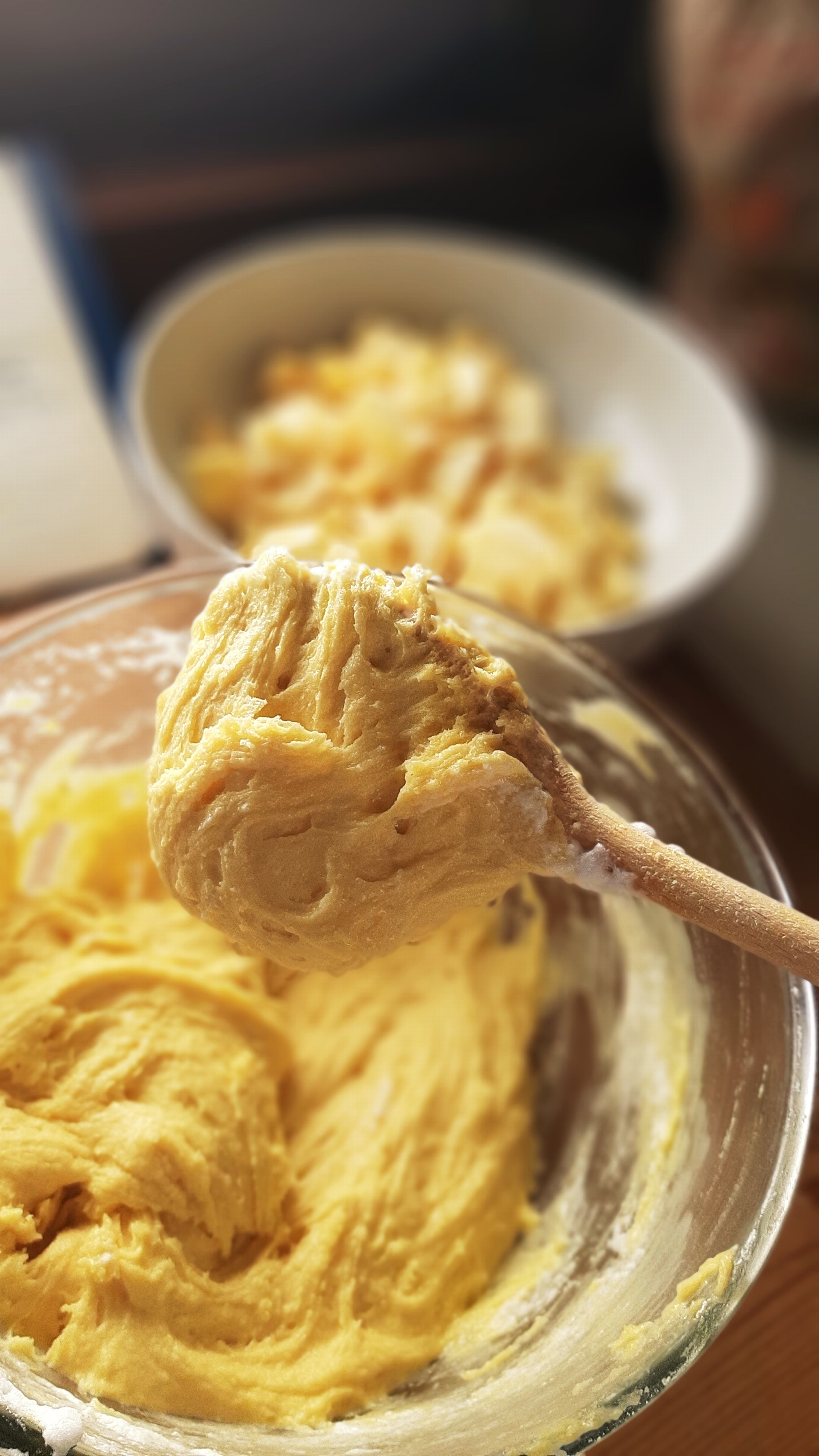 - Dopo aver incorporato tutti i tuorli aggiungiamo la farina con il lievito setacciato per evitare grumi e il pizzico di sale; lavorate in composto con un cucchiaio di legno perché vedrete che risulterà piuttosto compatto (non preoccupatevi, deve essere così)