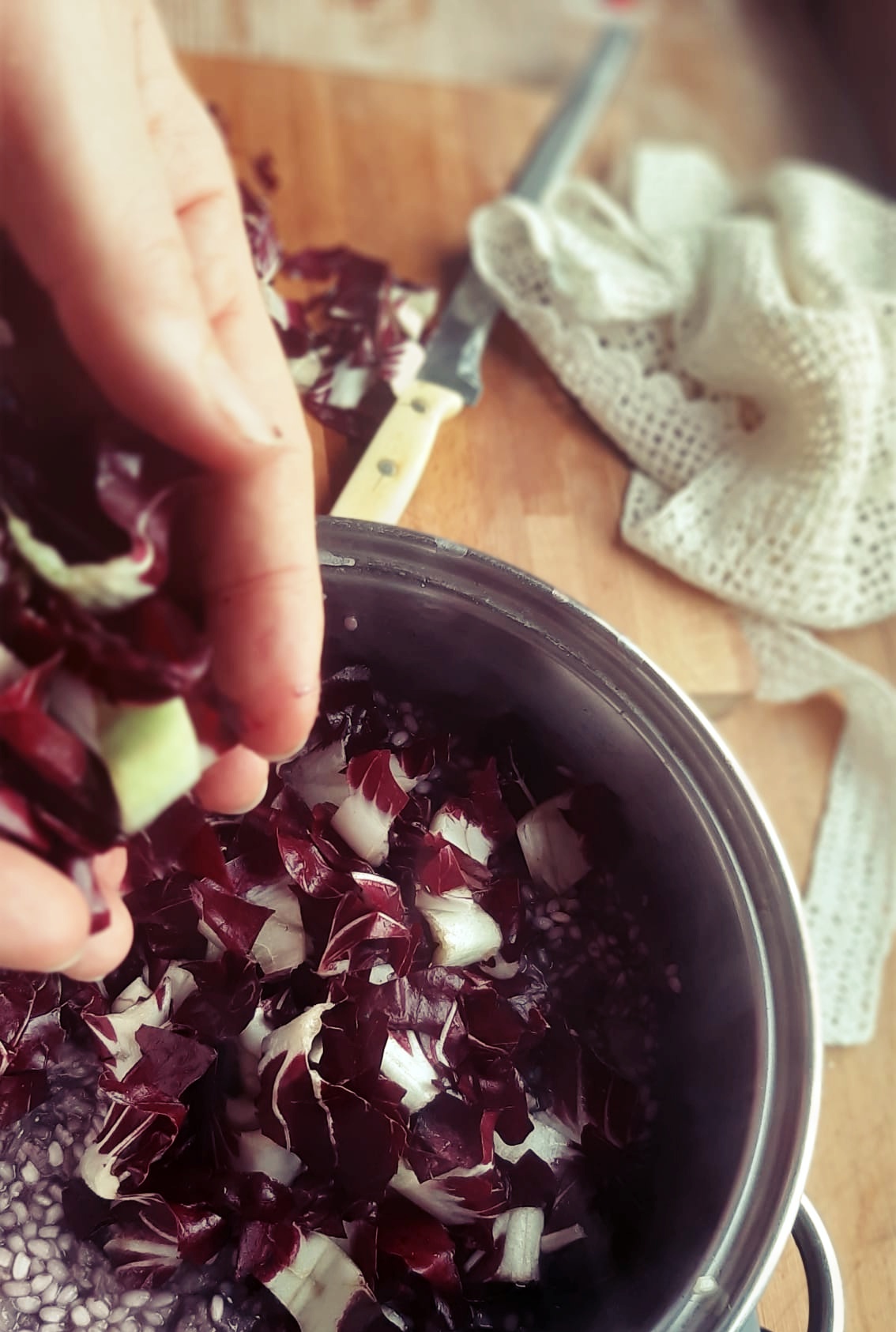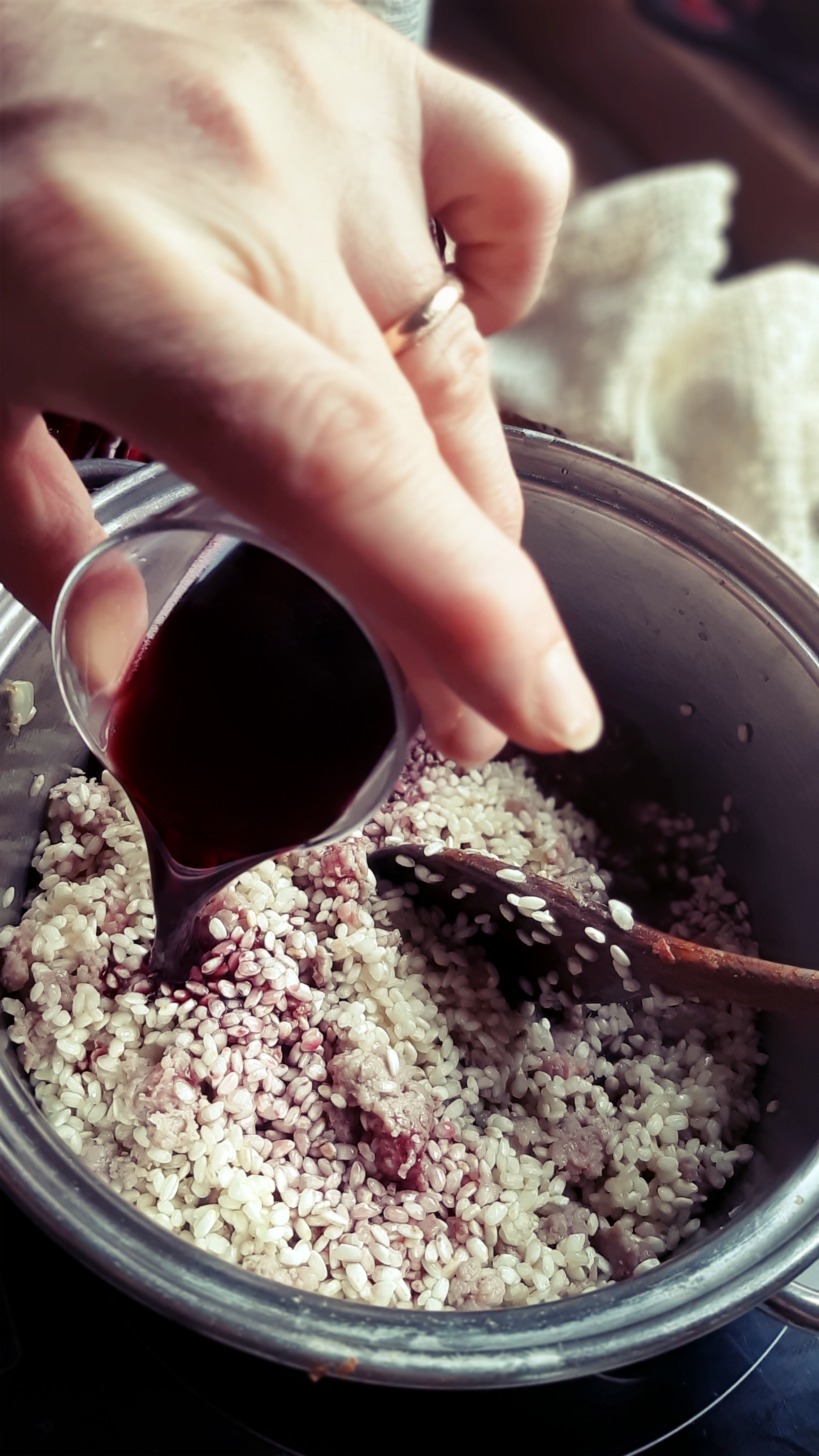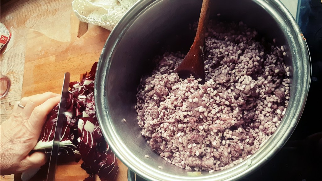 Dopo aver fatto rosolare un po’ la carne da salame, aggiungiamo il riso e facciamolo tostare e aggiungiamo un pizzico di sale grosso; dopo la tostatura, sfumiamo il tutto con il vino rosso e, una volta evaporata la parte alcolica, cominciamo ad aggiungere uno o due mestoli di brodo caldo. Mescoliamo il risotto delicatamente, senza esagerare e passati circa 5 minuti aggiungiamo il radicchio che avremo lavato e tagliato a listarelle non troppo sottili.
