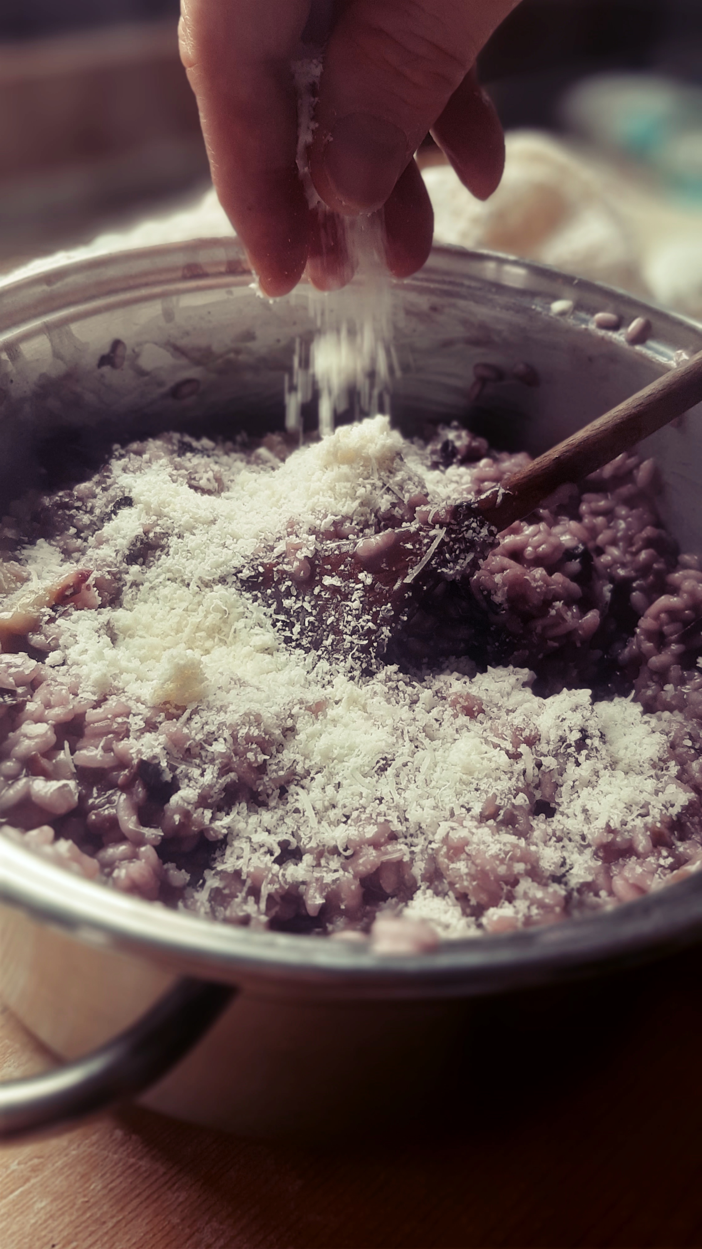 Portiamo a cottura aggiungendo ogni tanto un mestolo di brodo; quando il riso sarà cotto, spegniamo sotto il fuoco e mantechiamo con una noce di burro e abbondante Parmigiano Reggiano grattugiato.