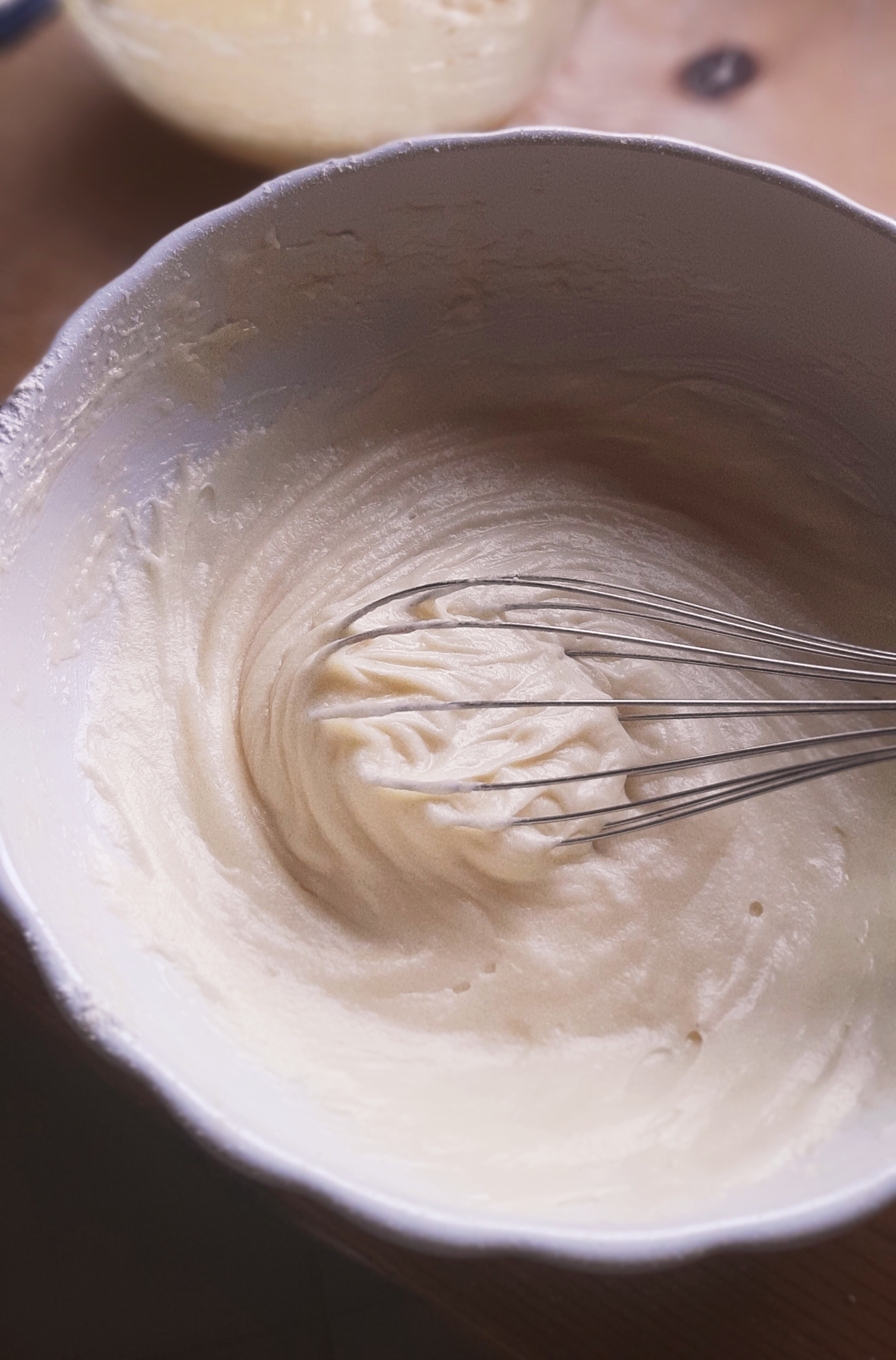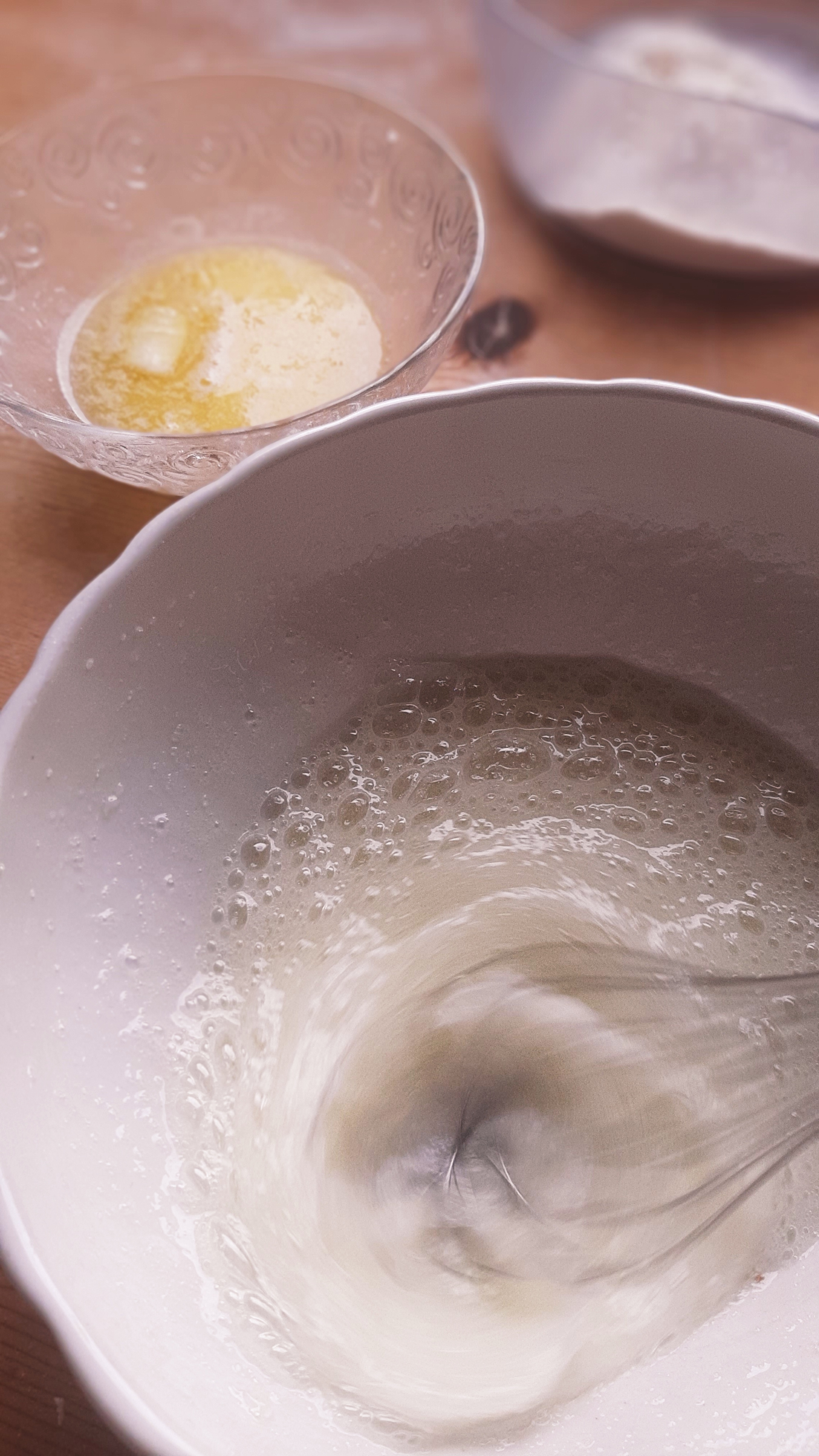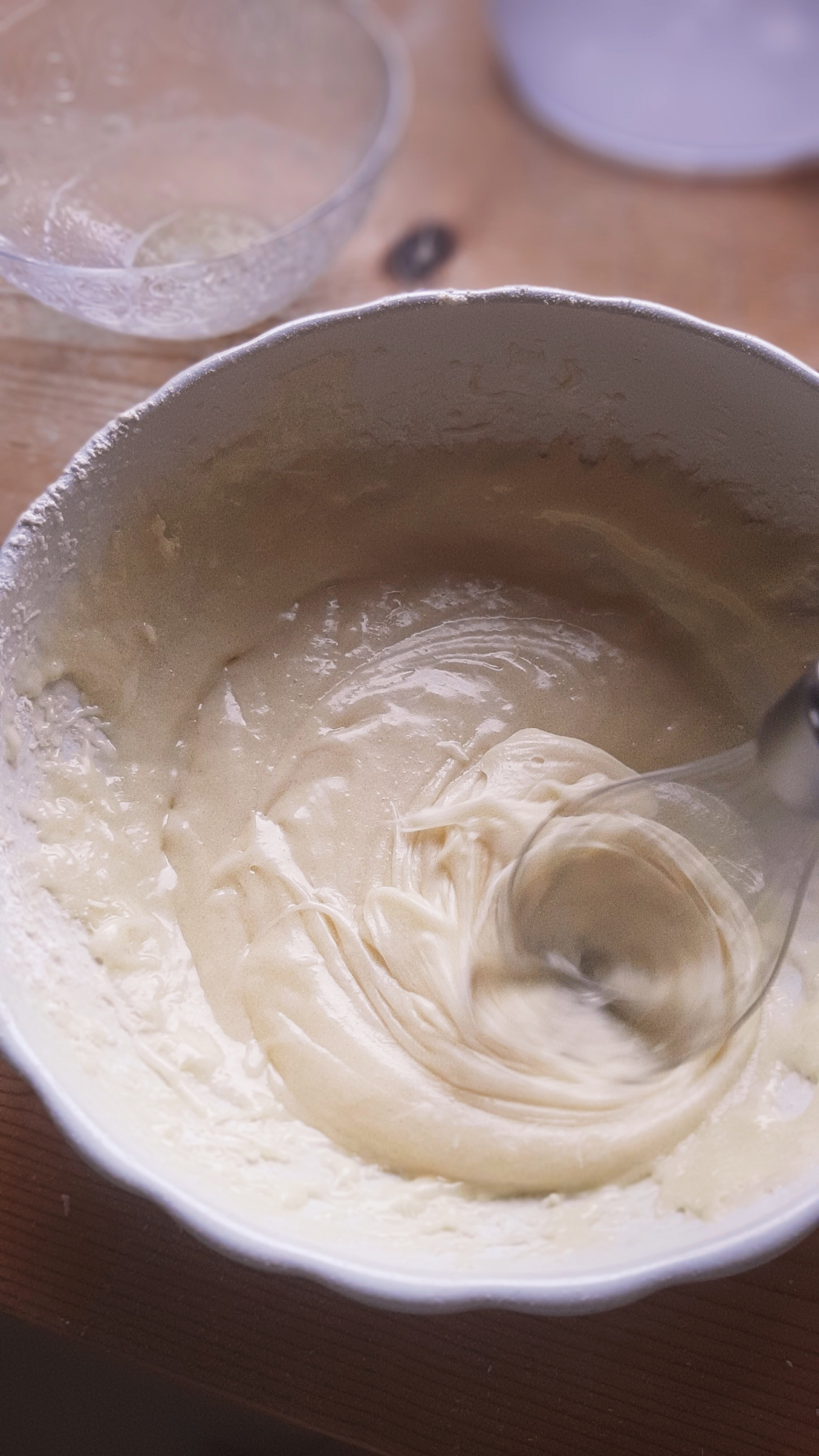 - Mettiamo lo zucchero negli albumi e montiamo leggermente, poi aggiungiamo il burro fuso e per ultimo la farina, fino ad ottenere un impasto bello omogeneo.