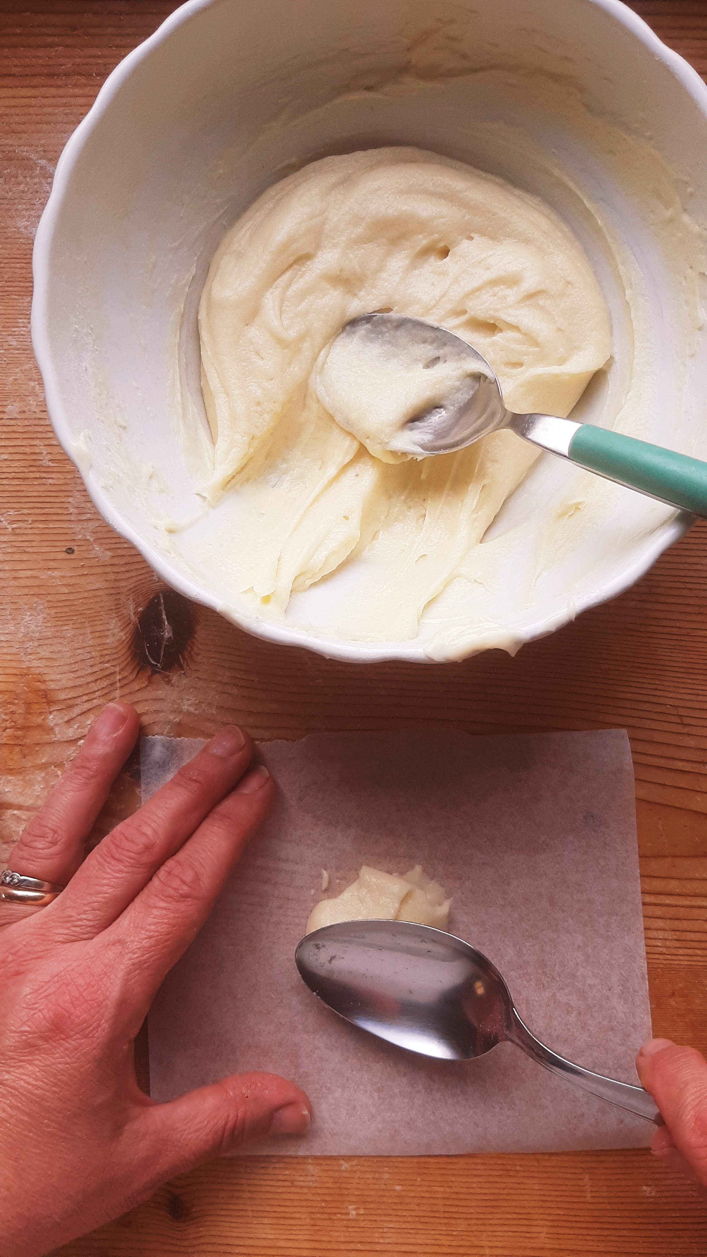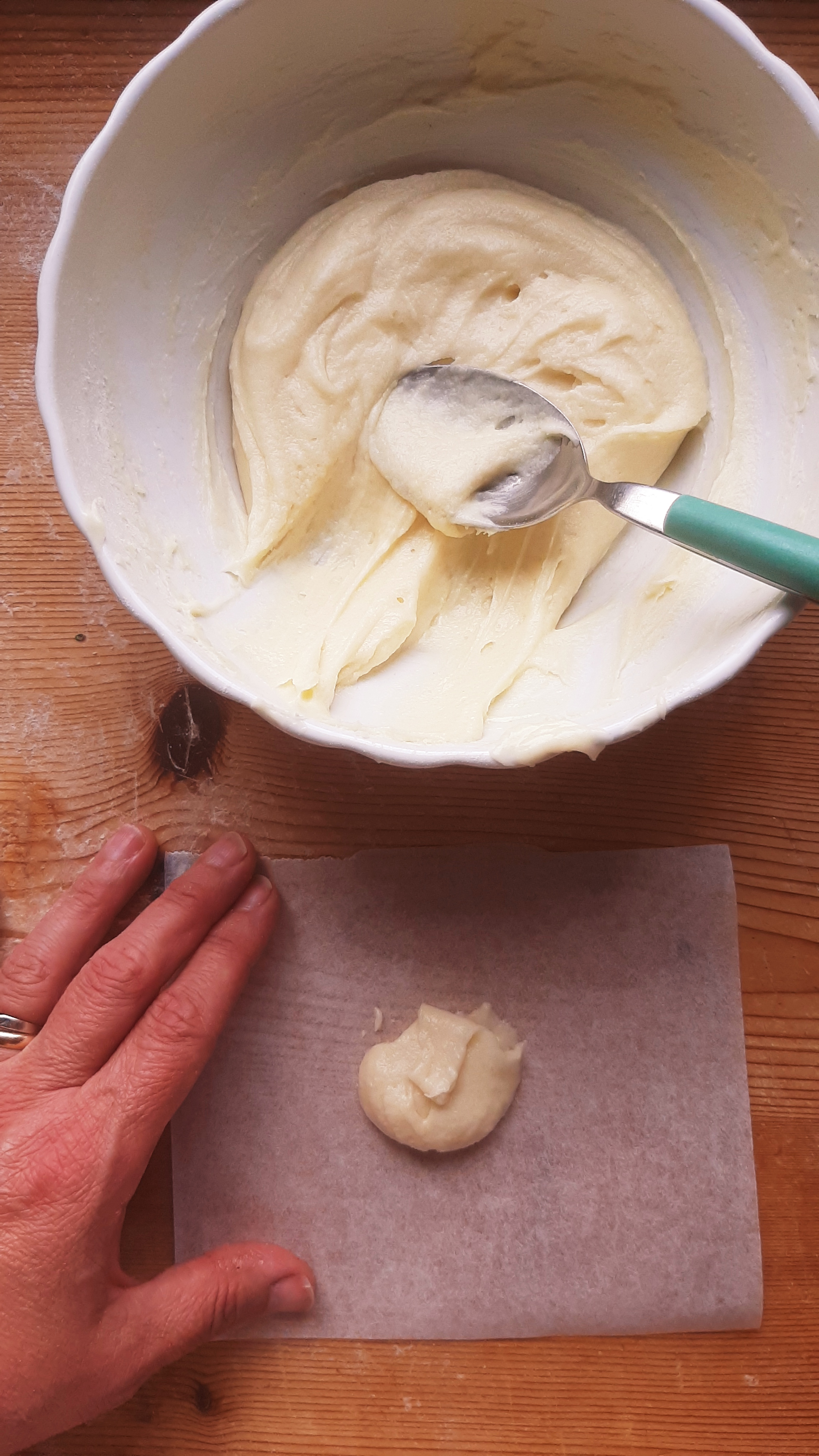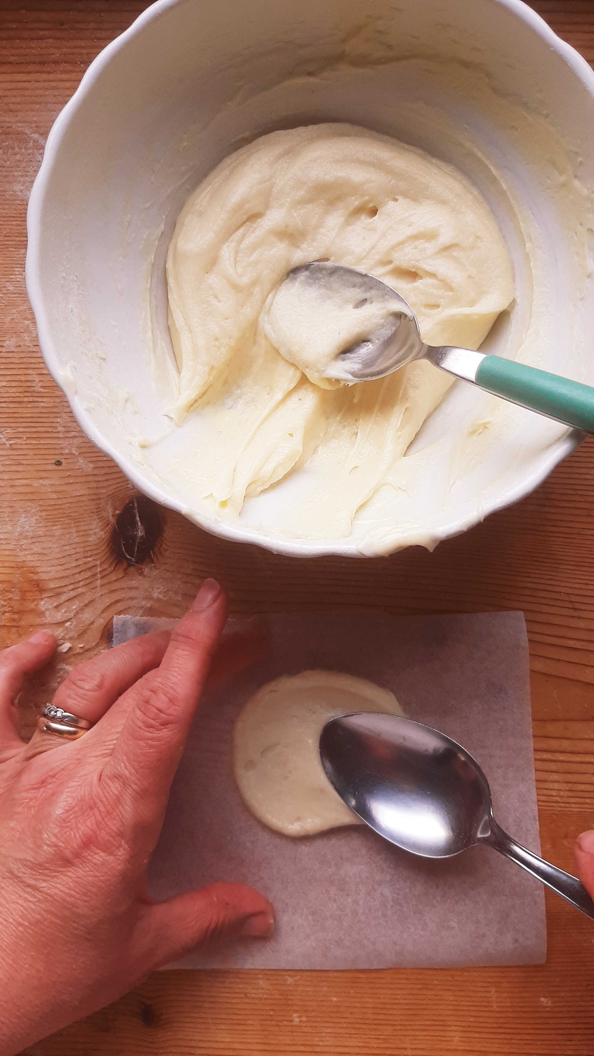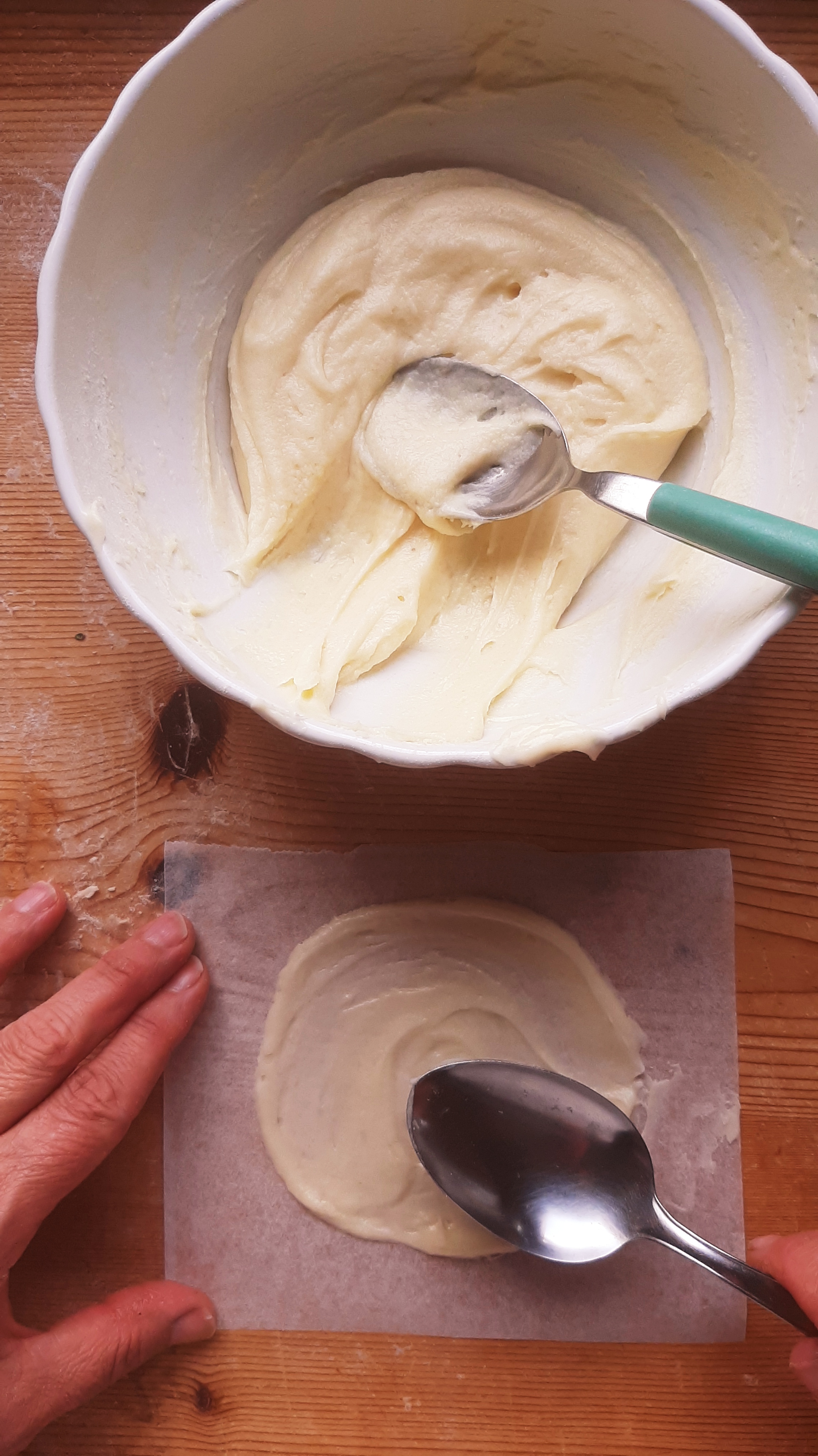 - Se volete invece fare qualche cialda rotonda o la classica a forma di “lingua di gatt” o “tegola” basta mettere un po’ di impasto e spatolarlo leggermente in verticale; in questo caso molto più semplice perchè non bisogna modellarli una volta cotti.